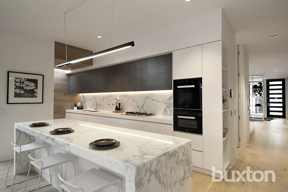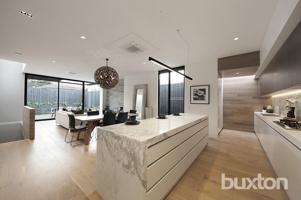 With marble hearth gas-fires for each main living zone, the home features designer pendant lighting throughout, streamlined cabinetry including a glossy entertainment unit and Roger Seller fittings for the minimalist bathroom and laundry areas. A massive 3m Victorian Ash pivot entry door opens onto it all and sculptural "floating" stairways link the levels.