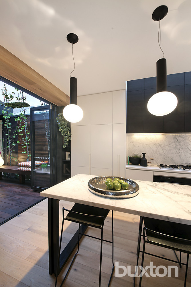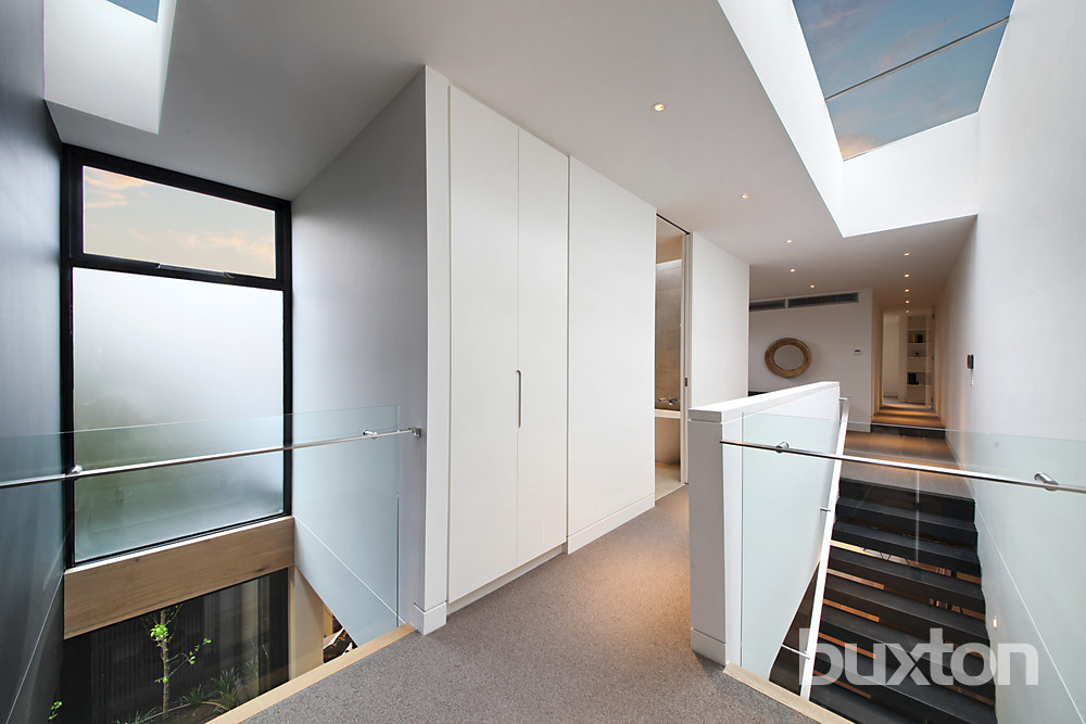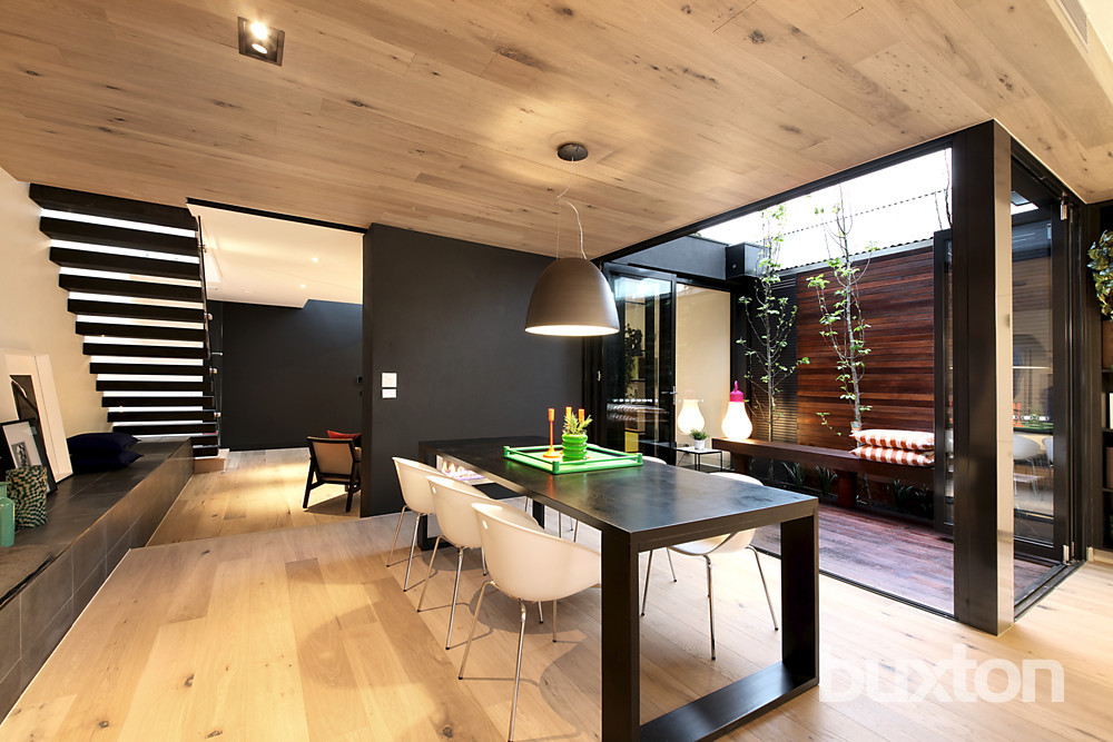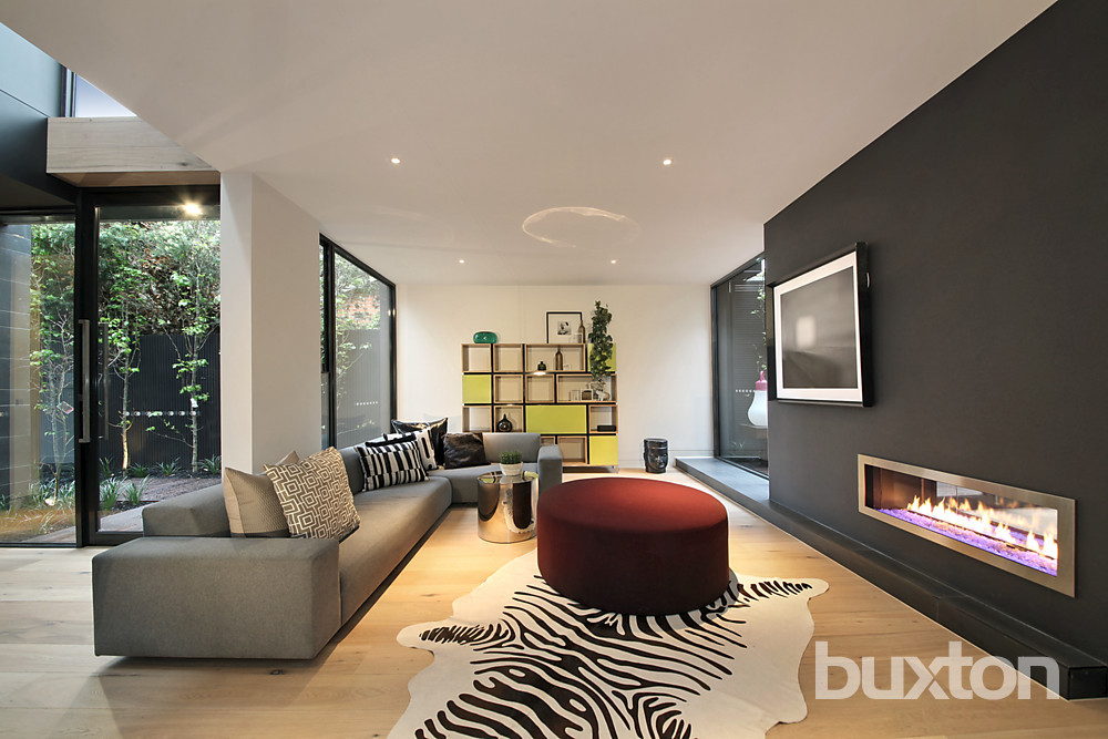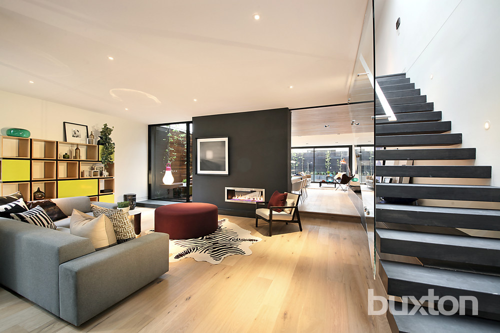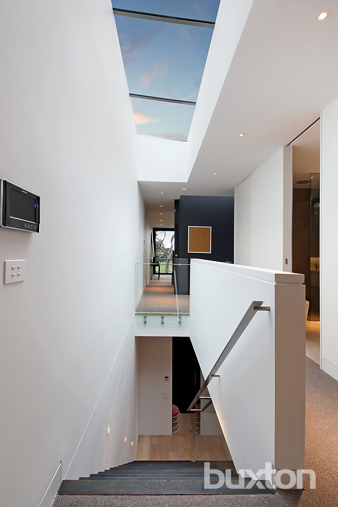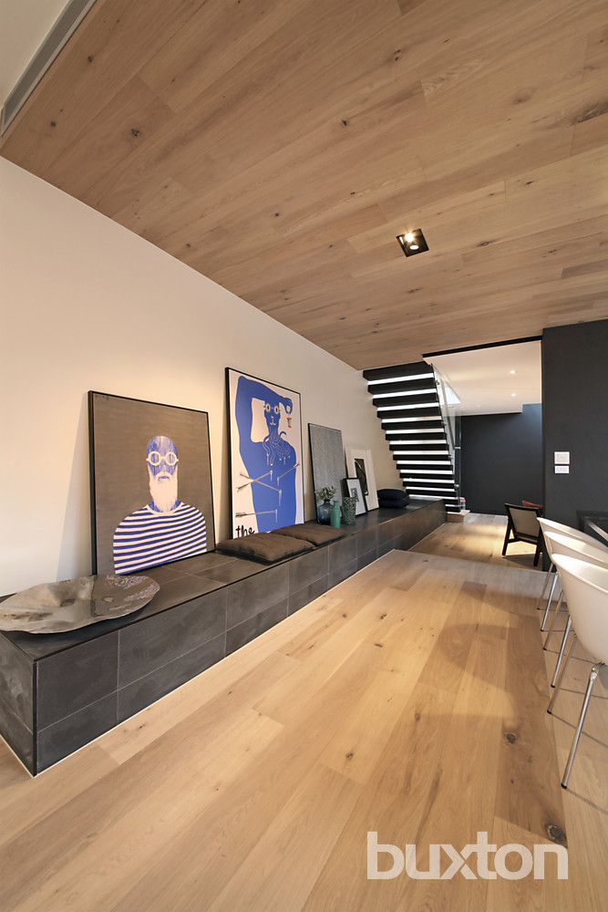 Set to surprise with distinctive detail across a triple zone floorplan, the home opens wide to a soaring void (lit by a rectangular skylight), steps back to a formal space (featuring a sparkling crystal gas-fire), flows out to an airy casual zone (seamlessly encompassing a bi-fold-wrapped atrium) ...and steps up a fully-cantilevered "floating" stairway to a quiet first-floor lounge.