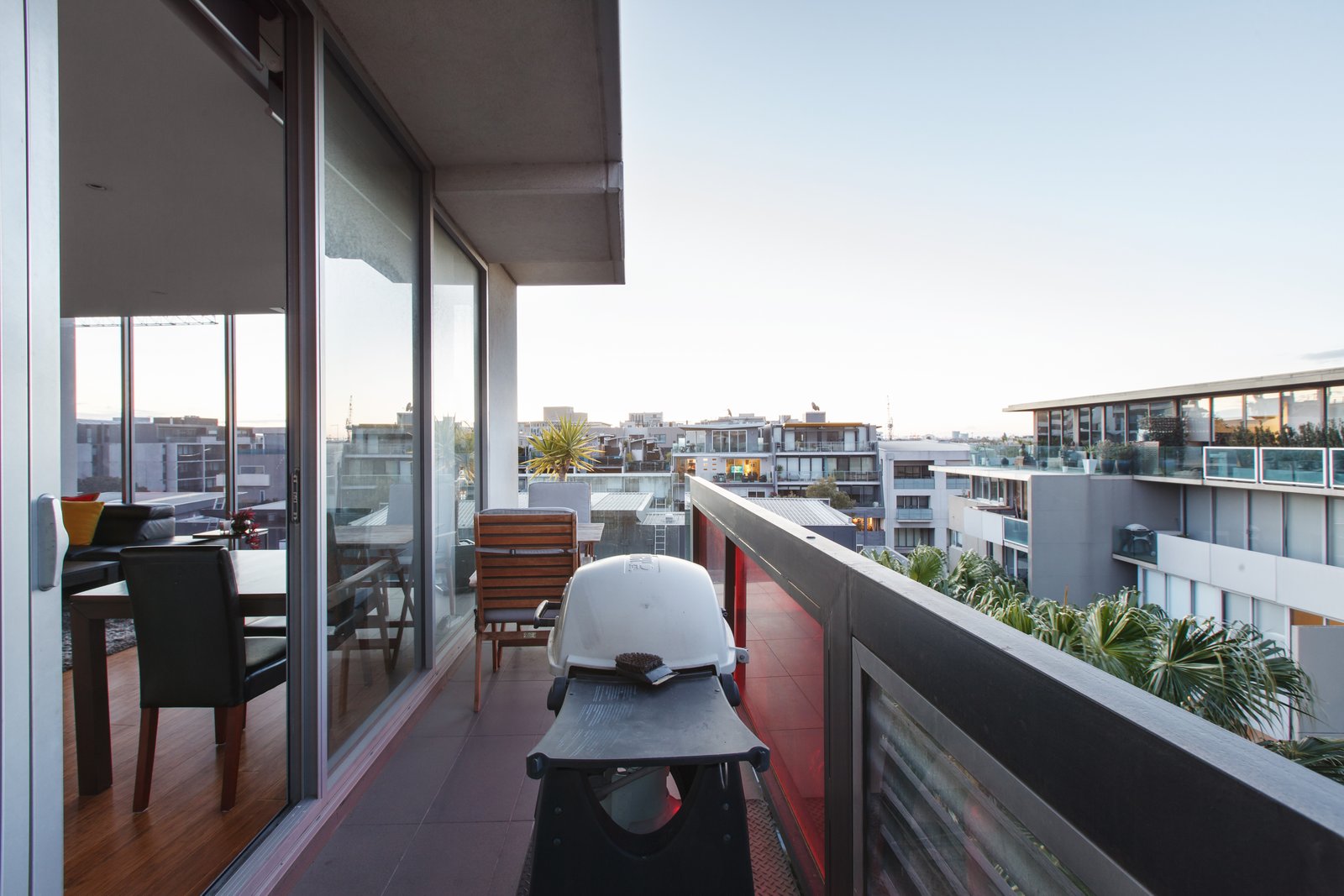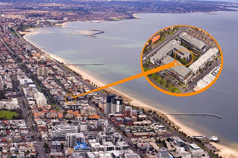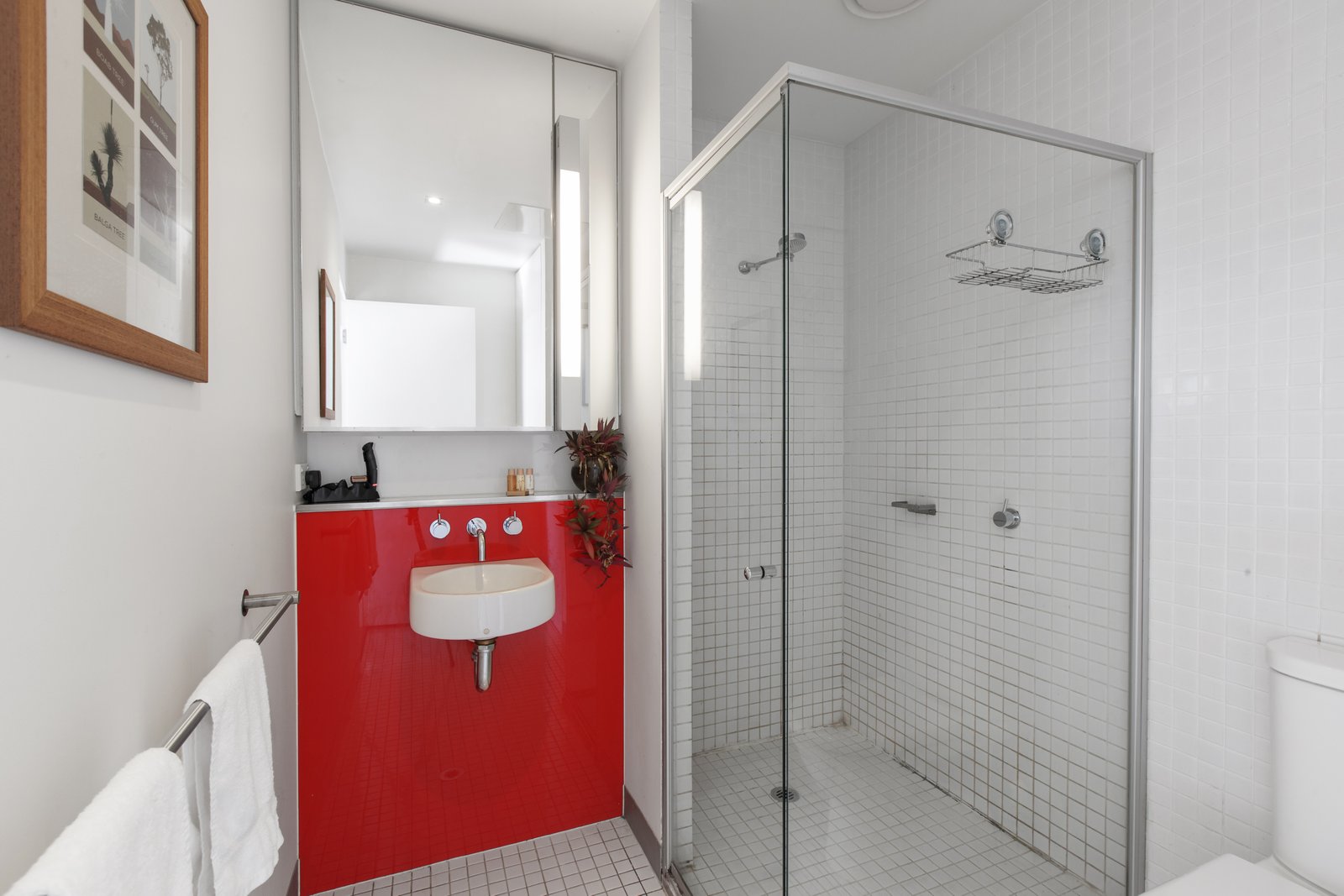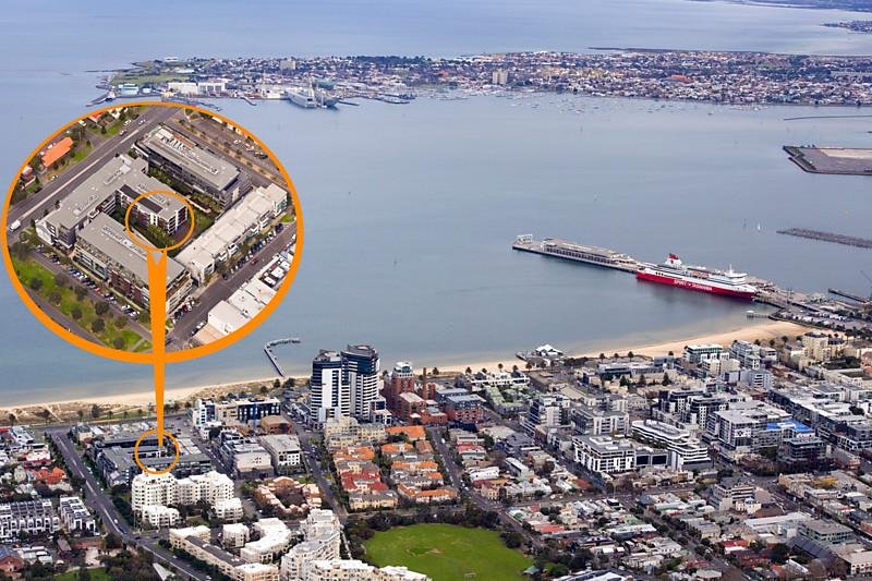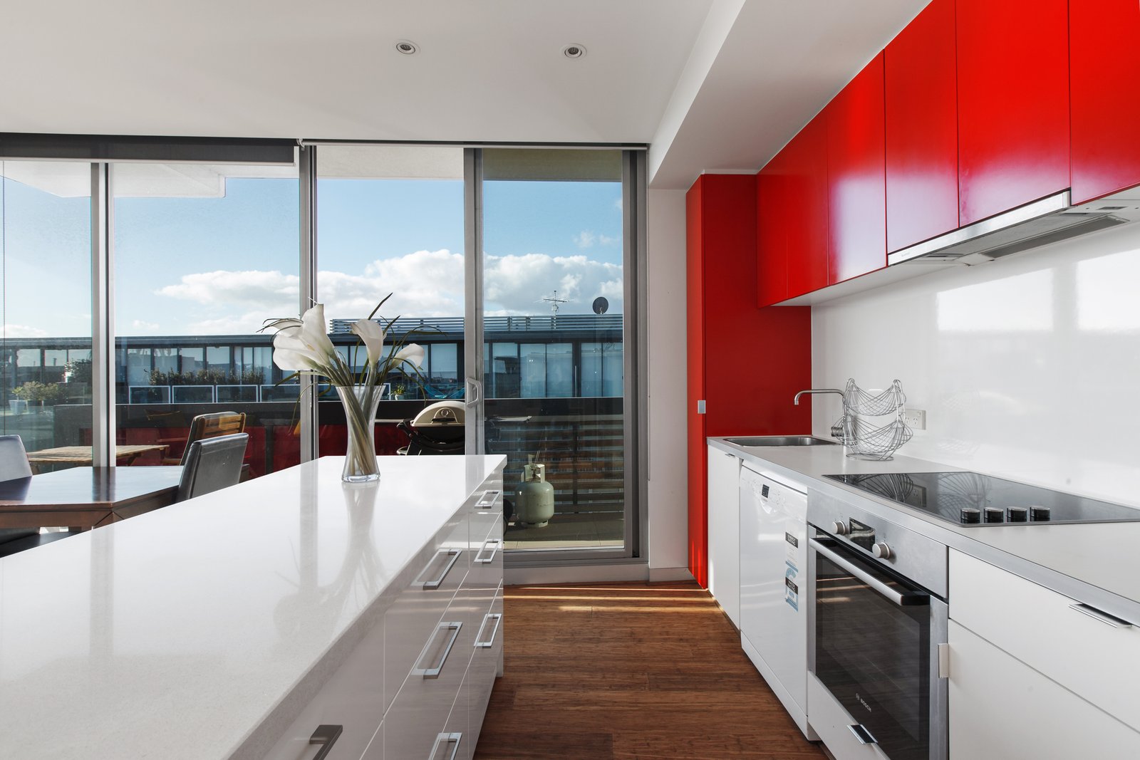 Located a block back from the iconic Port Melbourne Beach, the Pop Art facade of the “Splash” building provides a captivating entrance to this chic and contemporary 2 bedroom apartment. Permeated by a gardenlike tranquillity, this top floor residence combines glimpses across the bay to Williamstown and easy city access to create the perfect urban oasis. Inside the apartment, a clean, primary-based colour palette features splashes of vibrant red and combines with striking timber-laminate flooring to imbue the space with a soothing, stylish aesthetic.