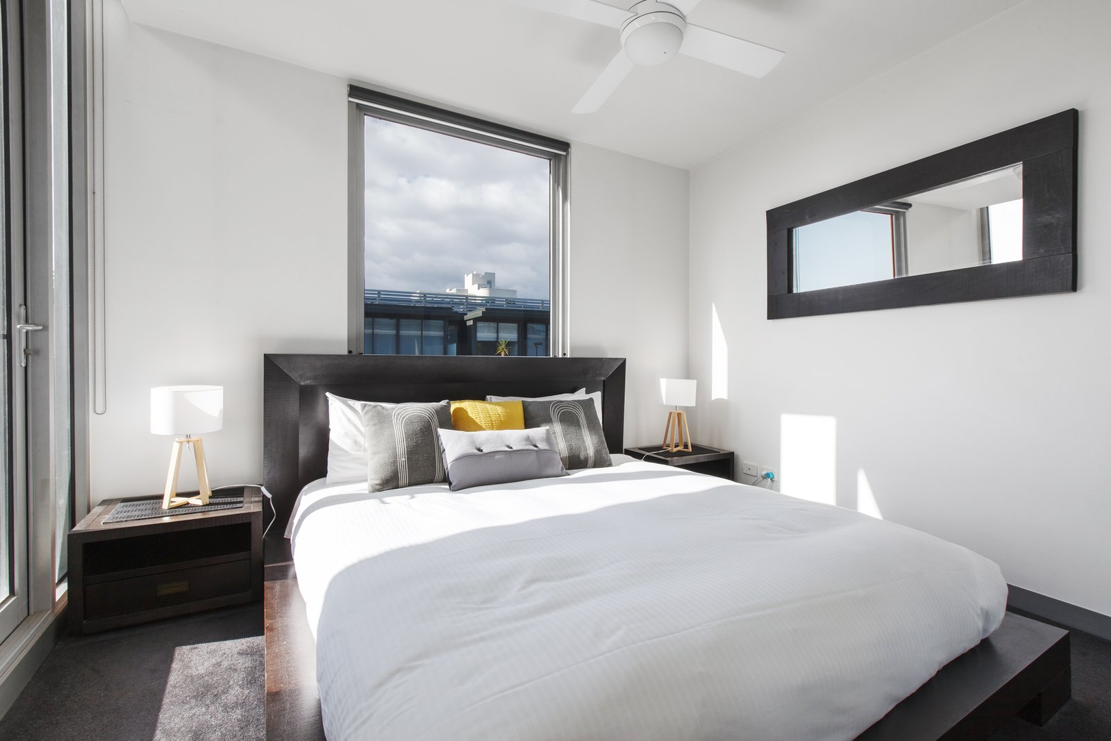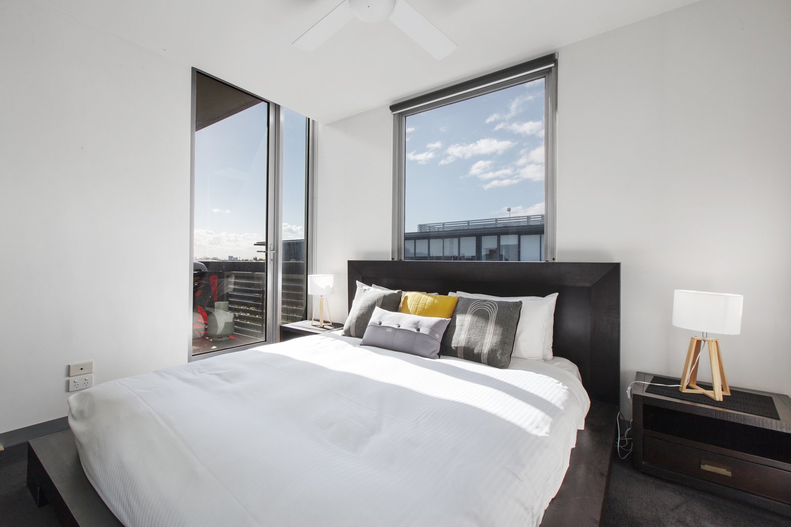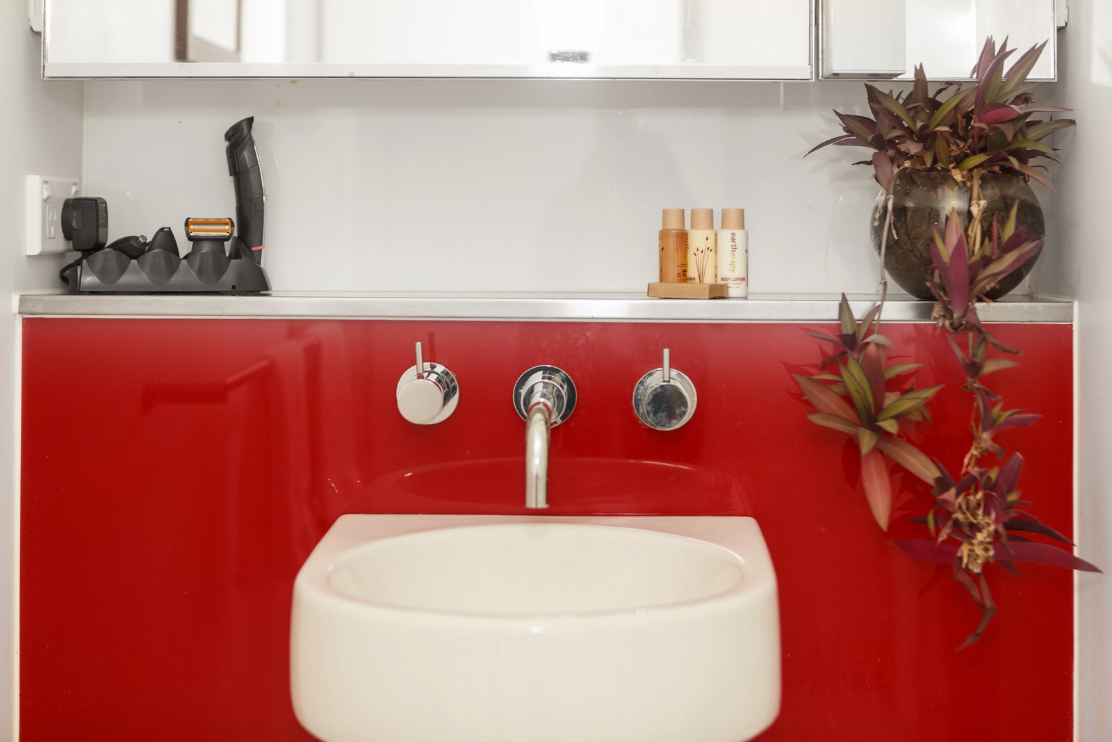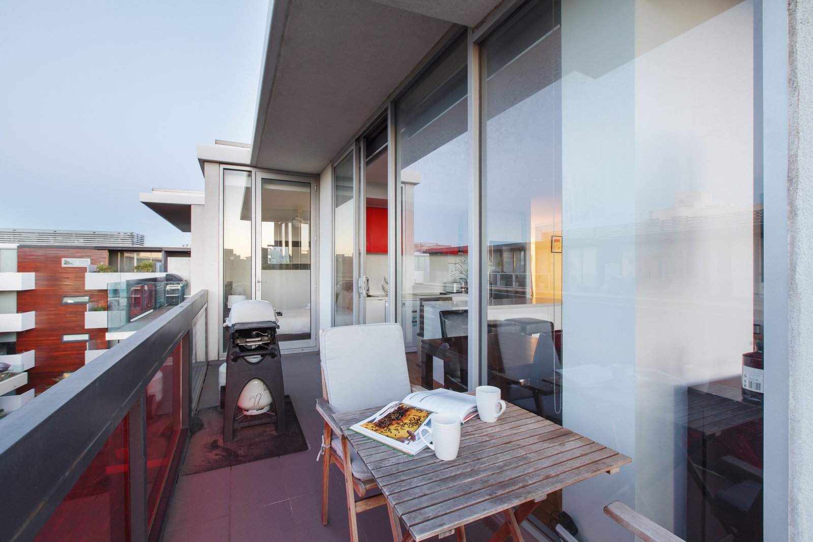 Located a block back from the iconic Port Melbourne Beach, the Pop Art facade of the “Splash” building provides a captivating entrance to this chic and contemporary 2 bedroom apartment. Permeated by a gardenlike tranquillity, this top floor residence combines glimpses across the bay to Williamstown and easy city access to create the perfect urban oasis. Inside the apartment, a clean, primary-based colour palette features splashes of vibrant red and combines with striking timber-laminate flooring to imbue the space with a soothing, stylish aesthetic.