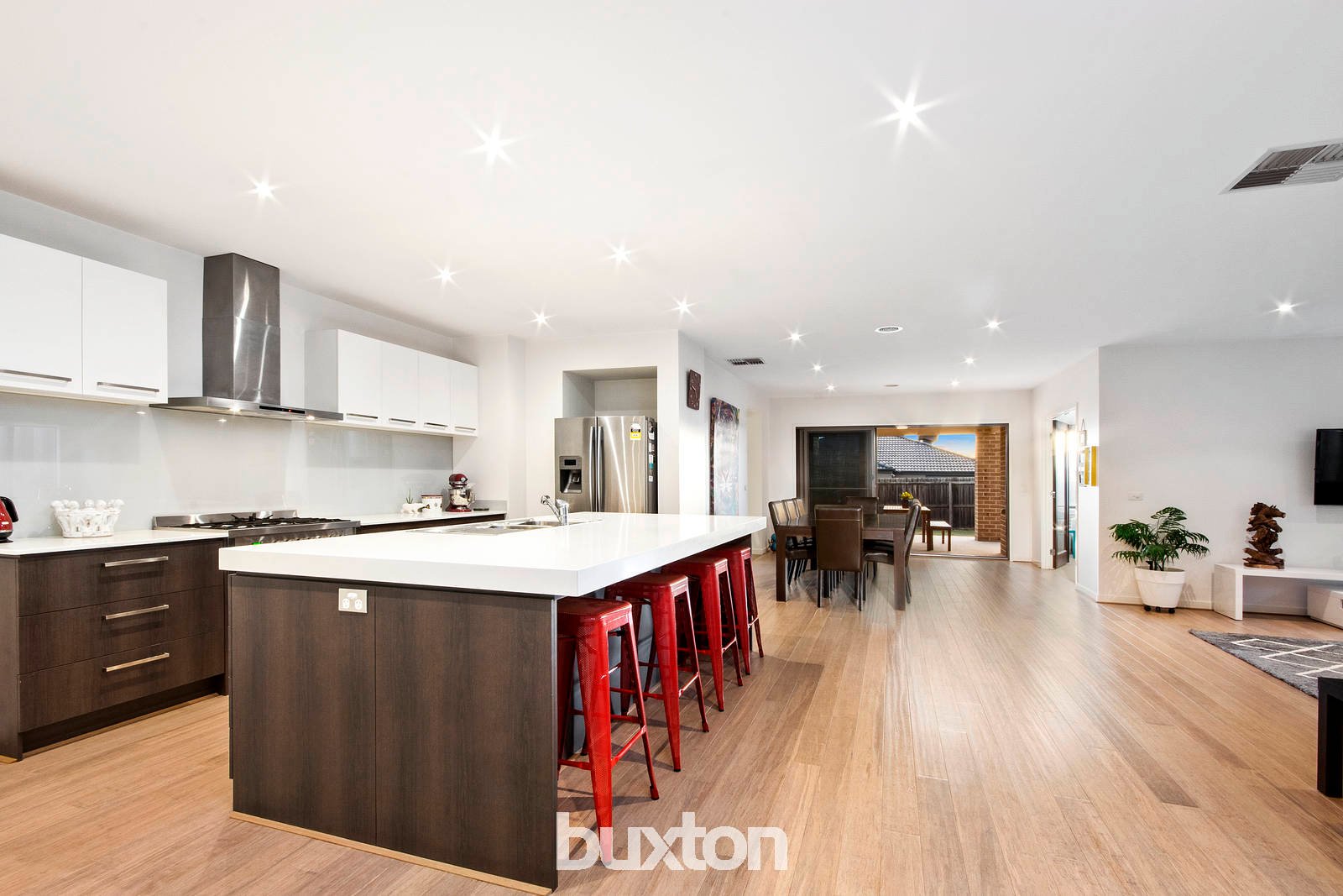 The grand hallway will lead you to the impressive open plan kitchen, living and dining area. The stunning kitchen is fit for any aspiring master chef featuring stone bench tops, stainless steel appliances and so much cupboard space. This overlooks the dining and massive living area, truly a great design for entertaining. In addition, there is a second separate rumpus area providing for easy daily living.