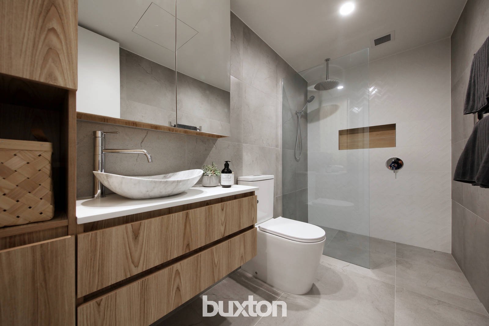 Customised with floating rain showers for the fully tiled bathrooms (multiple ensuites) and bespoke cabinetry including robes for every bedroom, the home has stone benchtops in the streamlined Ilve kitchen, a designer balustrade staircase and engineered timber floors.