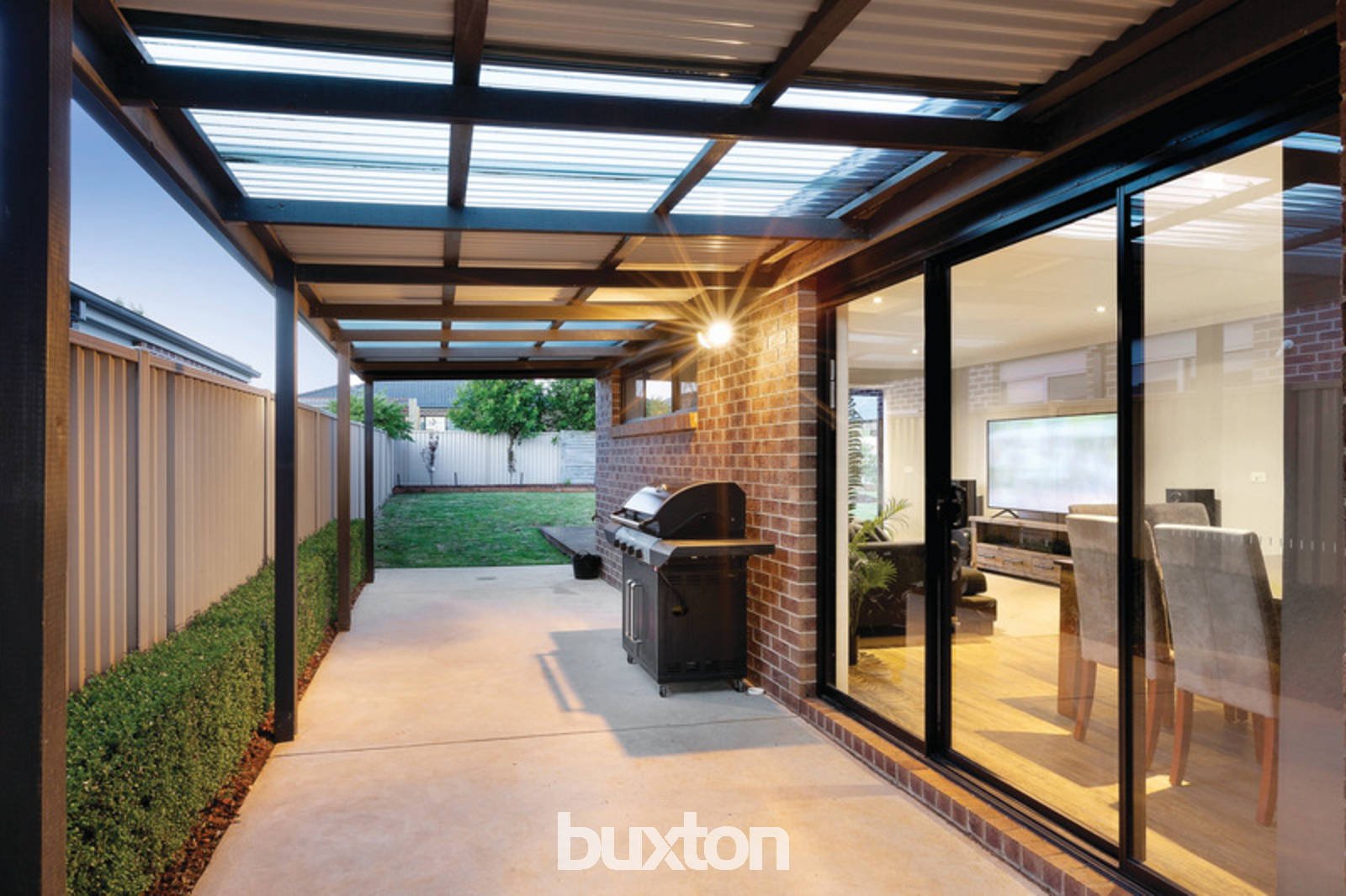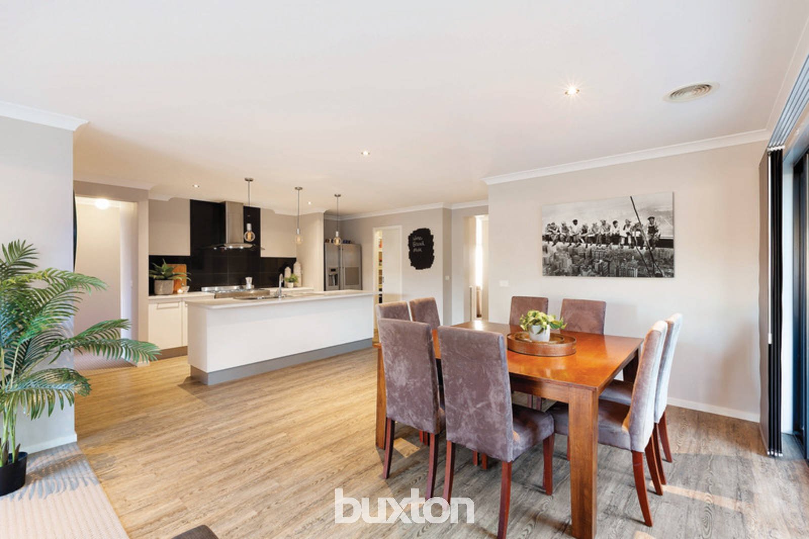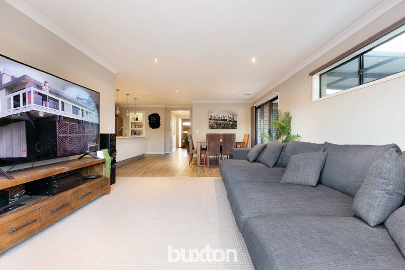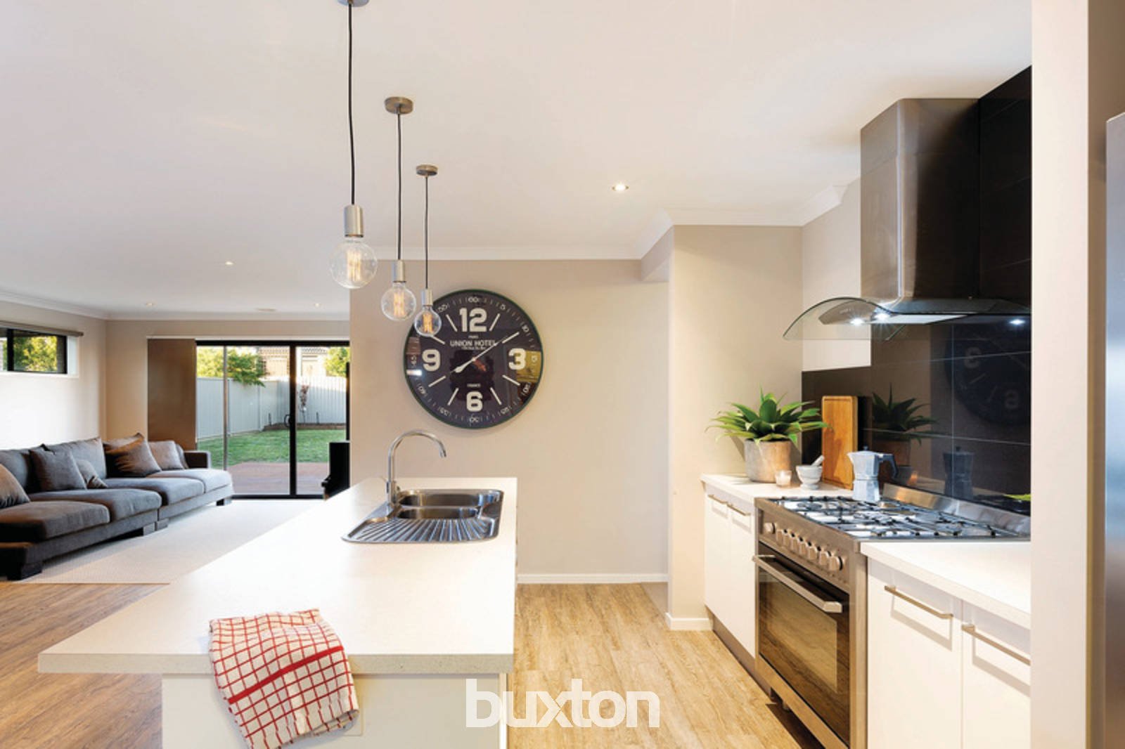The stylish kitchen features stainless-steel dishwasher and 900mm gas cook-top. The open plan living area flows into the outdoor alfresco and wooden decked entertaining area, overlooking the spacious landscaped backyard.