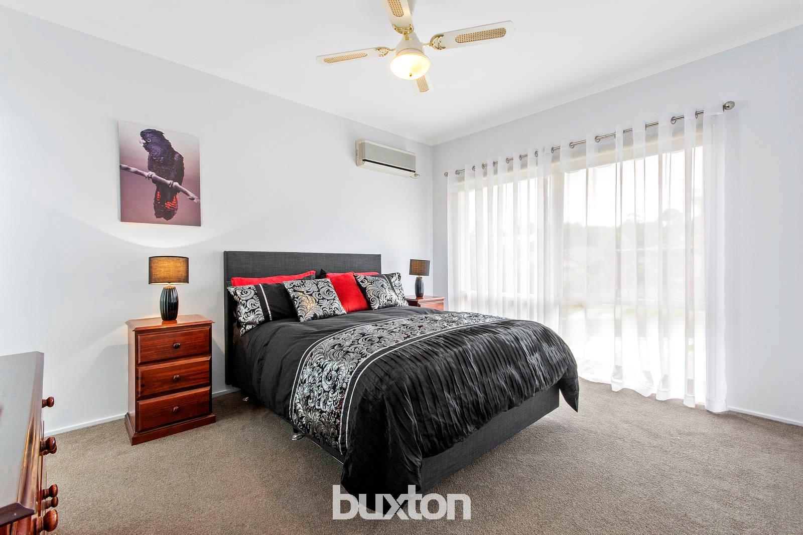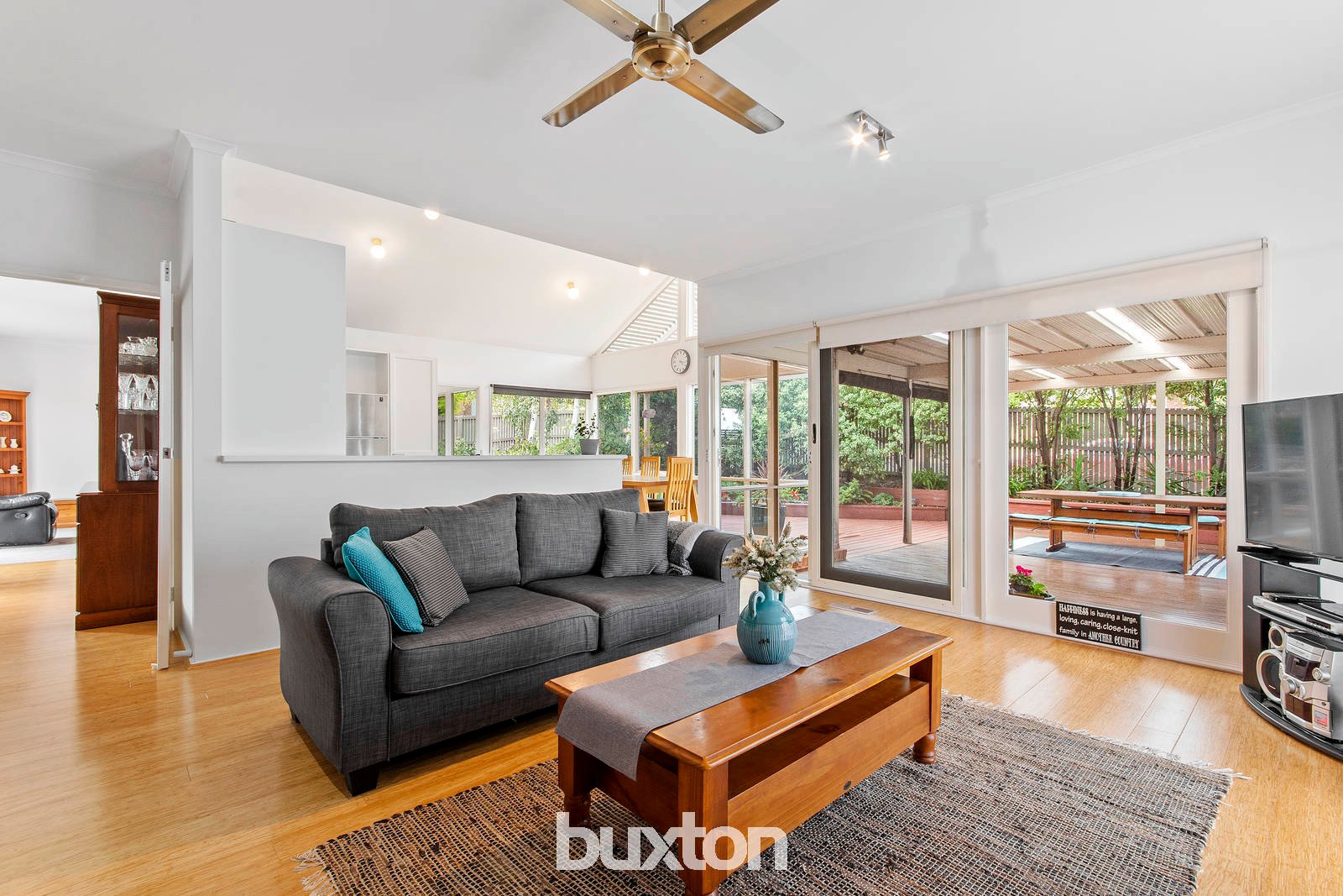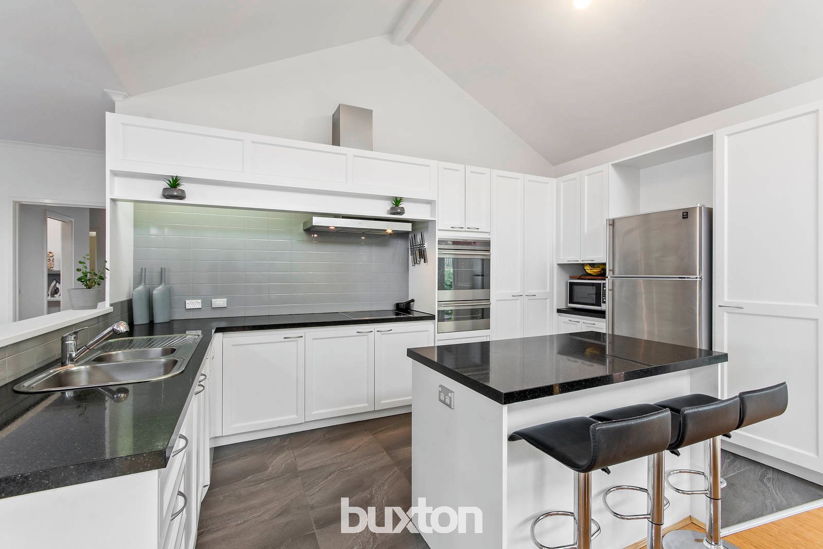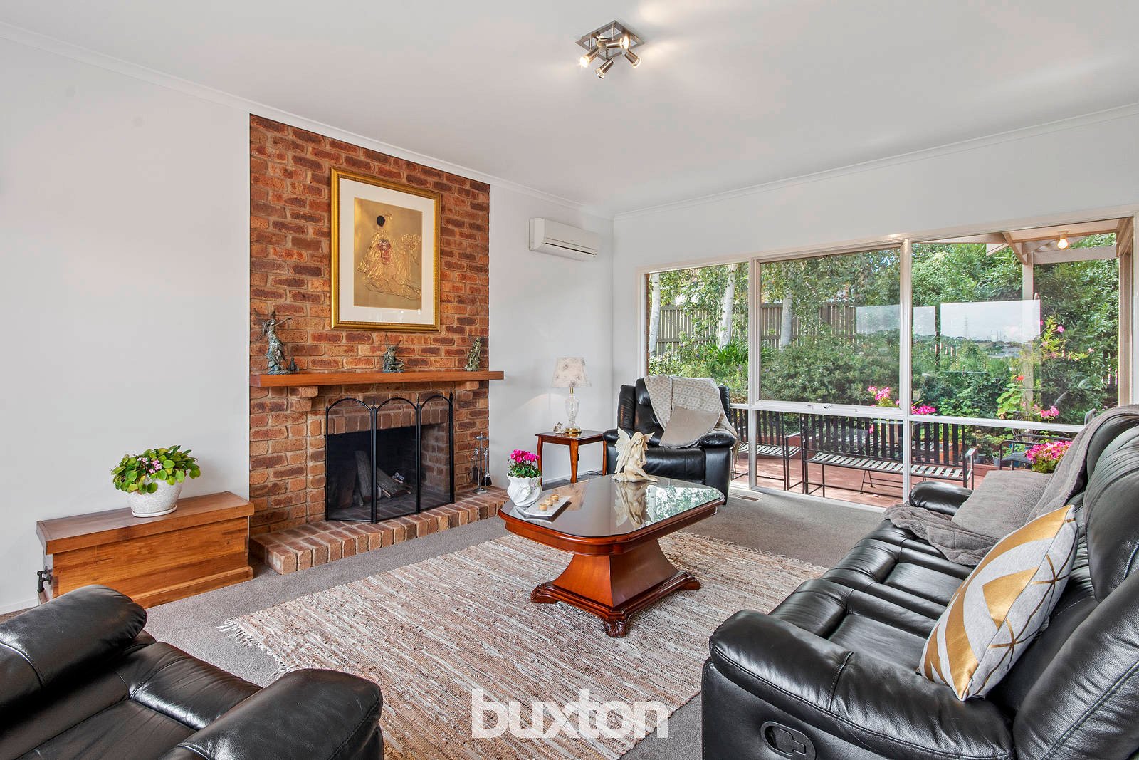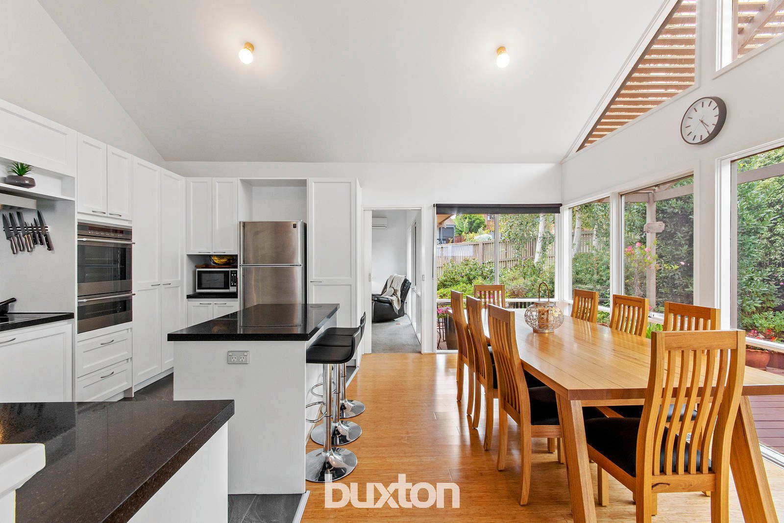 An abundance of natural light sweeps through the interiors, with bamboo flooring featured throughout. Both the lounge and open plan living zone overlook the north-facing alfresco and gorgeous gardens via large windows - creating a picturesque outlook from wherever you sit. The lounge is graced with an open fireplace, while a pitched roof highlights the dining/kitchen area. The kitchen exudes classic style with white cabinetry and black granite benchtops. Two built-in pantries provide ample storage, while appliances include a dishwasher, stainless steel wall oven, electric cooktop (two induction burners), and 900mm rangehood.