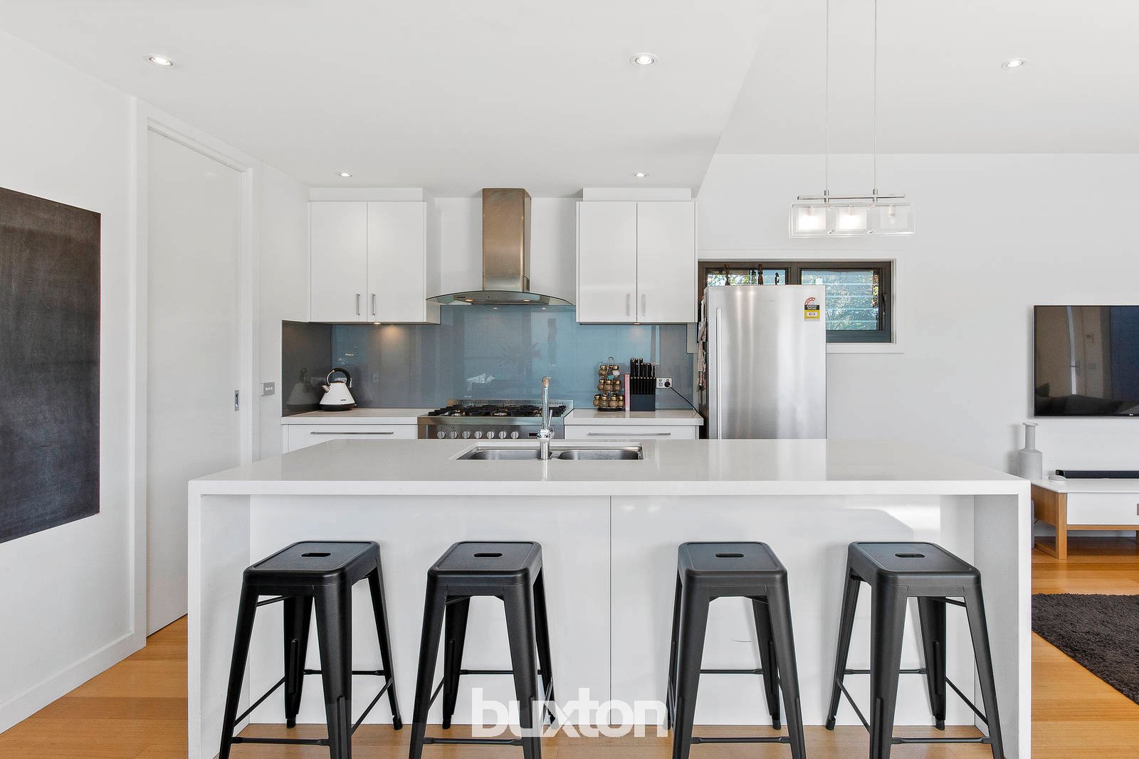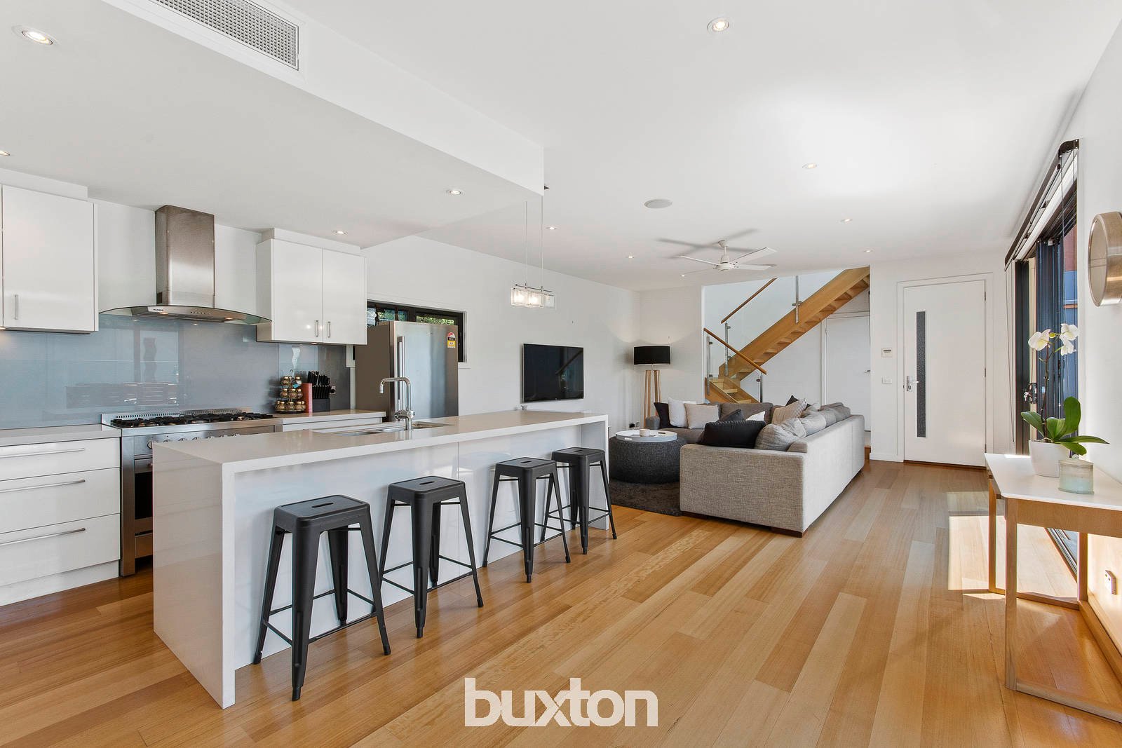 Downstairs offers a stunning open plan living zone comprising of large kitchen complete with stainless steel appliances, a large walk in pantry, a beautiful stone island bench positioned to take in the view of the pool making you feel like you are living in a resort. The living and dining area are spacious creating a lovely flow through the downstairs of the home complete with amazing timber flooring, the stunning timber staircase leads seamlessly up to the top level of the home that beautifully embraces the northerly aspect with large windows lining the central hallway whilst looking over the pool.