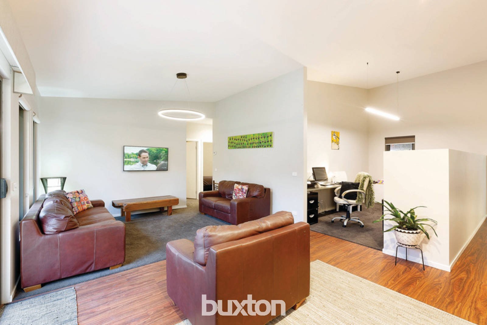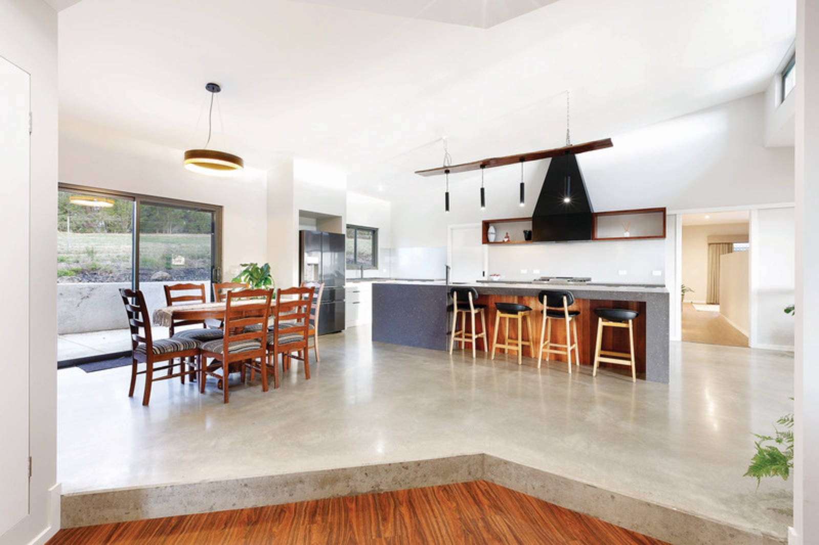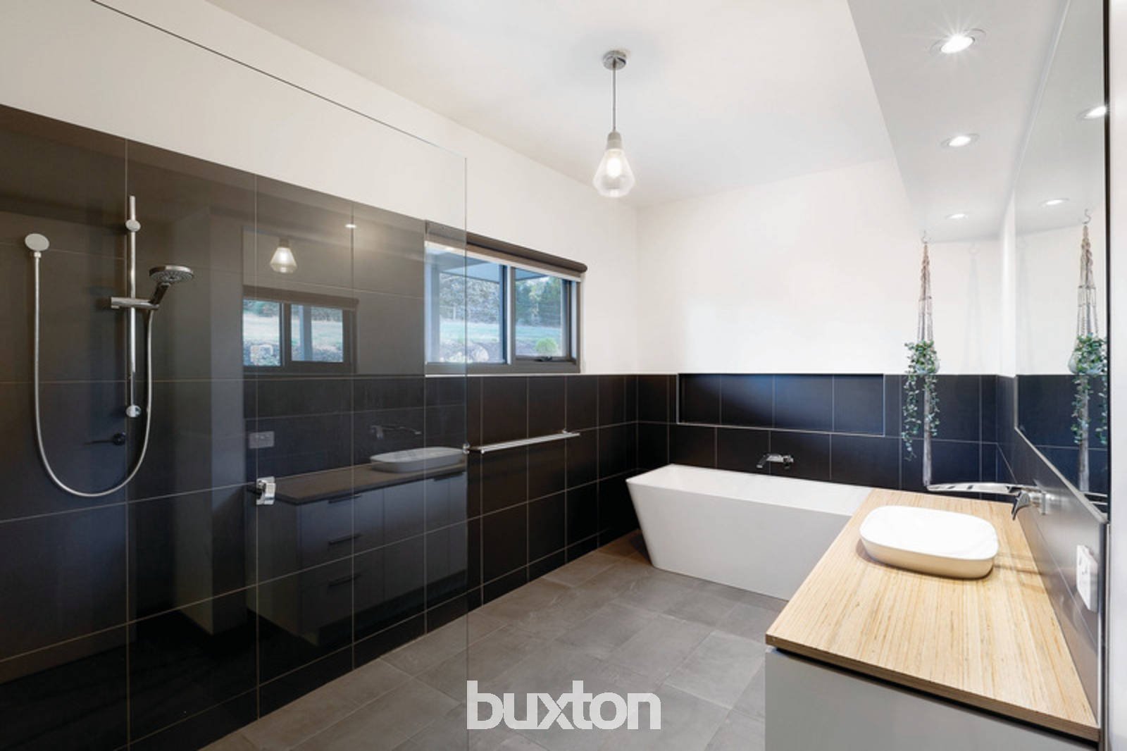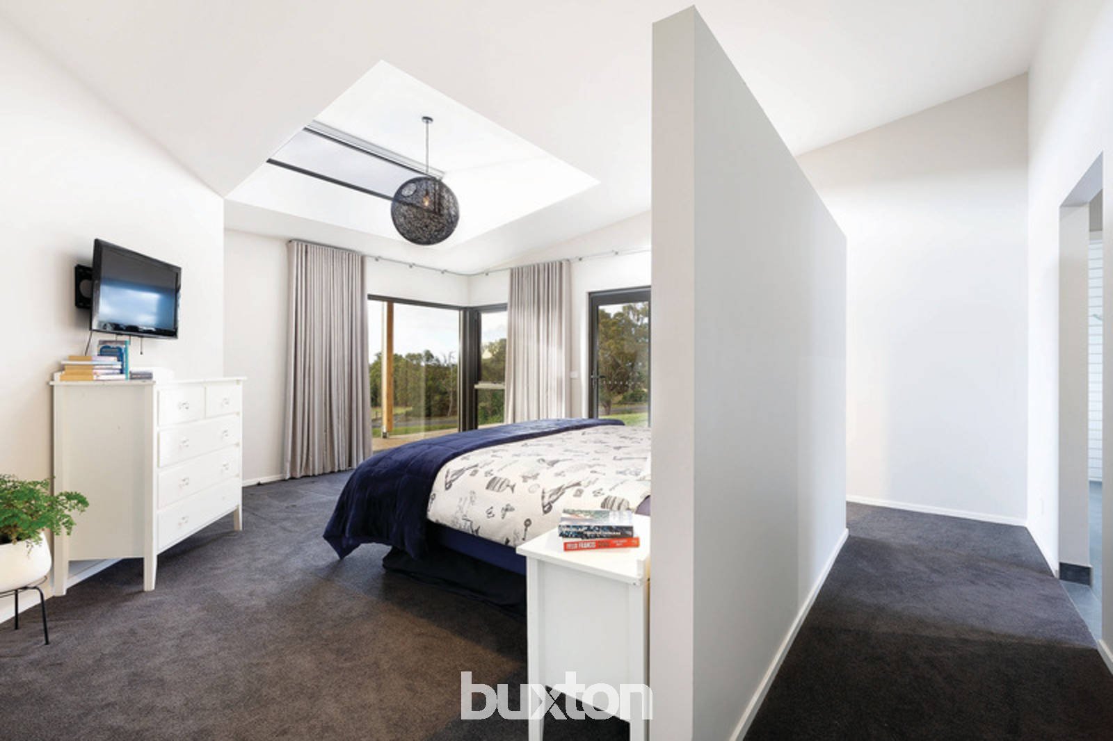 This is a once in a life time property, in a rural setting of Smythes Creek with only a quick 5-minute drive to the newly developed Delacombe Town Centre and 15-minutes to Ballarat CBD. Driving up the gravelled driveway you’ll see the hard work that has gone into building this beautifully designed home, with stunning attributes including a deep dam, massive welcoming home set on a rise, beautiful stone works up the chimney and around the base of the house with breathtaking views overlooking Smythes Creek and surrounding areas. Through the door opens up to a massive, aesthetically appealing open plan living/ dining/ kitchen area. The living room includes a wood fire perched upon a polished concrete pedestal fit with hydronic heating throughout the house, feature stone work up the chimney, double glazed windows throughout and a huge floor to ceiling window with incredible views. Up a step to gorgeous polished concreted floors holding the massive kitchen/ dining area. Kitchen is complete with a natural stone top island bench, 900m Ilve oven and gas hot plates, two pack drawers, Schweigan range hood, glass splash back, 2 sinks, Miele dishwasher, walk in pantry, high ceilings with natural lighting and an amazing featured statement piece of red gum timber with down lights over the island bench.