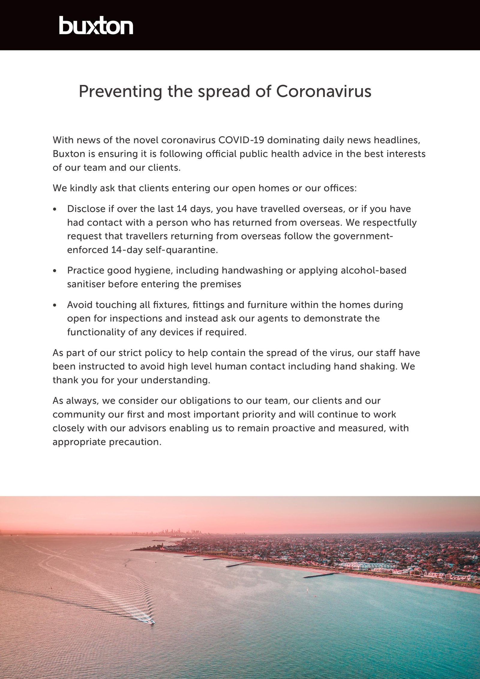 With news of the novel coronavirus COVID-19 dominating daily news headlines, Buxton is ensuring it is following official public health advice in the best interests of our team and our clients.