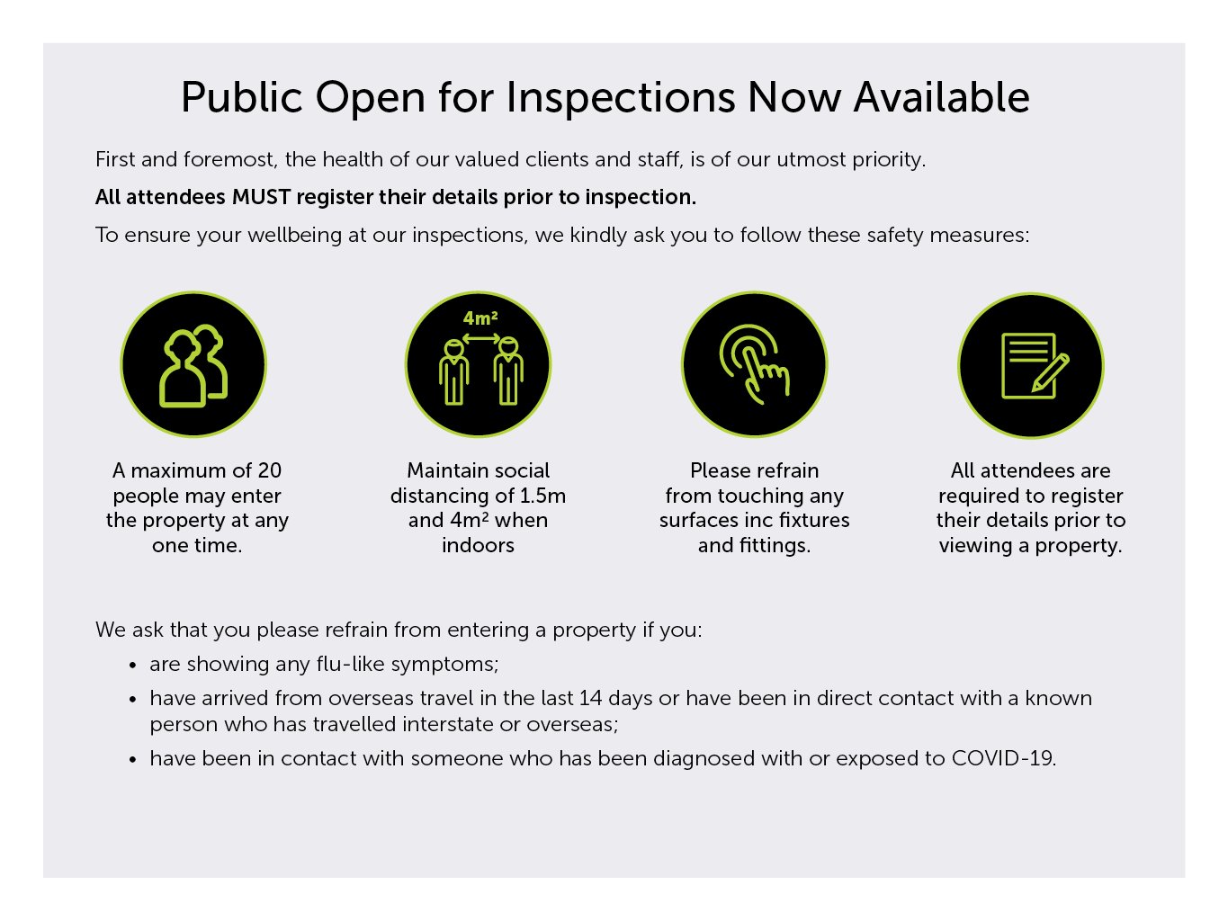 DUE TO FEDERAL GOVERNMENT RESTRICTIONS the number of people that can attend an inspection is limited to up to 20 people at any one time however is dependent on the size of the property. You MUST register for an inspection and we ask that you also confirm your attendance. AN AGENT WILL NOT BE PRESENT IF YOU DO NOT REGISTER and CONFIRM. Your consideration and co-operation is appreciated during these times.
