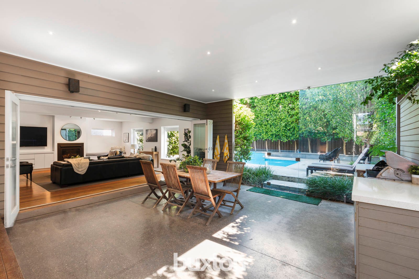 A separate family room (gas log fireplace) with bi-fold doors extends living out to an indulgent entertaining alfresco featuring a built-in BBQ and bar fridge, accompanied by a privately landscaped swimming pool and spa.