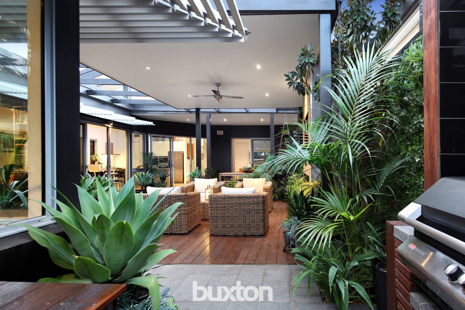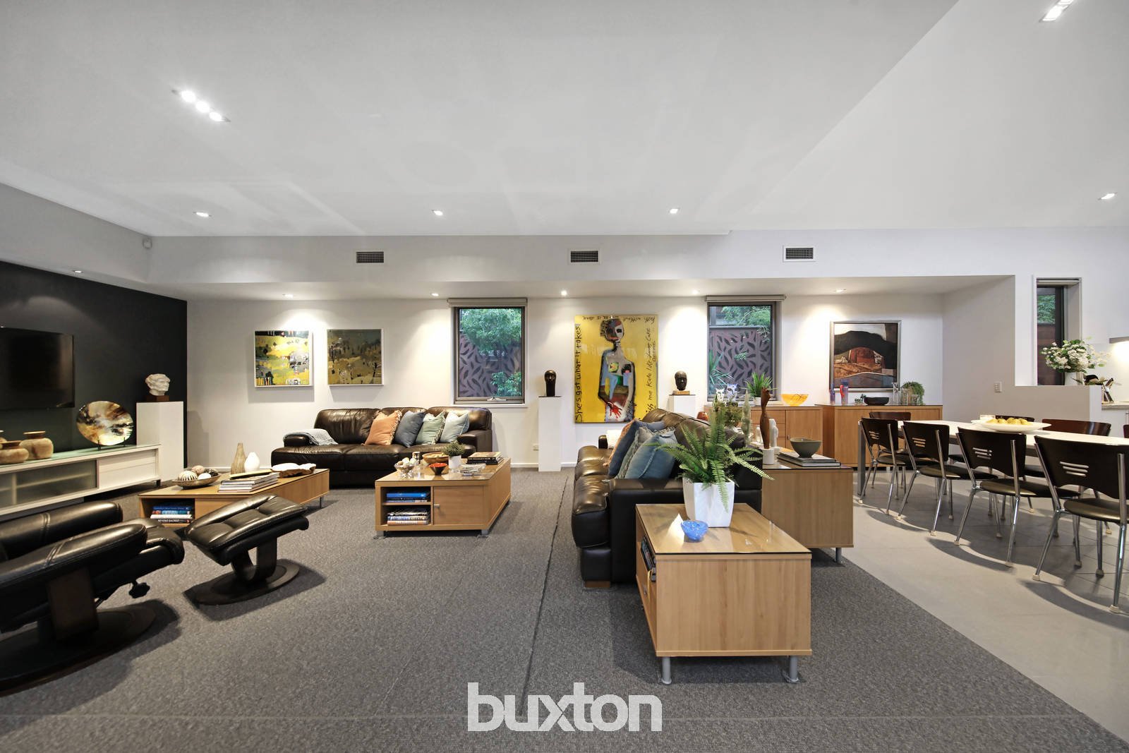 Climate-controlled over two zones with alarm, intercom, double-glazing, Cat5 cabling and 14 solar energy panels, the home is set in perfectly-utilised lawn-free approx 704sqm grounds with a double-plus auto-garage. Cocooned by timber, metal and vertical garden screening with extensive bluestone paving and Merbau decking, these creatively landscaped surrounds provide multiple weather-sheltered and pergola-shaded spaces to entertain, relax and hang around with the kids.