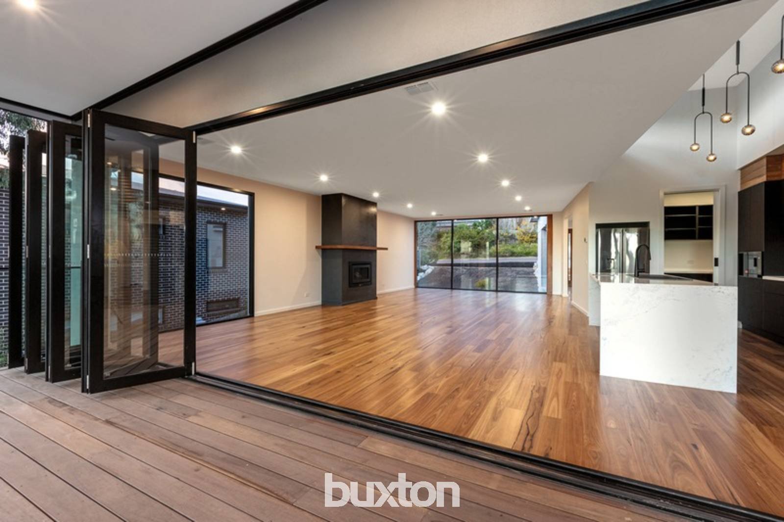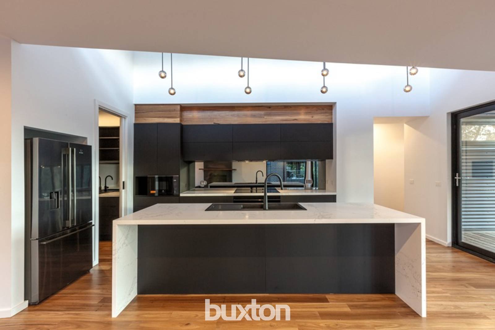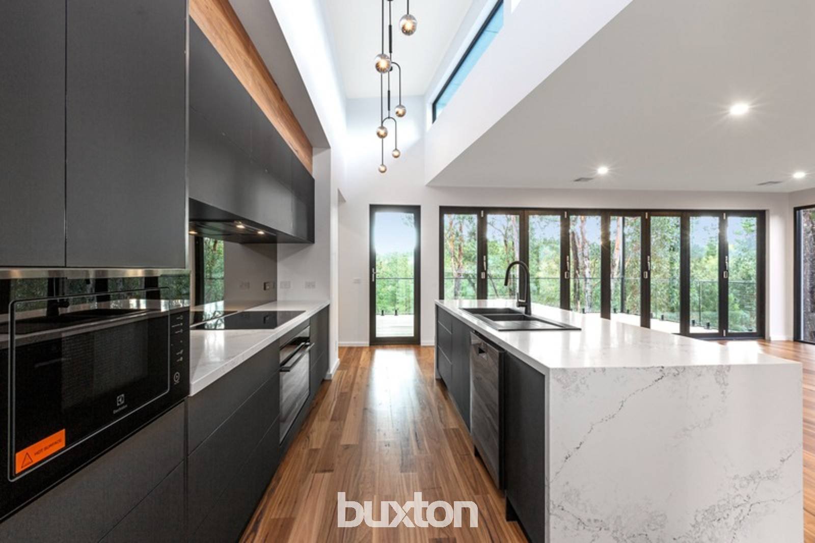 This beautiful modern architecturally designed home located in stunning natural surroundings on two levels features four bedrooms, three living areas, two timber decks and on a massive land allotment of approx. 1,038m2. From the moment you arrive you are blown away by the class, quality and style of this very impressive home. A timber decked entrance leads to a massive timber door with Blackbutt polished timber flooring flowing into a large open plan kitchen/living/dining area. Large windows letting in natural light surround the top level. The kitchen is complete with Empira White Stone benchtops, Butler’s pantry, sunken sink, black taps, 900mm electric oven/cooktop, rangehood, dishwasher, fridge and servo drive self-opening black absolute Matte finish fingerless no mark cabinetry. What more do you need!! Living area comprises a stunning Rinnai gas log fire with Grey Iron Bark mantle. Bi-fold doors open the entire way out onto decked undercover entertaining area including ceiling fan all overlooking landscaped garden and reserve. Built in gas for potential BBQ area.