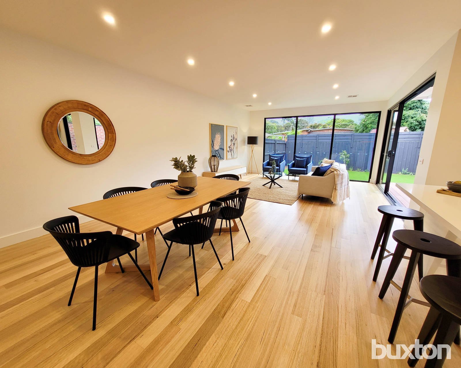 Beautifully framed by high streamlined ceilings and Tasmanian Oak floors, the sizeable open-plan living and dining area adjoins a gourmet stone-topped kitchen featuring Fisher and Paykel appliances, walk in pantry, and breakfast bar. Glass doors and sliders seamlessly connect the indoors to the generous al fresco deck, ideal for secluded entertaining amidst low-upkeep gardens.