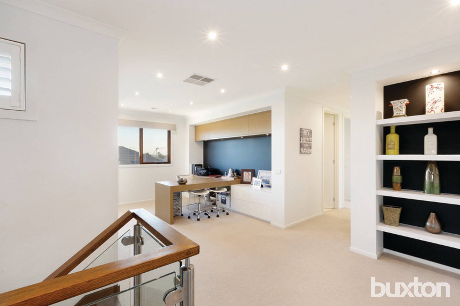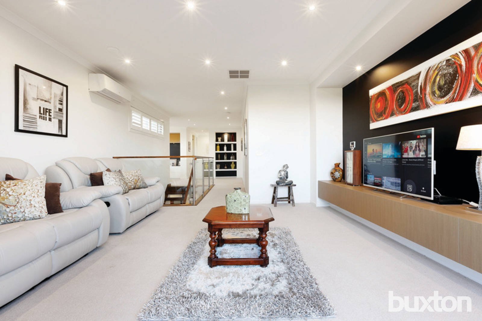 Stunningly presented king sized master bedroom is also held down stairs, complete with featured wooden wall, large walk in robe, private outdoor court yard and ensuite with double vanity, double shower and separate toilet. Downstairs also incorporates large laundry and close by powder room. Feature staircase leads you to upstairs where there is a large open plan study area complete with built in desk, an abundance of storage and magnificent views overlooking gardens and surrounding parks. Large third living area is well presented and would make the ideal theatre room and includes sliding doors out to private balcony, perfect to sit, relax and watch life go by. Four additional large bedrooms, all with walk in robes are also upstairs. Main family bathroom includes featured bath, shower, with feature tiling to ceiling, vanity with extra wide mirror and separate powder room this is special.