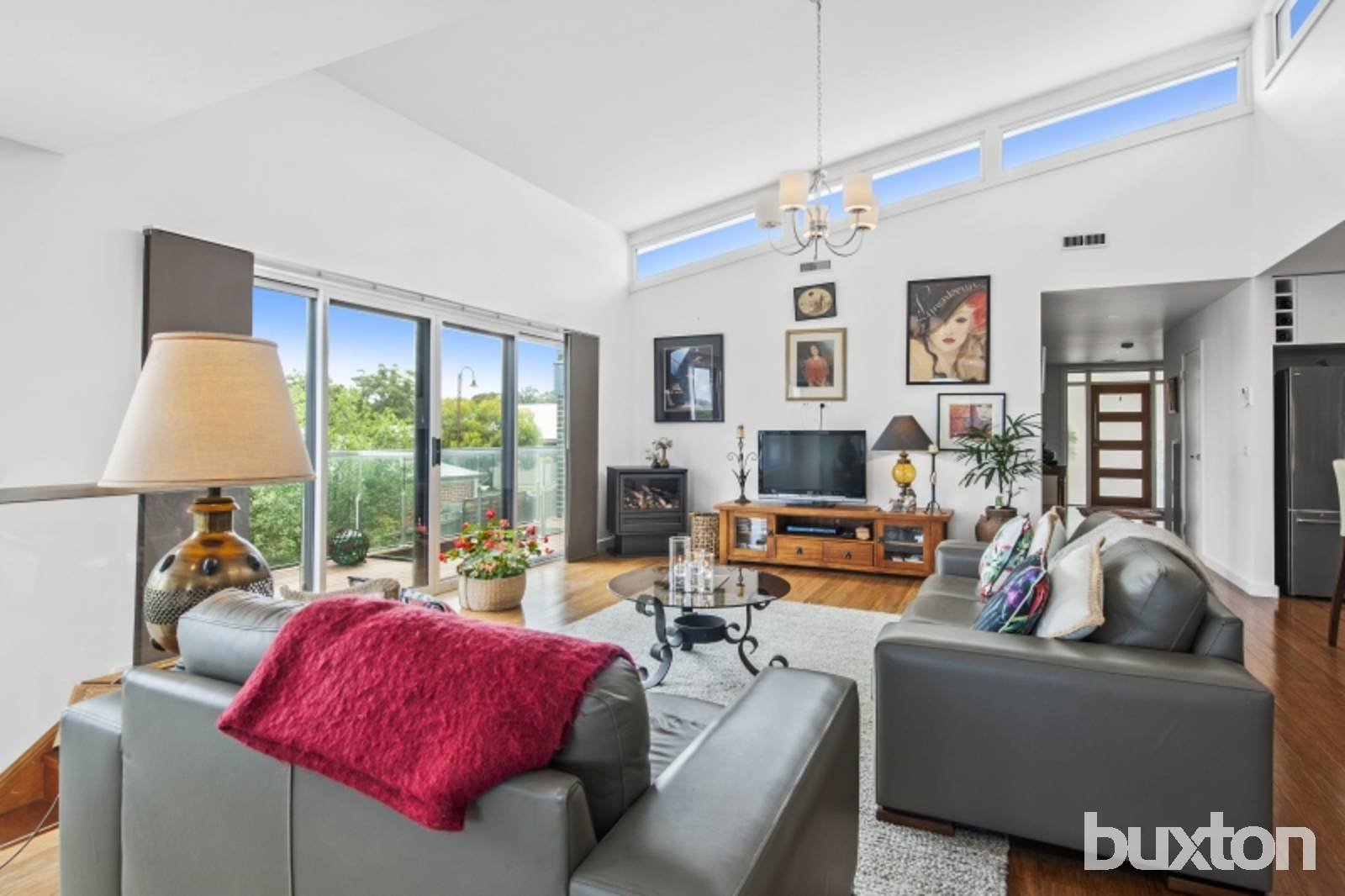 Bathed in natural light the family living area has high raked ceilings and clerestory windows. In addition to central heating and cooling a gas log fire provides a cheery ambiance.