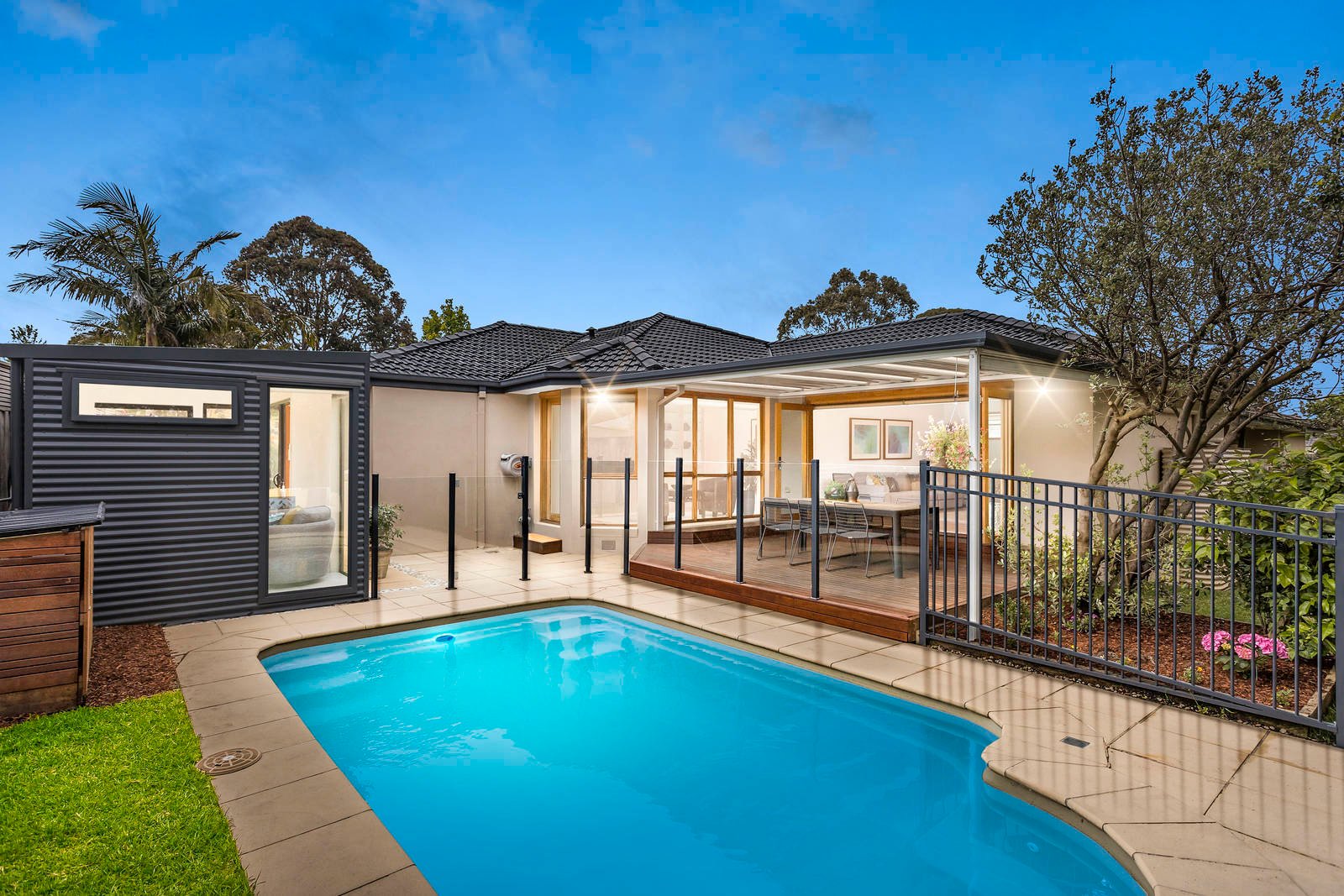 Showcasing an irresistible blend of space, designer style and beautiful landscaped gardens, this luxurious entertainer promises a tantalising lifestyle, footsteps to Gardiner’s Reserve and Trail. Timber floors and glorious natural light filter through the seamless layout, with an L-shape living/dining zone complementing a modern stone/Smeg appointed kitchen and family room (gas log fireplace) – unfolding through bi-fold doors to a resort-style entertaining deck and in-ground swimming pool. Lifestyle flexibility is confirmed by 3 robed bedrooms including 2 main bedrooms each with a luxe ensuite, fully-tiled bathroom with freestanding bath, fitted study and external studio versatile as a gym, 4th bedroom or home office. Amongst the highlights are ducted heating, split system AC, ample storage throughout and double garage. Tucked away in a private court setting, walking distance to bike/walking paths, playgrounds, Ashwood Memorial Kindergarten, Parkhill Primary, Ashwood High School and close to PLC, Deakin University, Chadstone shopping centre, Box Hill central and Ashburton Village.