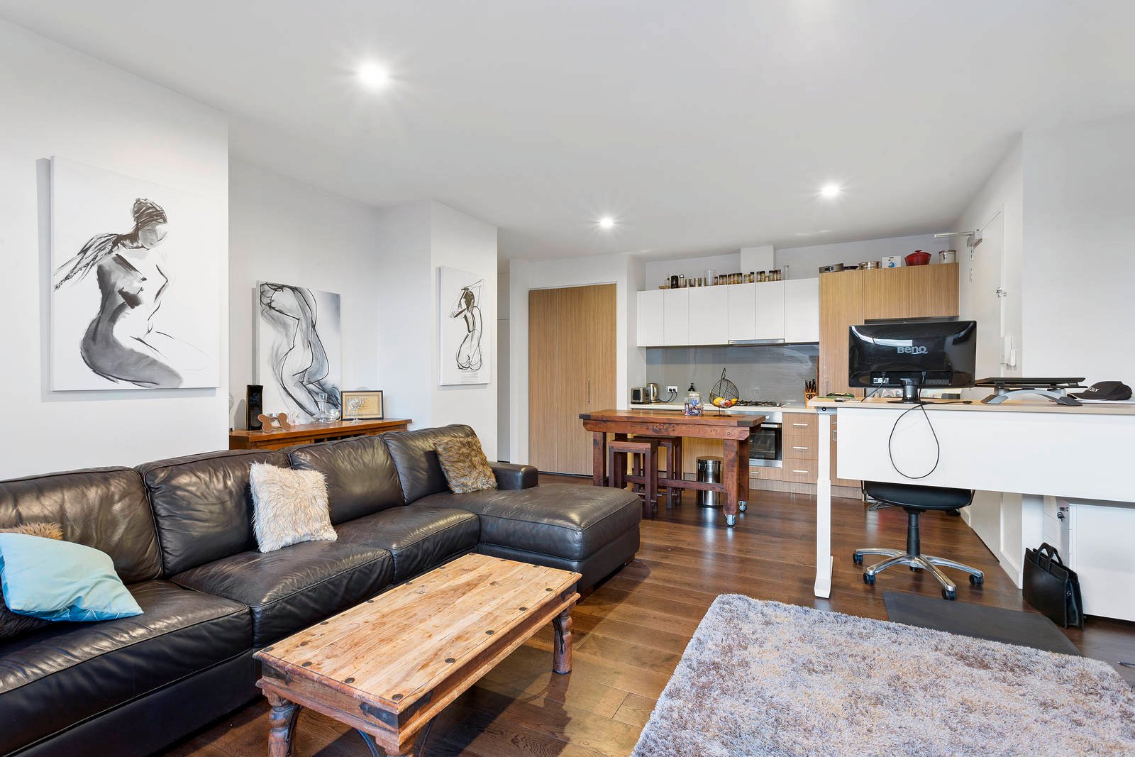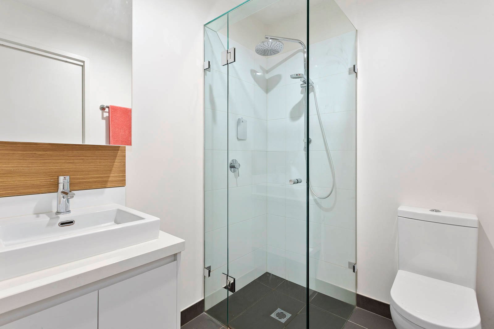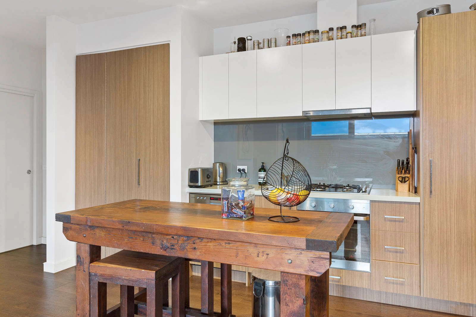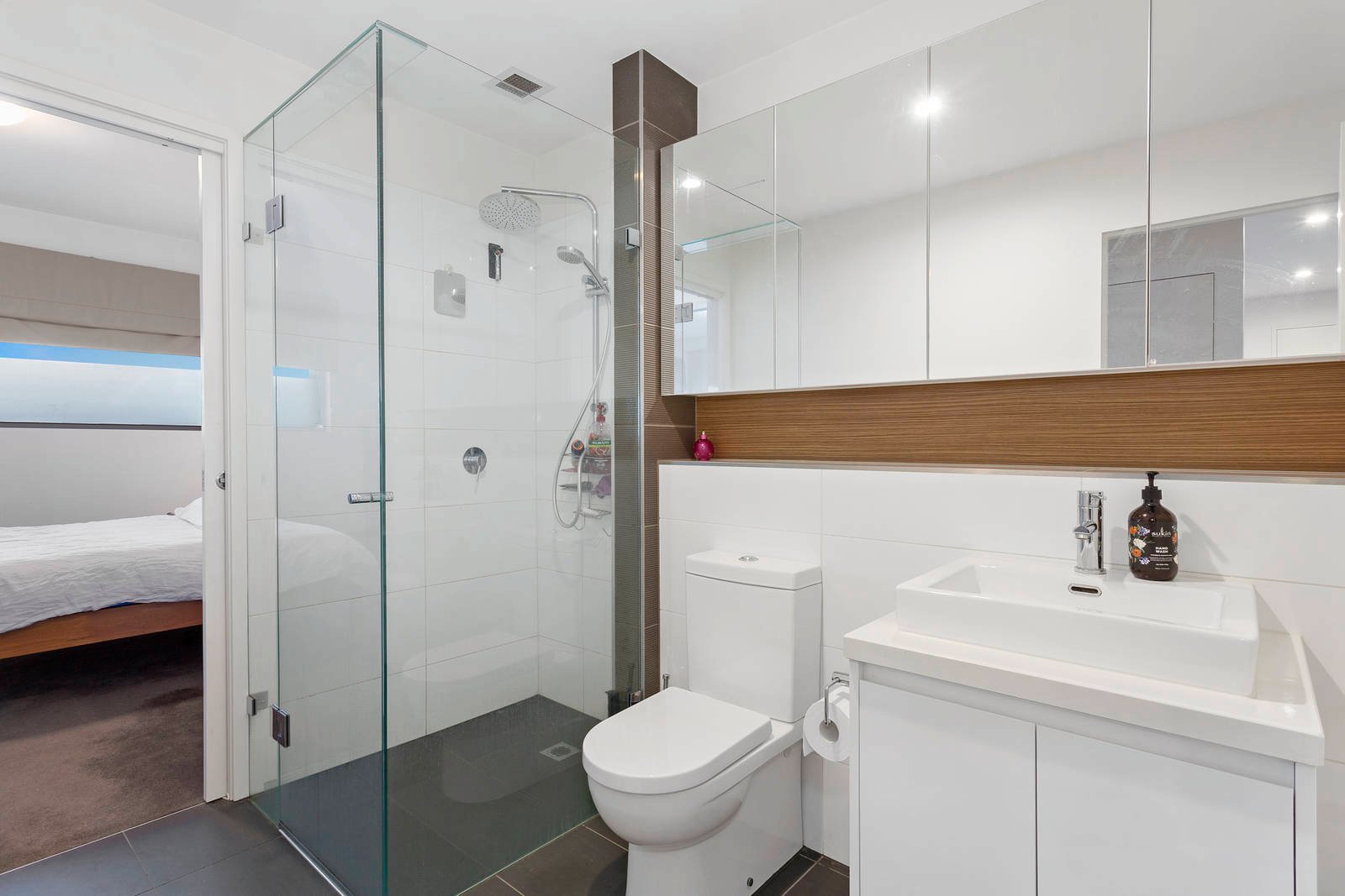 Cleverly accommodating with a state-of-the-art designer ensuite for each bedroom and a prestige European appliance kitchen (including an Ilve dishwasher) for open-plan living, this high-end apartment features rich cocoa wideboard Oak floors (for living and traffic areas, sparkling mirrored robes (for both bedrooms) and cool stone benchtops (for kitchen and bathrooms).