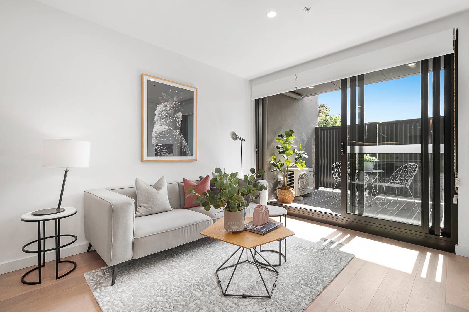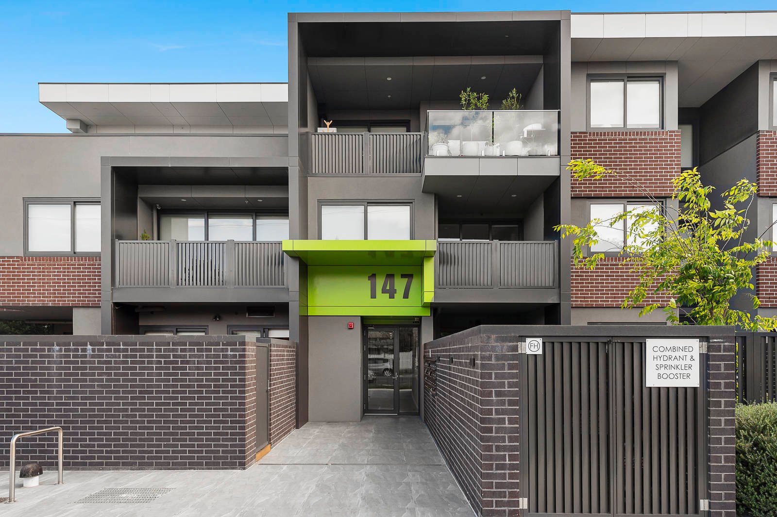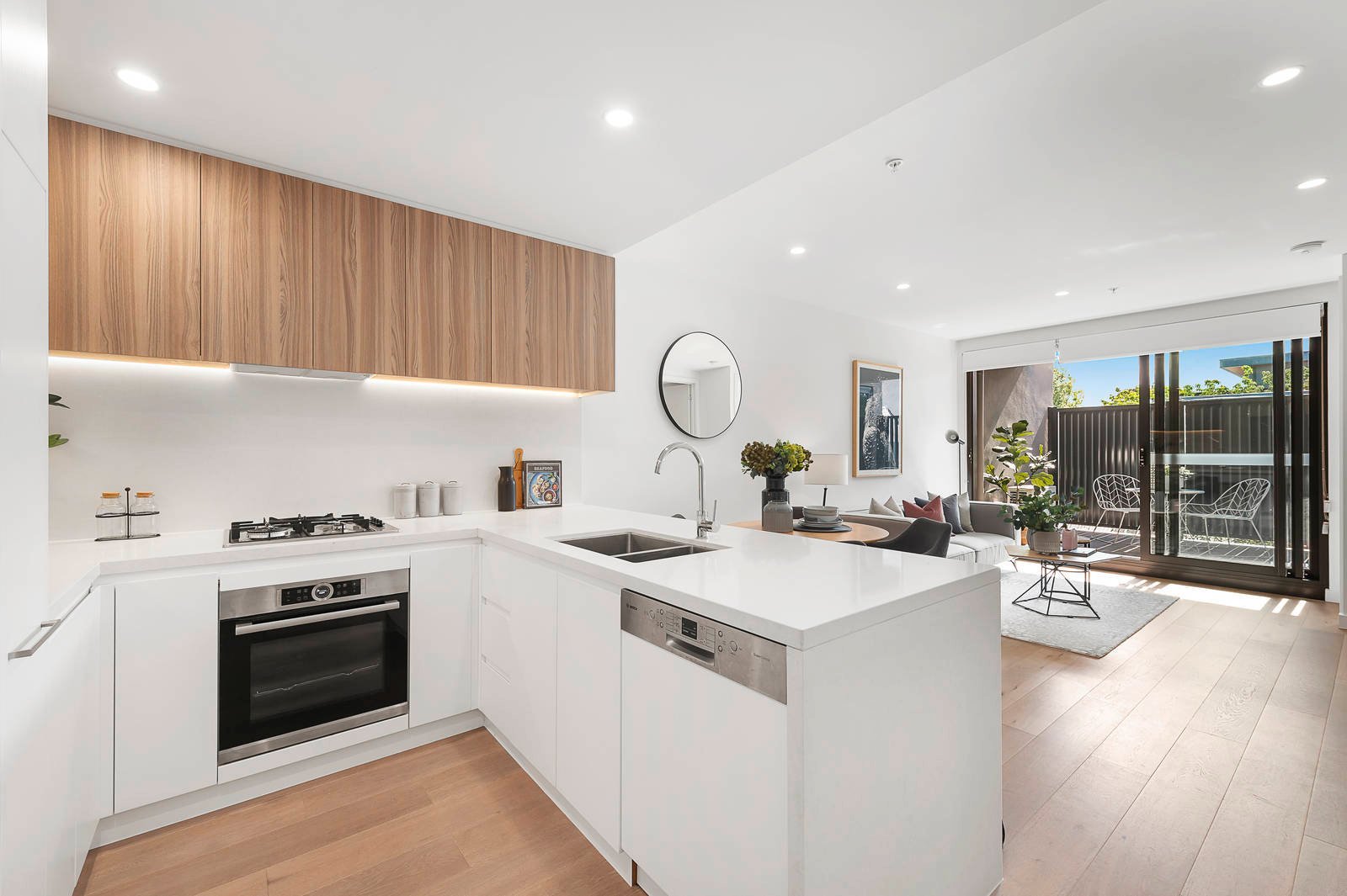 Instantly impressive for its contemporary appointments and sparkling interiors of generous proportions, this 2-bedroom 2-bathroom apartment points to supreme home buyer or investor satisfaction. Preceded by versatile open-plan living and dining areas, a large sheltered balcony is the perfect setting for alfresco enjoyment, with the stone surfaces in the Bosch-equipped kitchen (integrated dishwasher) illuminated by feature lighting. Both carpeted bedrooms have mirrored built-in robes – one with balcony access and the master leading to a private ensuite. Located for lifestyle ease just a short stroll to Glen Huntly Park, Glenhuntly Train Station and local cuisine, it includes a secure car space, private storage room, reverse-cycle heating/cooling, a/v intercom, Euro laundry, dual layer roller blinds and lift access.
