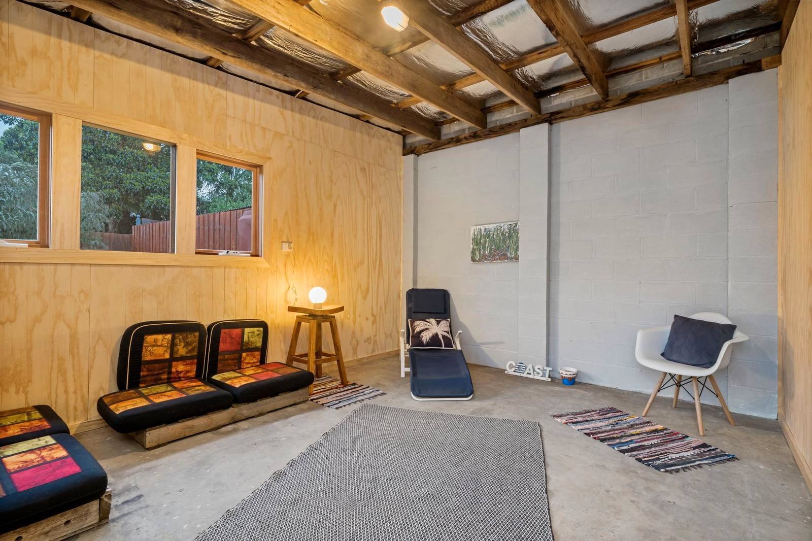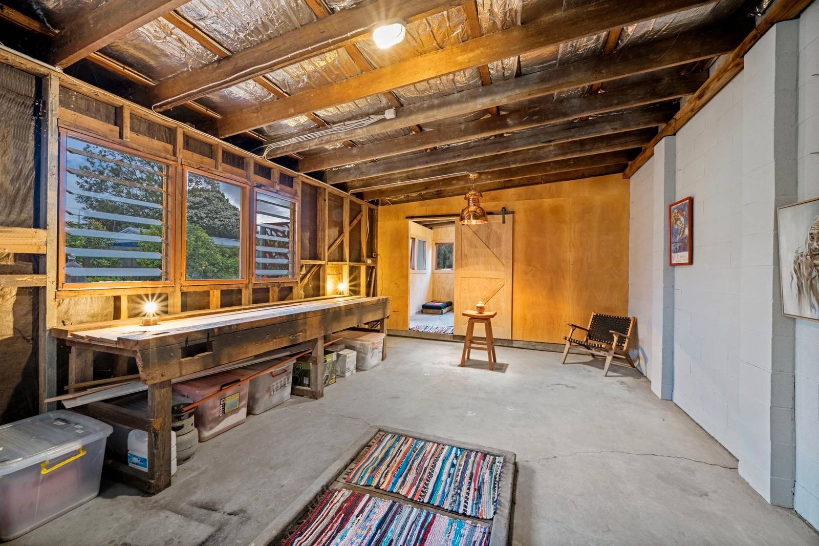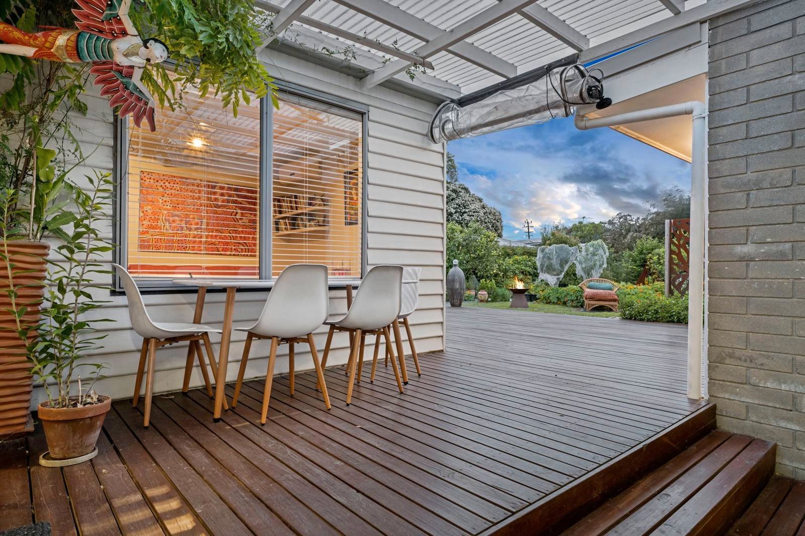 Charming French doors open from the dining area onto an expansive timbered deck, overlooking the breathtaking back garden, orchard and abundant vegetable patches. A generous studio space, plus an enclosed garage or workspace, surrounded by trees and birds, make working from home, ideal. Or perhaps inspire a creative pursuit.