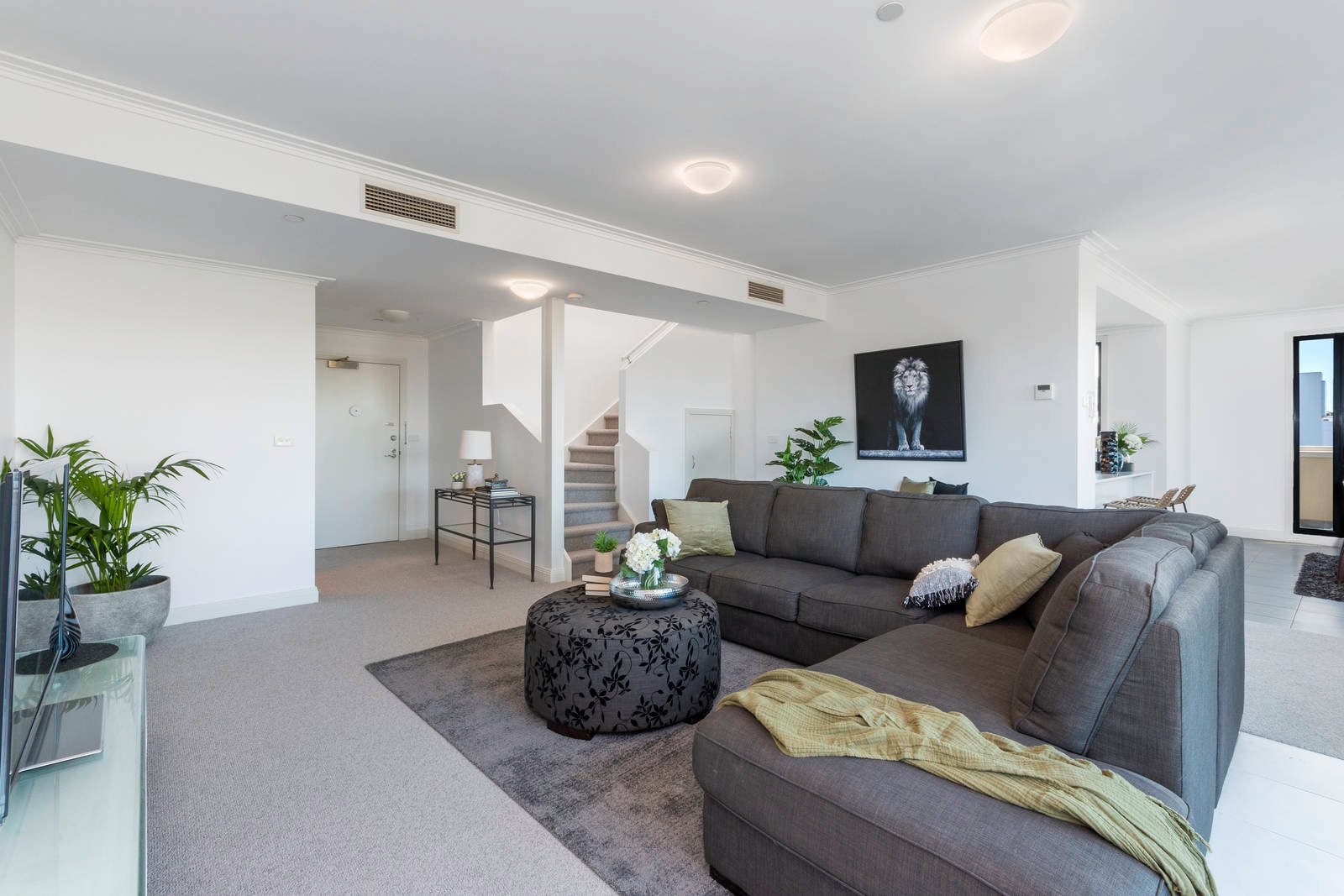 Presenting an extraordinary opportunity to secure this updated luxury penthouse, superbly positioned where the city meets the bay to offer leisurely waterfront living combined with the vibrancy of the inner city. Set over two levels, the apartment features high ceilings and a fresh contemporary colour scheme creating a light and spacious ambience within. Entry into the apartment reveals an expansive living, kitchen and dining space well-designed to accommodate modern open plan living. Elegantly updated, the stunning kitchen features contemporary finishes, Caesarstone bench tops, stainless steel appliances, quality modern fittings, ample cupboard space and the perfect vantage point to take in the beautiful view; cooking will never be a chore here! The kitchen connects seamlessly with the dining and living areas which are bordered by a series of windows and glass doors that open up to an expansive wrap-around balcony. Cityscape views create an extraordinary backdrop to everyday living and a truly impressive