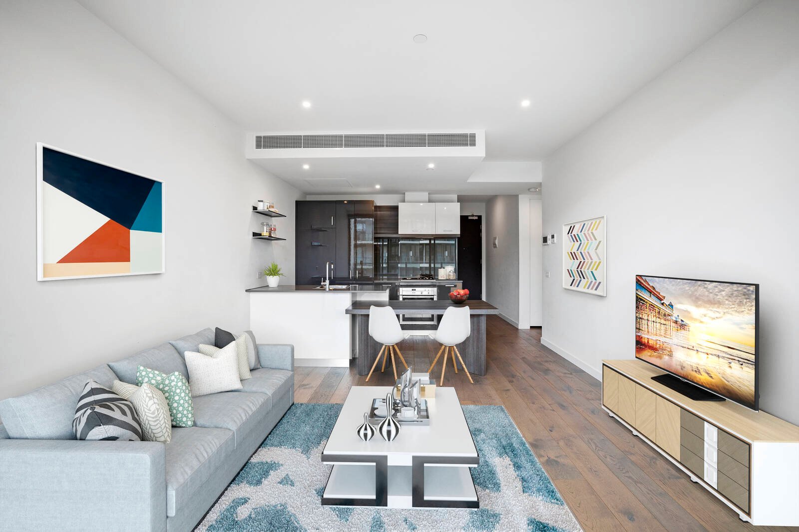 Located up on the fourth floor with a broad sunset-facing balcony, the sophisticated home offers premium finishes throughout the practical layout. Featuring a combined living and dining zone that extends out to the balcony, there is also a gourmet stone kitchen that has been equipped with top-shelf Neff appliances. The master bedroom also enjoys fresh breezes from direct balcony access and offers queen-sized accommodation – both this room and the second bedroom benefit from fitted wardrobes and share the sparkling central bathroom complete with luxe frameless shower. A Euro laundry is a practical inclusion, whilst triple-zoned heating/cooling, video intercom plus basement parking & storage with lift access finalise the package.