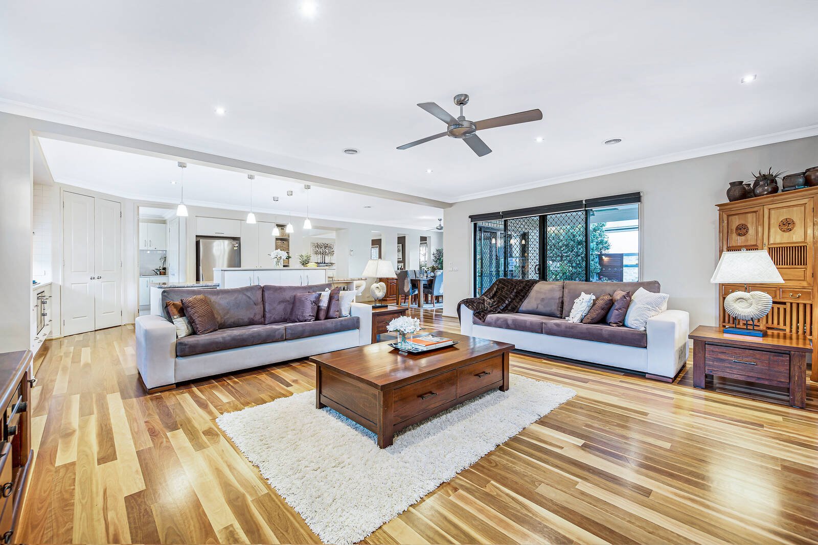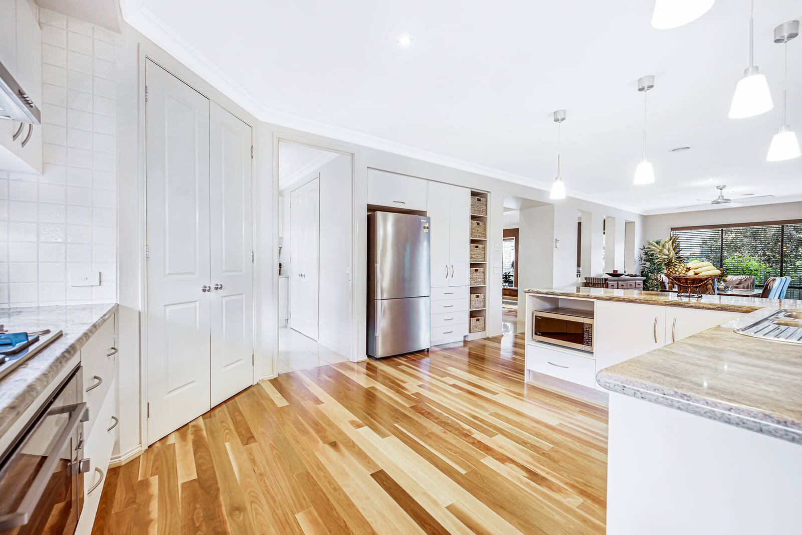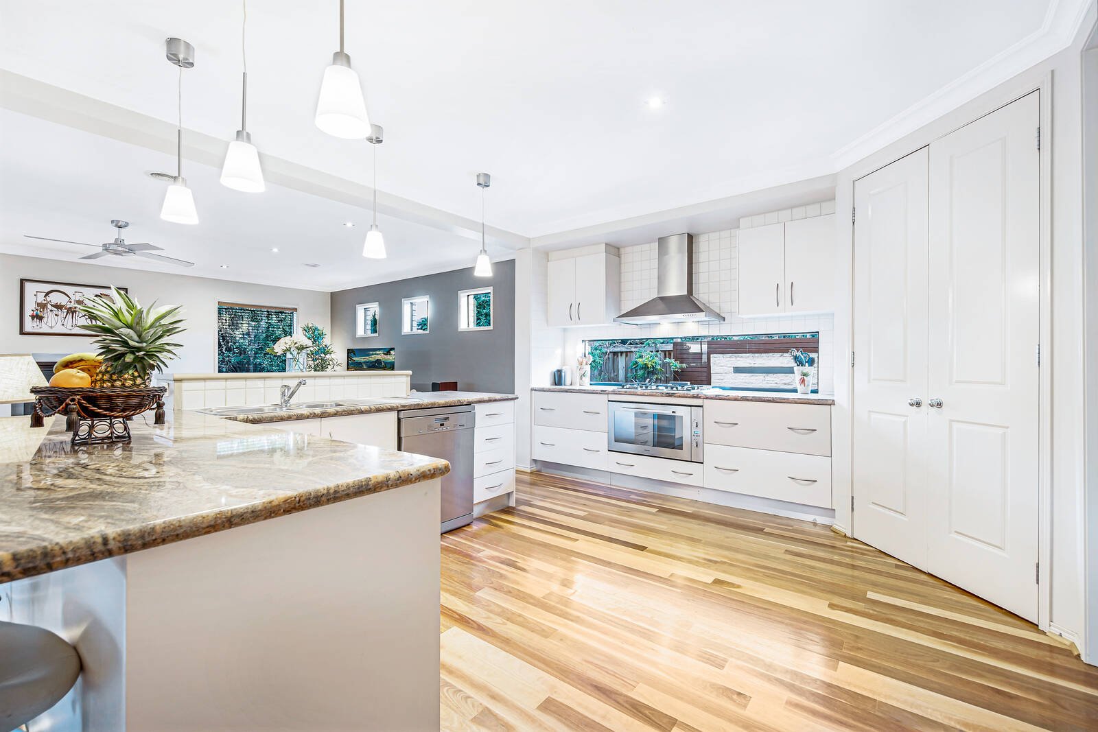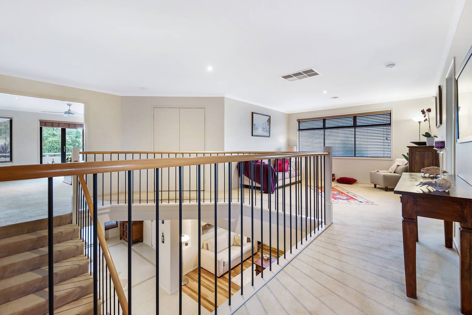Wrapped in easy care gardens that include alfresco decking tailor-made for easy outdoor entertaining, the accommodation includes an open plan living zone that embraces a well-equipped stone kitchen. Featuring a waterfall breakfast bar and large walk-in pantry, hosts will love the space and function on offer. There are an additional living and four bedrooms peacefully placed upstairs including the main spacious ensuite master with walk-in robes that capitalises on the leafy outlooks – the remaining bedrooms offers built-in storage and share the modern family bathroom.