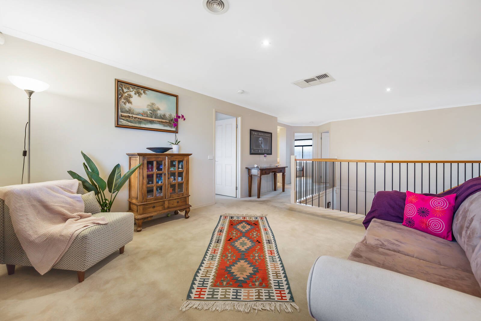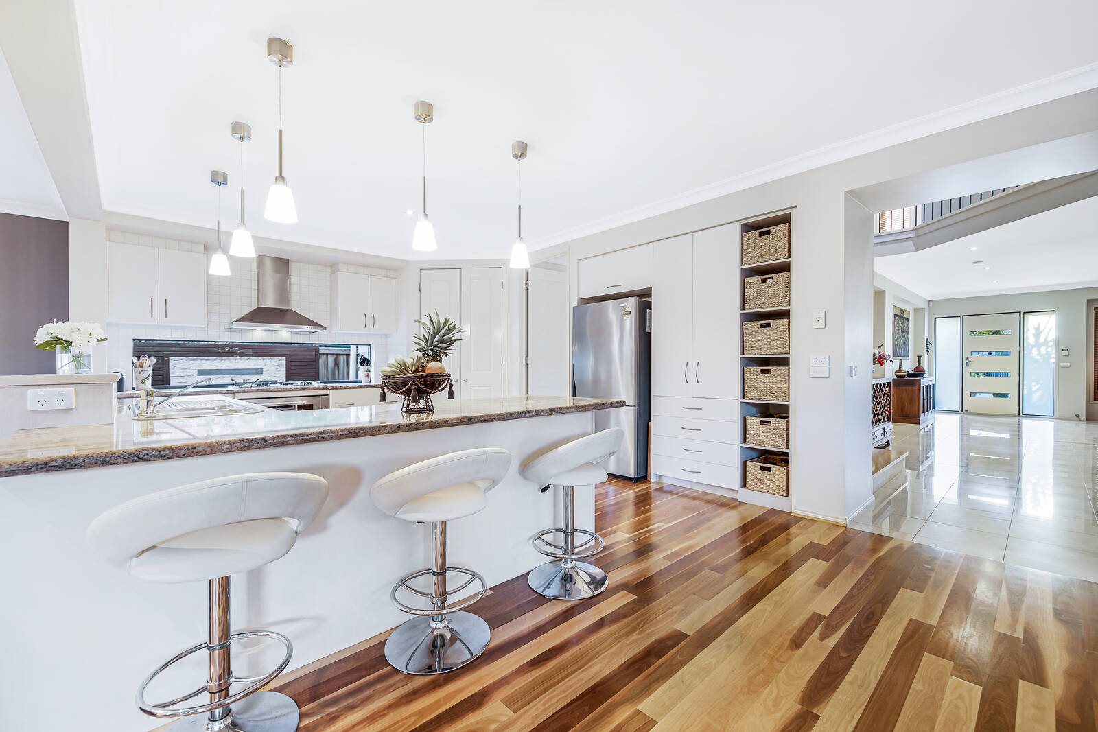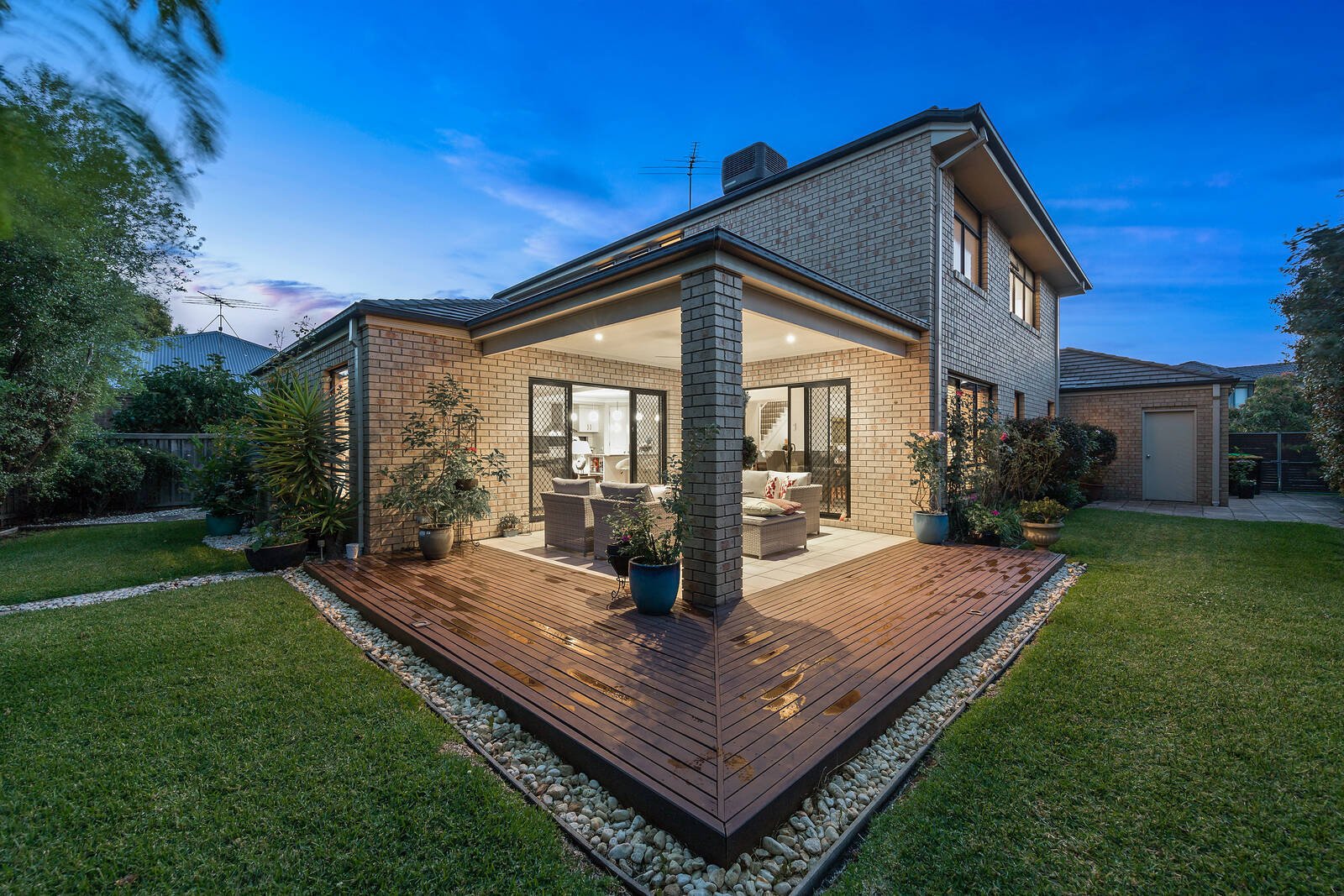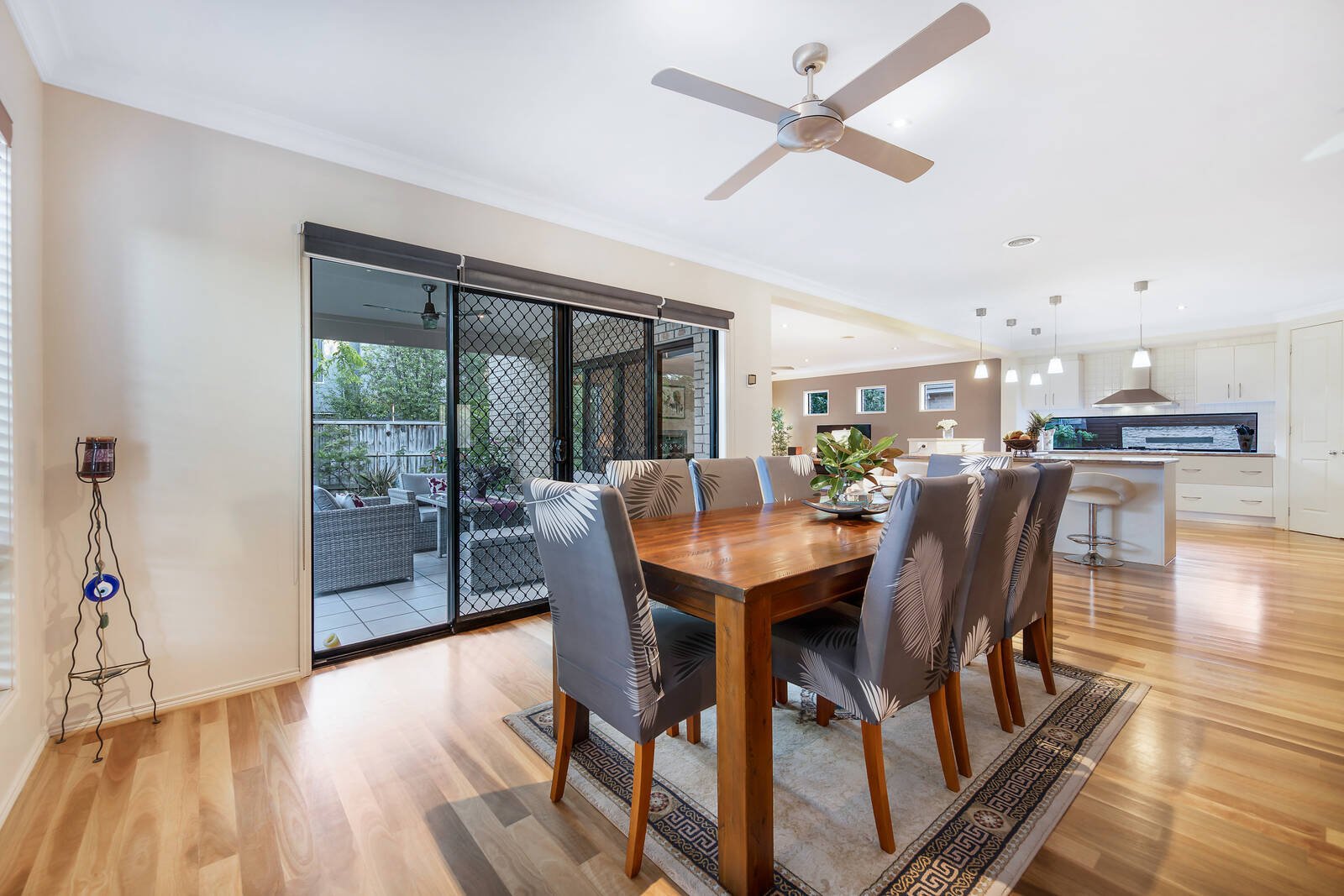 Wrapped in easy care gardens that include alfresco decking tailor-made for easy outdoor entertaining, the accommodation includes an open plan living zone that embraces a well-equipped stone kitchen. Featuring a waterfall breakfast bar and large walk-in pantry, hosts will love the space and function on offer. There are an additional living and four bedrooms peacefully placed upstairs including the main spacious ensuite master with walk-in robes that capitalises on the leafy outlooks – the remaining bedrooms offers built-in storage and share the modern family bathroom.