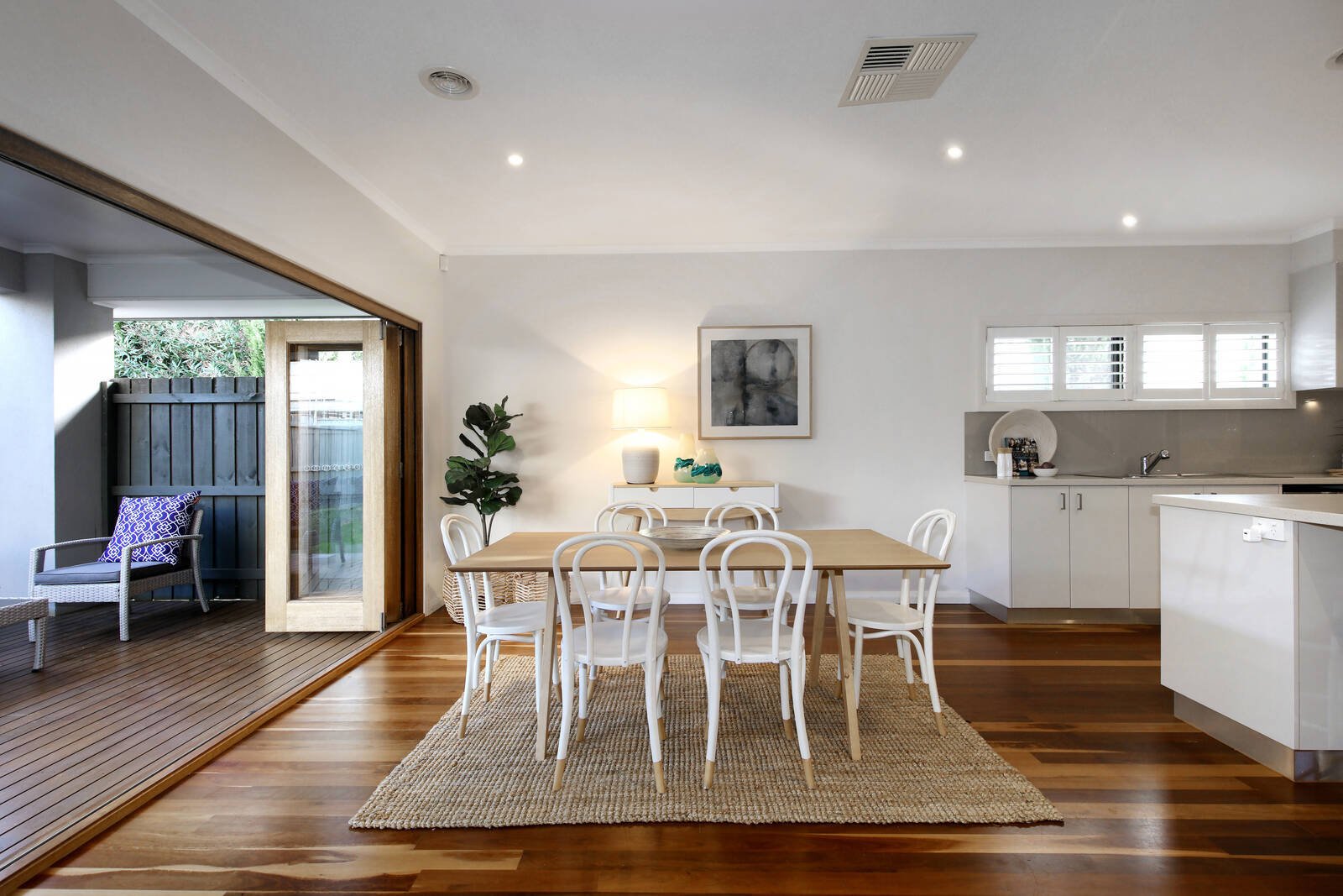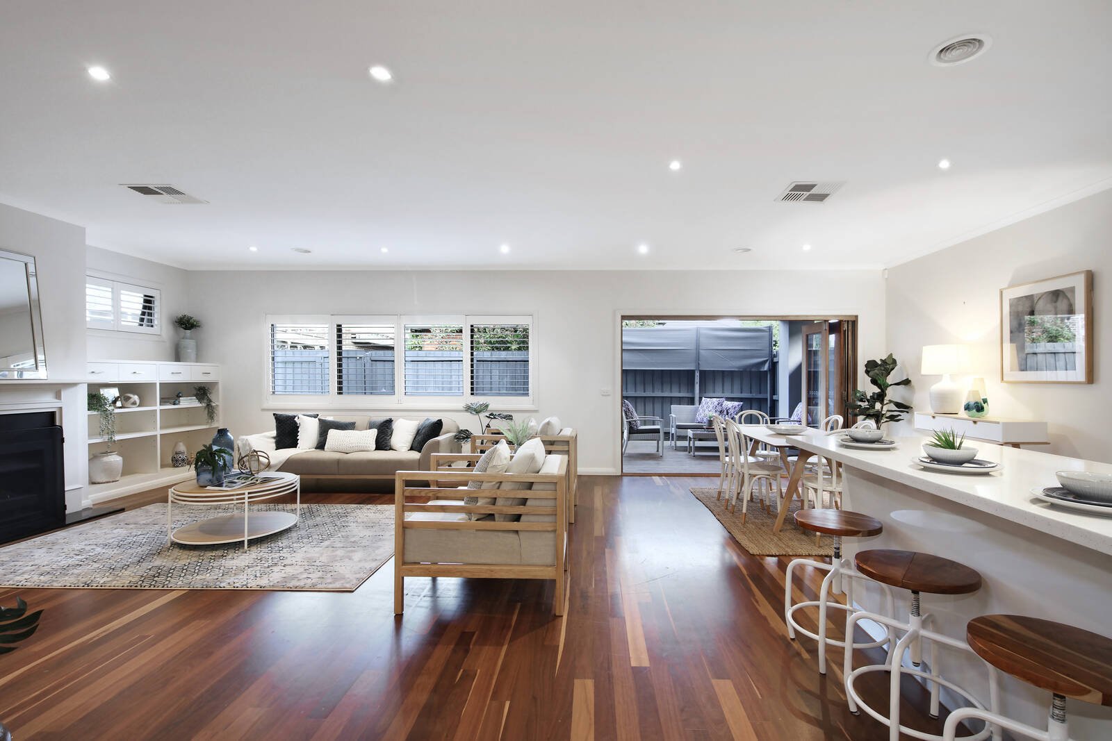 High ceilings and beautiful natural light create a flawless atmosphere throughout the spacious open-plan living/dining zone (gas log fireplace), featuring bi-fold doors that spill out to a private covered alfresco.