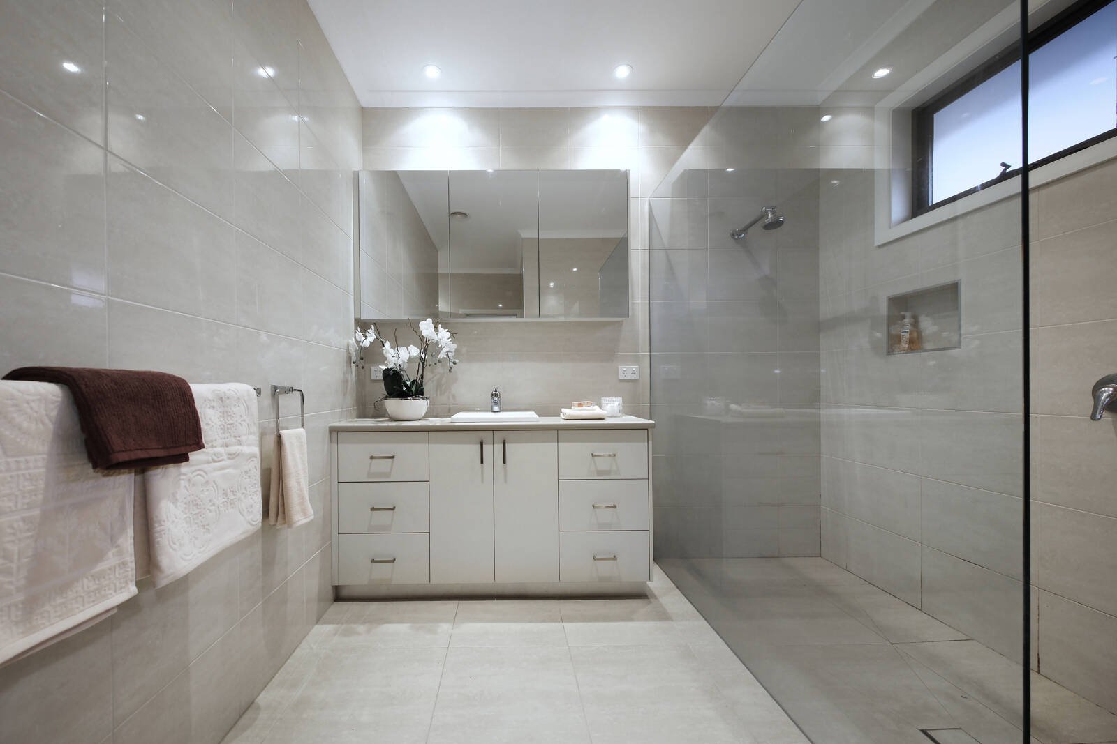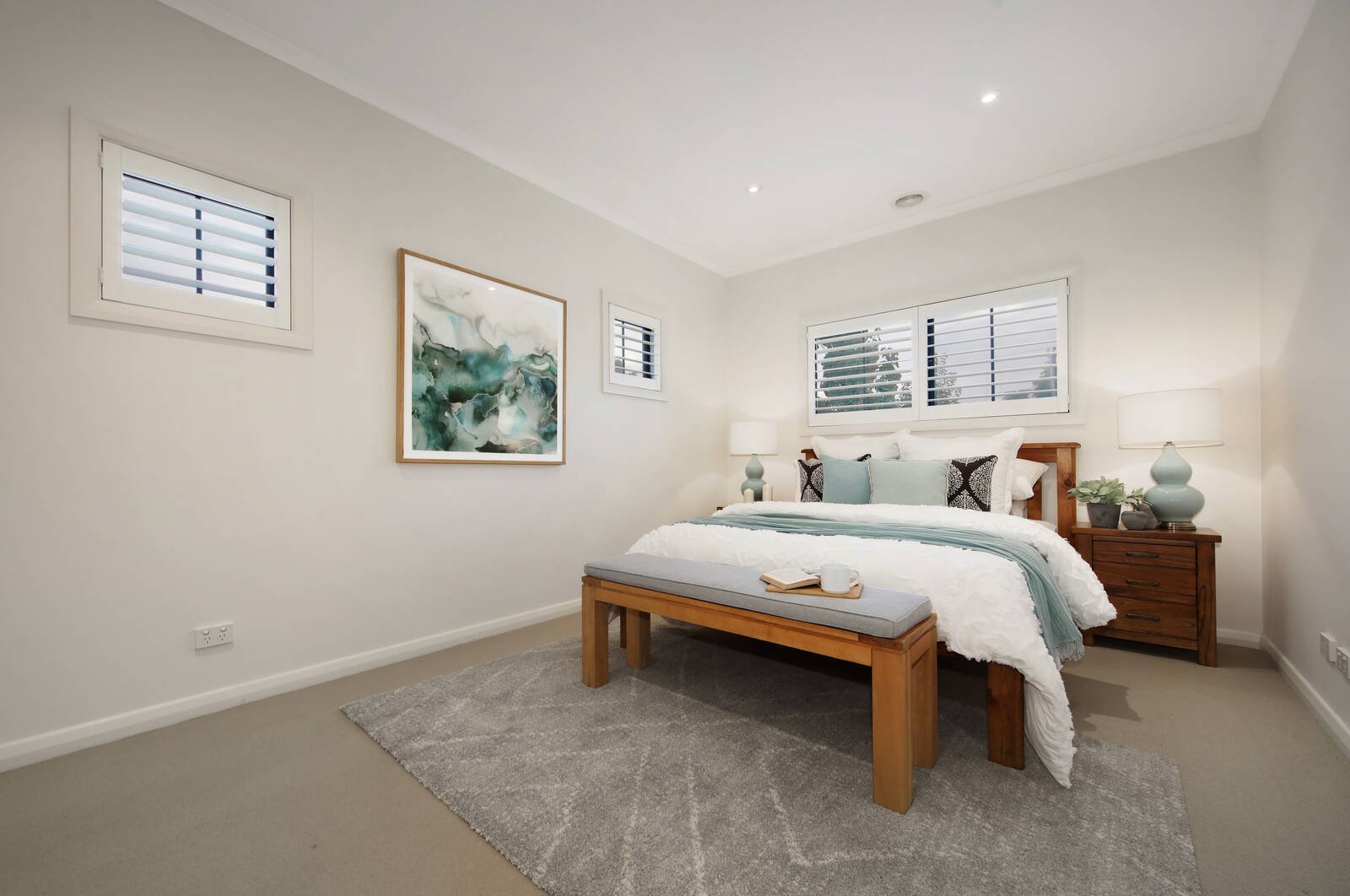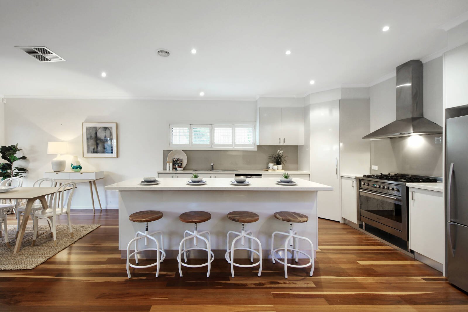 A main bedroom with luxurious fully-tiled ensuite & WIR is enviably positioned on the ground floor and is enhanced by 2 over-sized bedrooms each with WIR, modern bathroom, retreat, powder room, study nook, Grey Ironbark timber floors, plantation shutters, double glazed windows, ducted heating, evaporative AC, alarm, ample storage, ducted vacuum, double garage, water tank and off street parking.