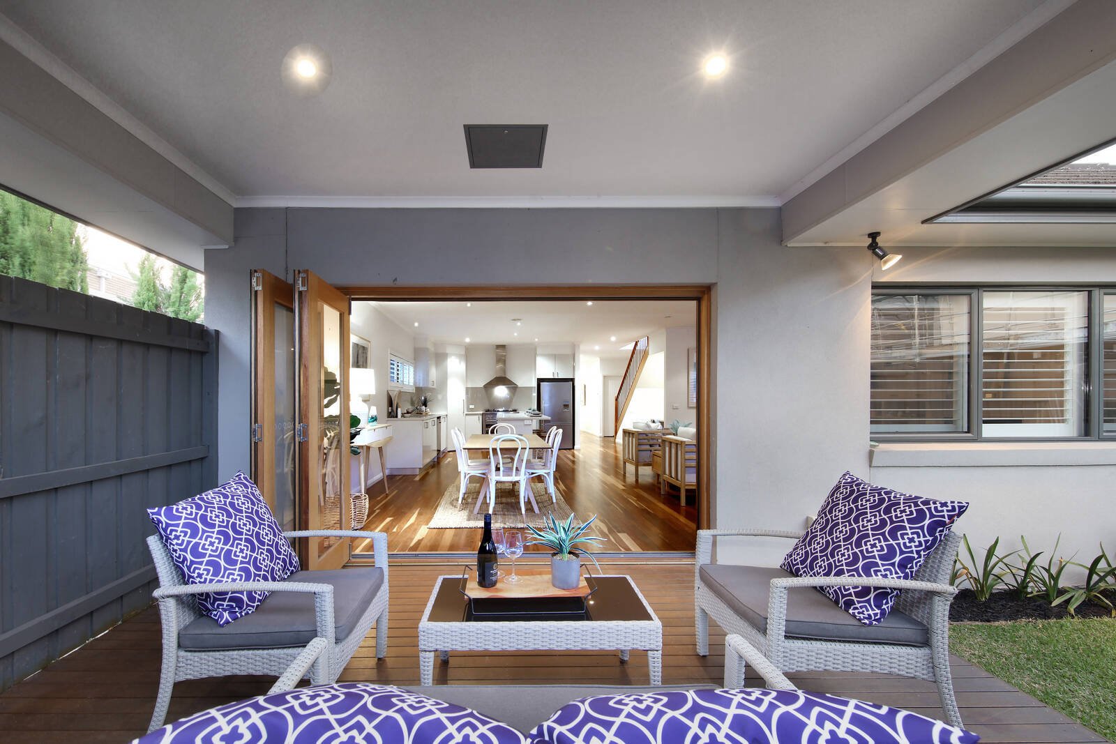 High ceilings and beautiful natural light create a flawless atmosphere throughout the spacious open-plan living/dining zone (gas log fireplace), featuring bi-fold doors that spill out to a private covered...