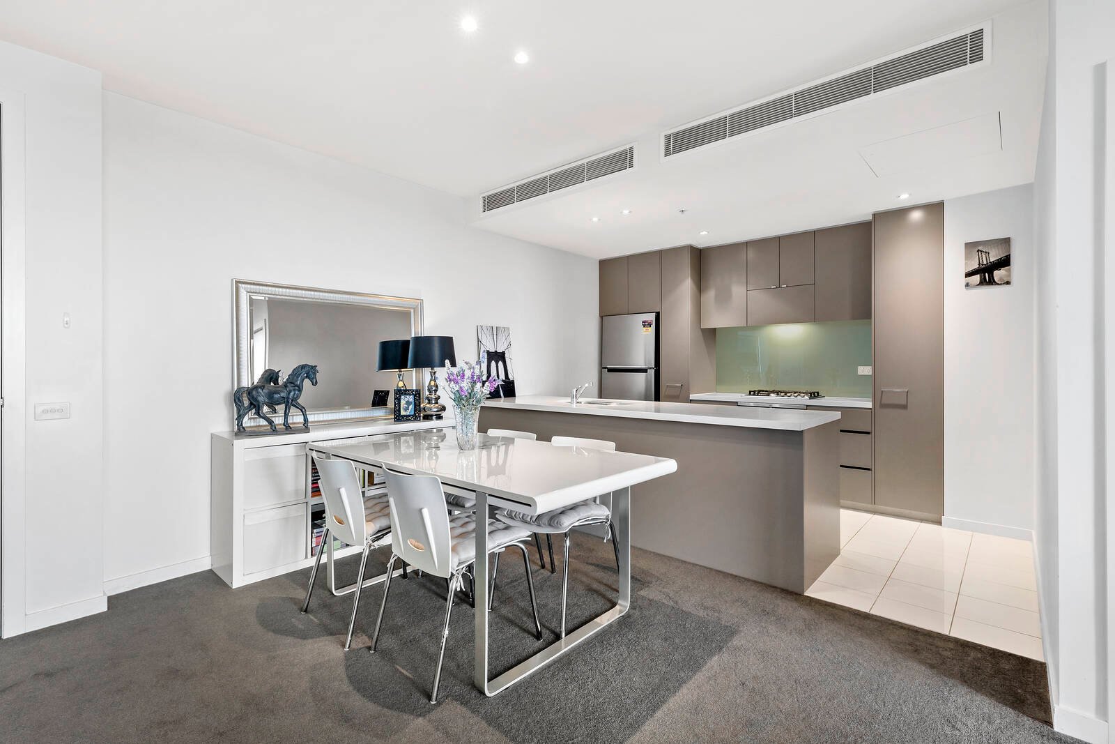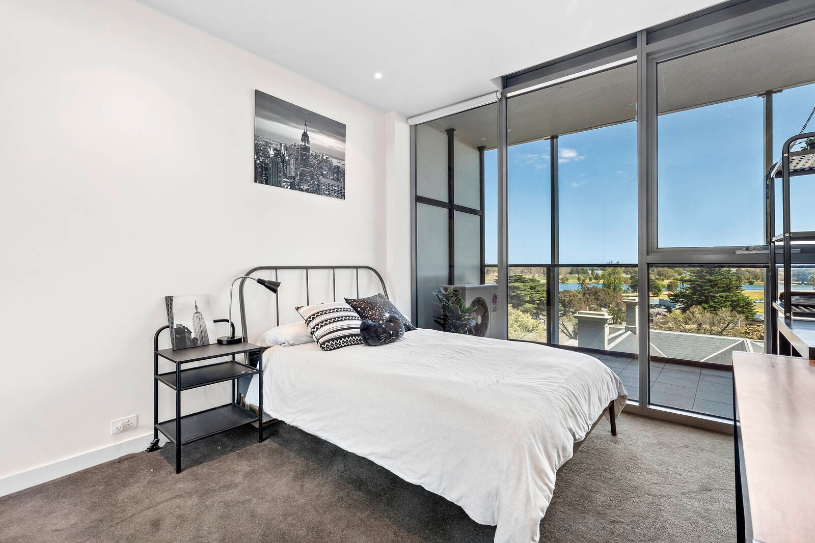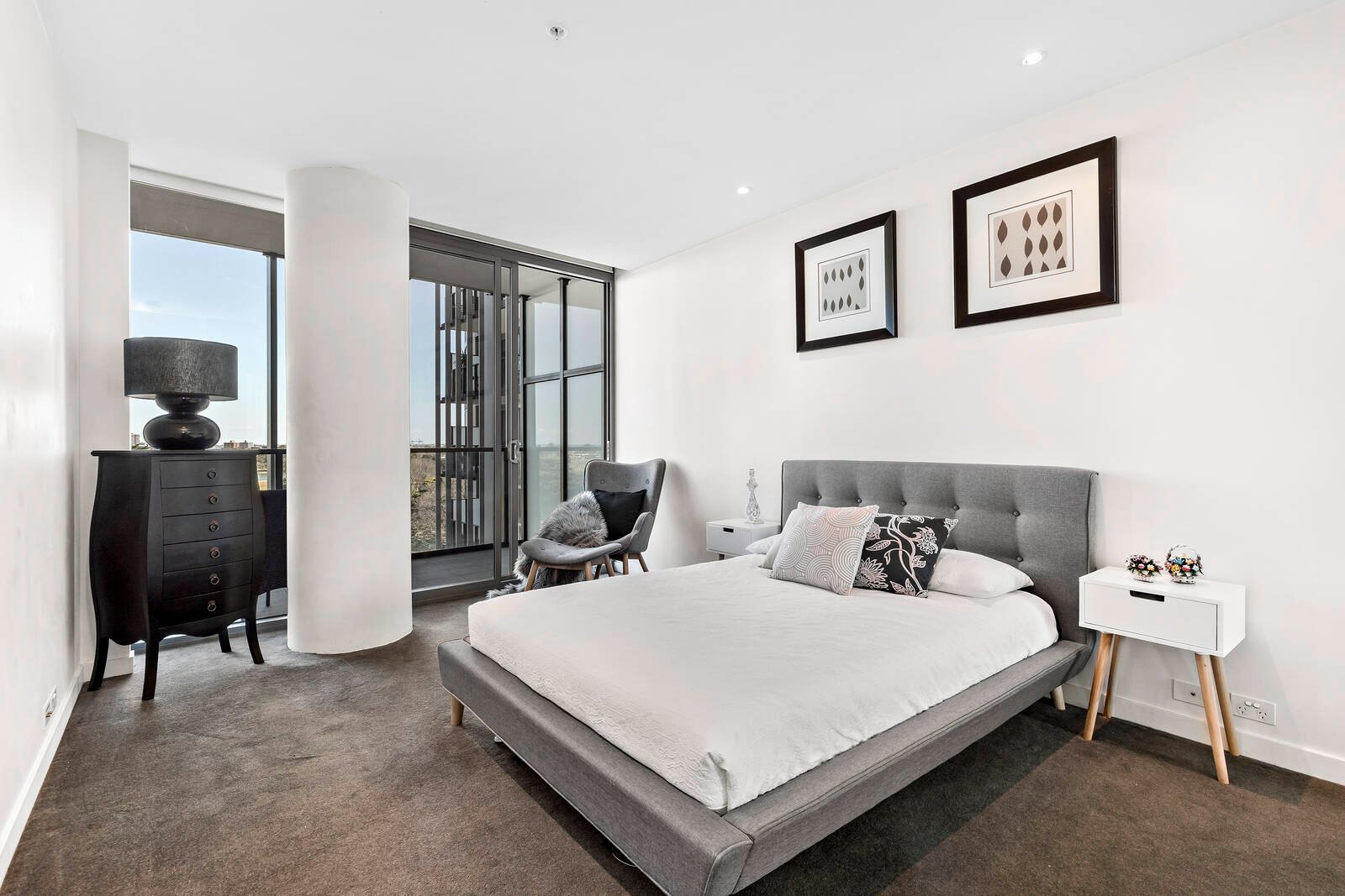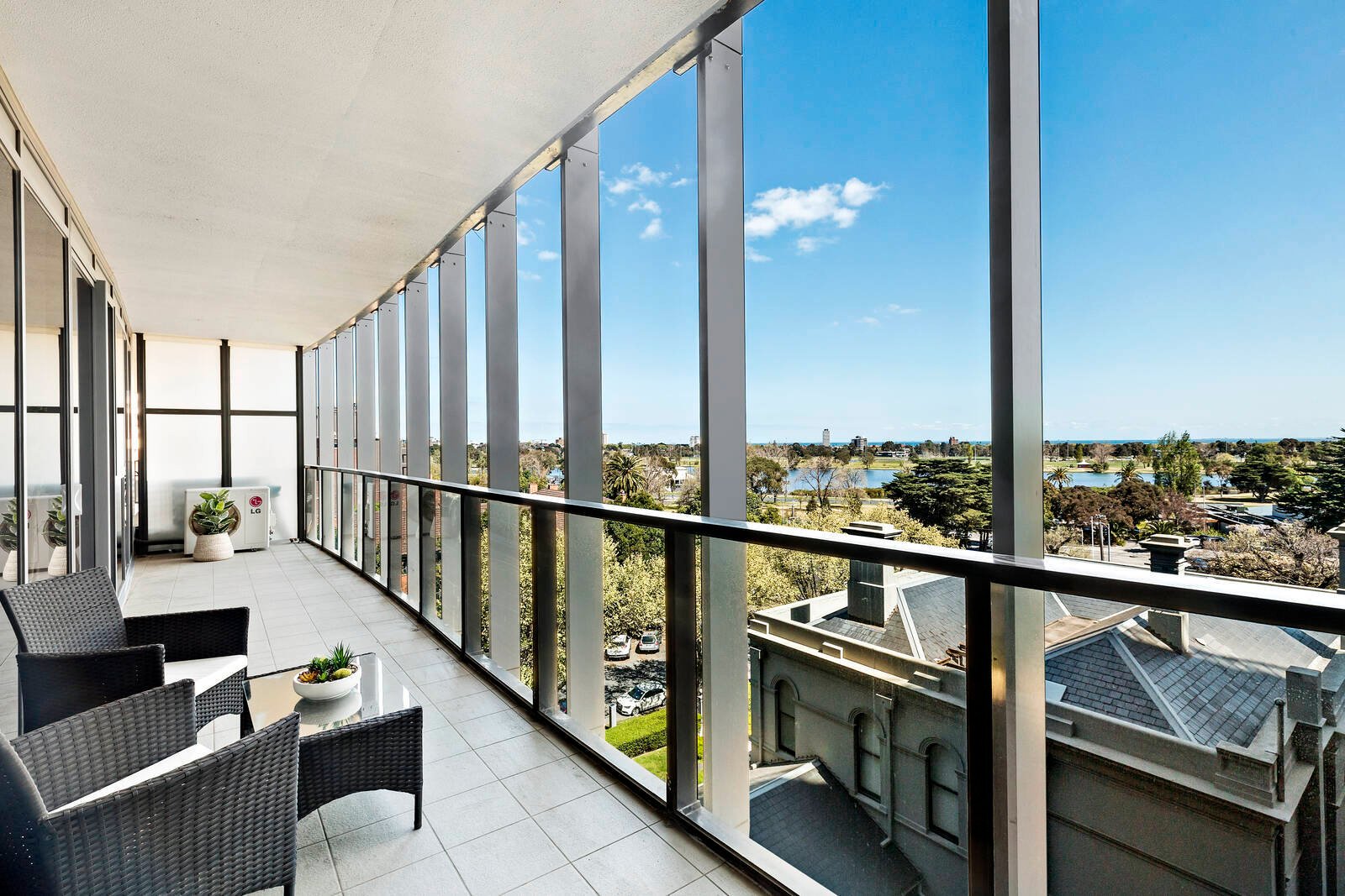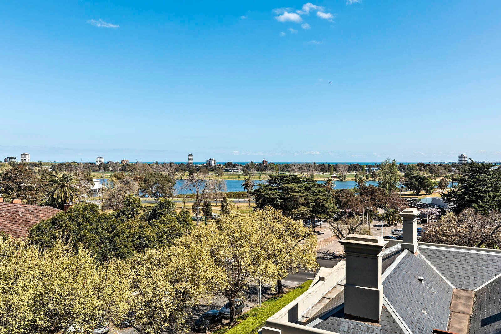 Spectacular, never to be built out water views are equally matched by a renowned luxury address and a brilliant lifestyle location in this fabulous two-bedroom apartment positioned in exclusive Grosvenor On Queens. Set back from Queens Road in leafy Beatrice Street, luxe hotel style surroundings play host to this exciting City base or investment, adding excellent resident amenities and fabulous walking convenience to its long list of lifestyle advantages. Dazzling, front and centre outlooks over Albert Park Lake, the Grand Prix Track and the twinkling waters of the Bay create an exceptional context for wide, open living spaces, a flawlessly presented stone kitchen and an expansive undercover terrace clearly designed for memorable indoor/outdoor entertaining. Two inviting bedrooms with BIRs also share the views, the oversized main enjoying its own private access to the terrace. Other highlights include a spacious bathroom with excellent storage, European laundry, reverse cycle heating/cooling, video intercom security, basement parking and resident amenities such as an indoor pool, gym and on-site building manager. Stroll to an endless variety of cafes and restaurants, iconic Chapel, Greville and Fitzroy Streets, the Prahran Market, Albert Park Golf Course, tennis clubs, beautiful Fawkner Park, the Alfred Hospital, trams to CBD, Royal Botanic Gardens and Arts Precinct, the list is endless!