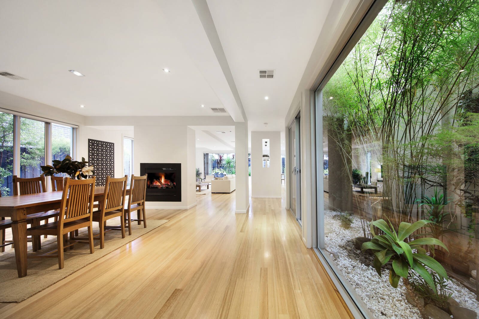 The design is inspired with a glorious light-well courtyard and unique 2-way gas log fireplace that divides spacious living and dining zones.
