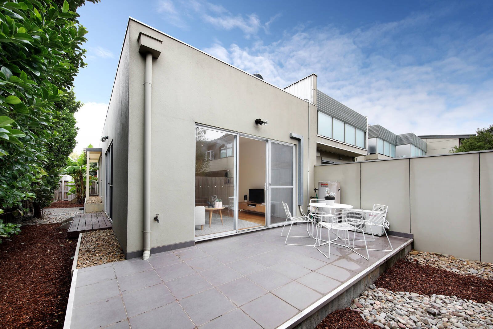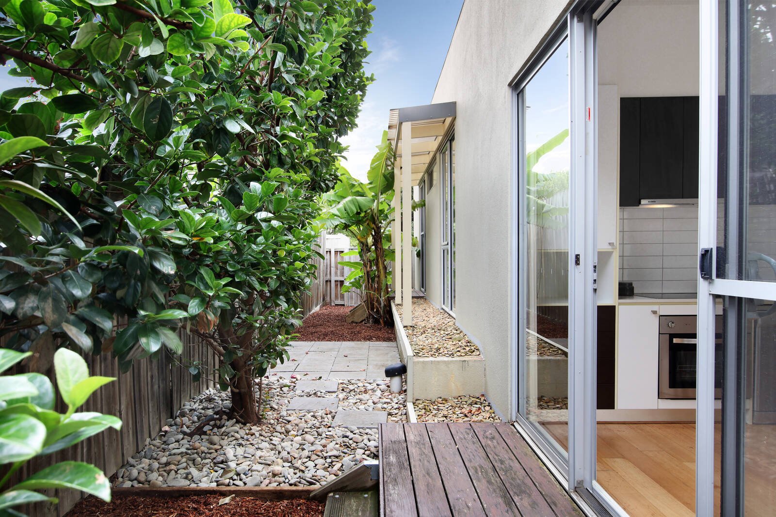 The stylish kitchen (stainless steel appliances) and sun-soaked living/dining zone unfolds outdoors to a secluded terrace and wrap-around courtyard, whilst 2 robed bedrooms share an immaculate bathroom.
