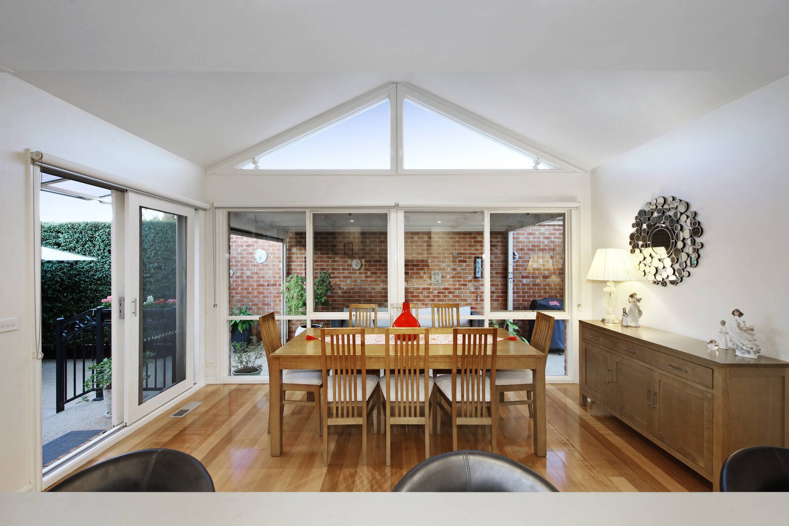 A meticulously maintained indoor-outdoor oasis, an abundance of natural light and timber floors filter through a refined lounge, to a premium kitchen featuring stone surfaces, mirror splashback and adjoining dining area lying beneath high cathedral ceilings.