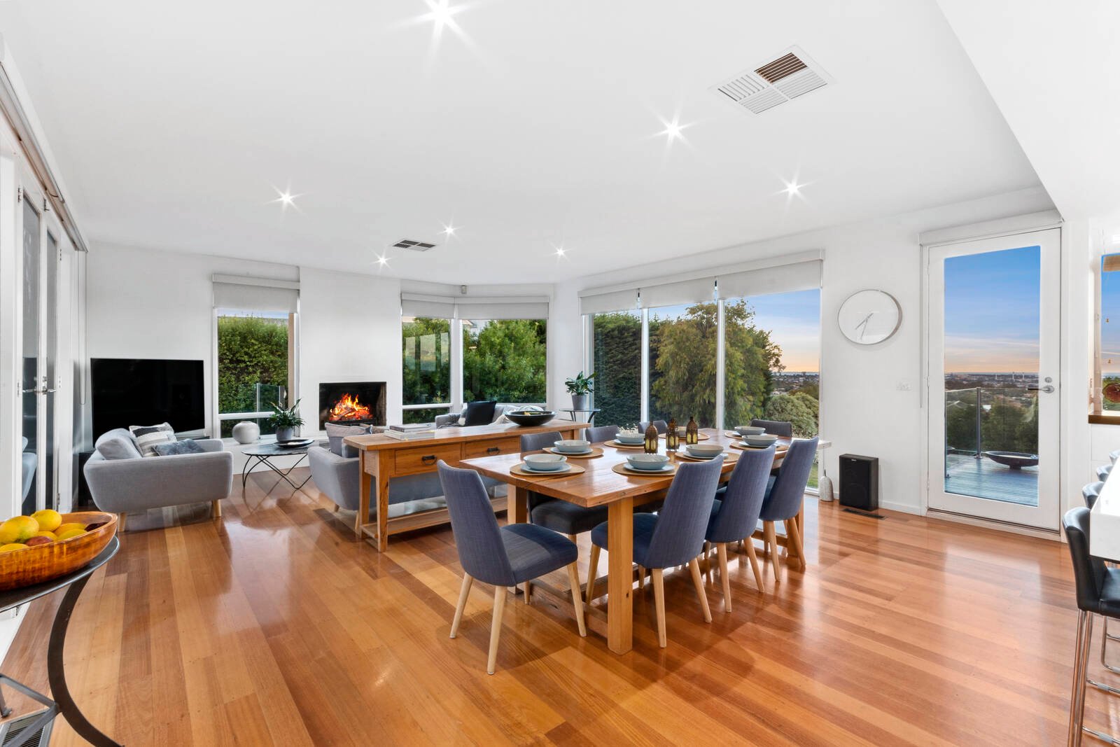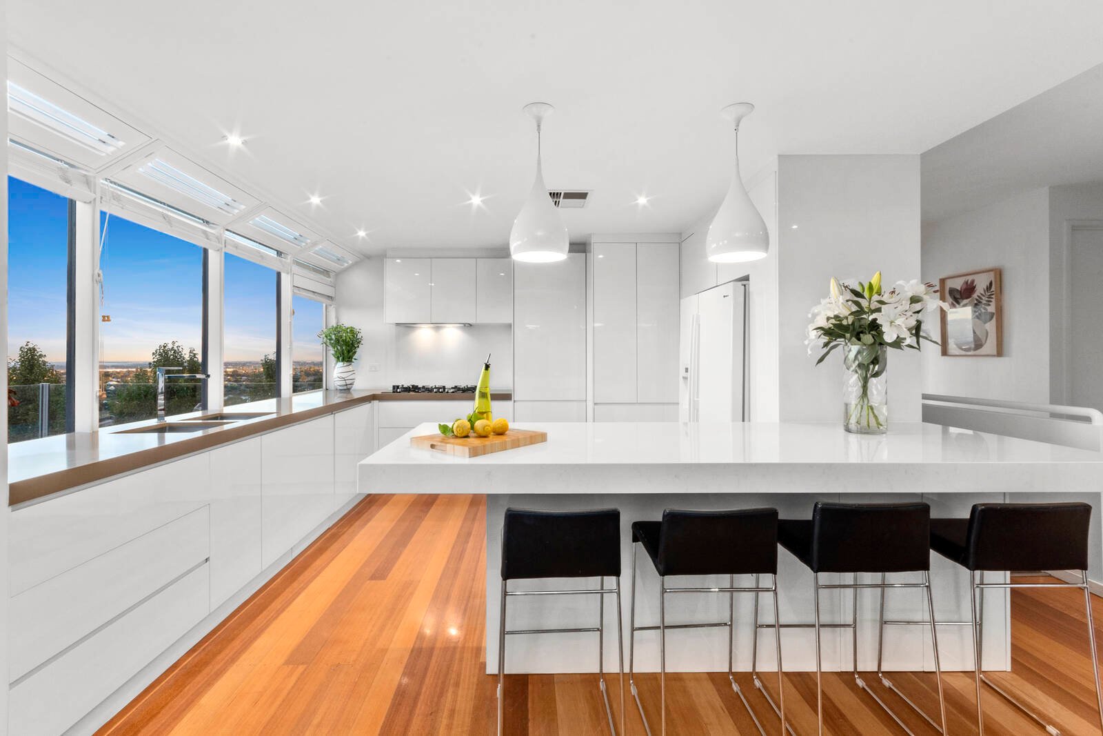 The enchanting gardens impress at first sight and create a wonderful sense of privacy around the entire property. Inside, high ceilings and Tasmanian Oak floorboards enhance the light-filled interiors. Both the open plan living zone and formal lounge/dining area are graced with stunning views and an open fireplace. The kitchen exudes modern elegance with clean-lined cabinetry, a breakfast bar with marble-look stone benchtops, and quality appliances (Bosch double wall oven, Siemens 900mm gas cooktop and integrated dishwasher).