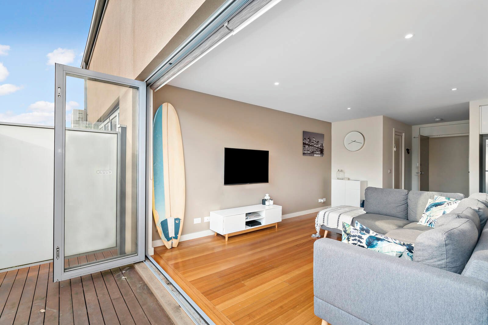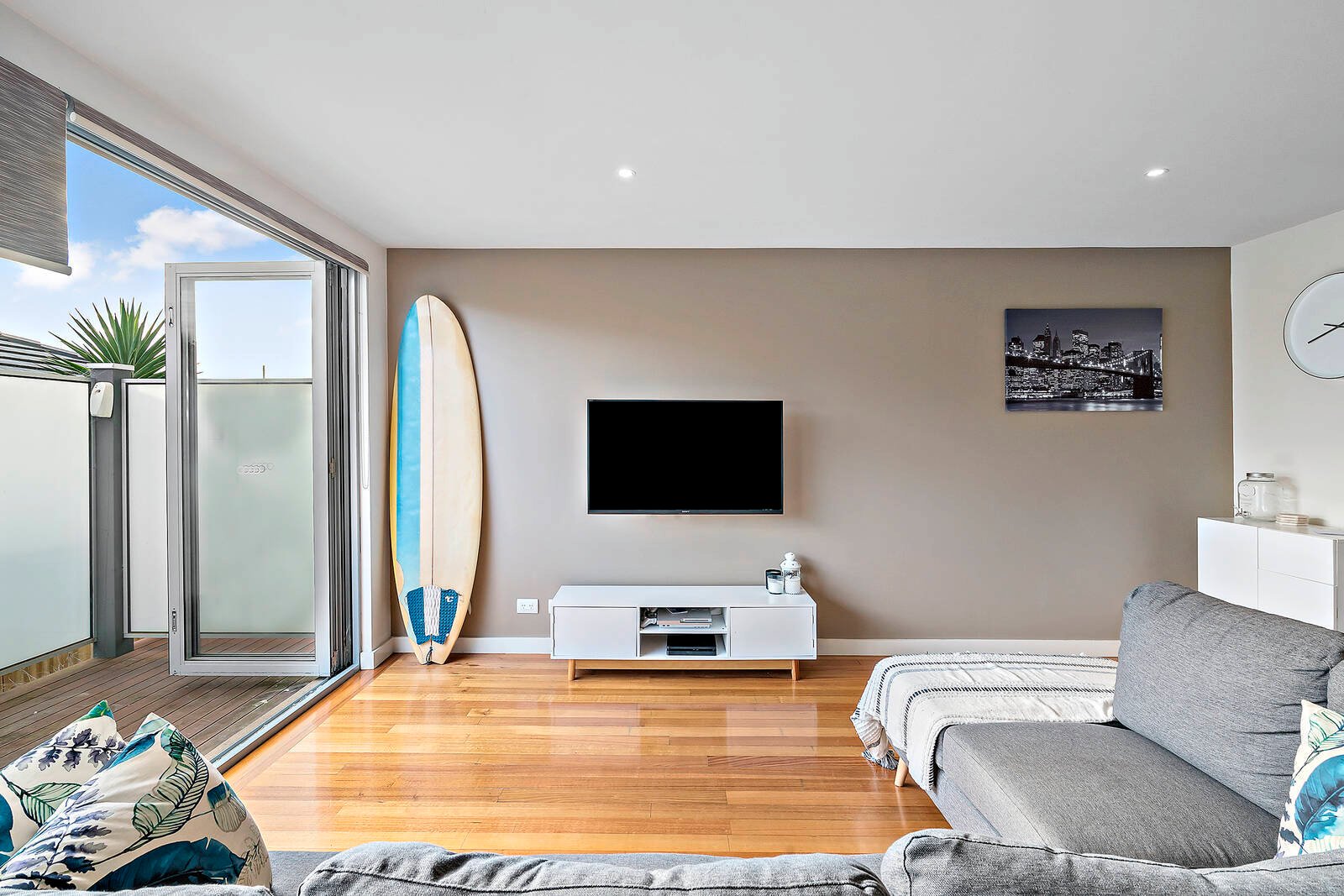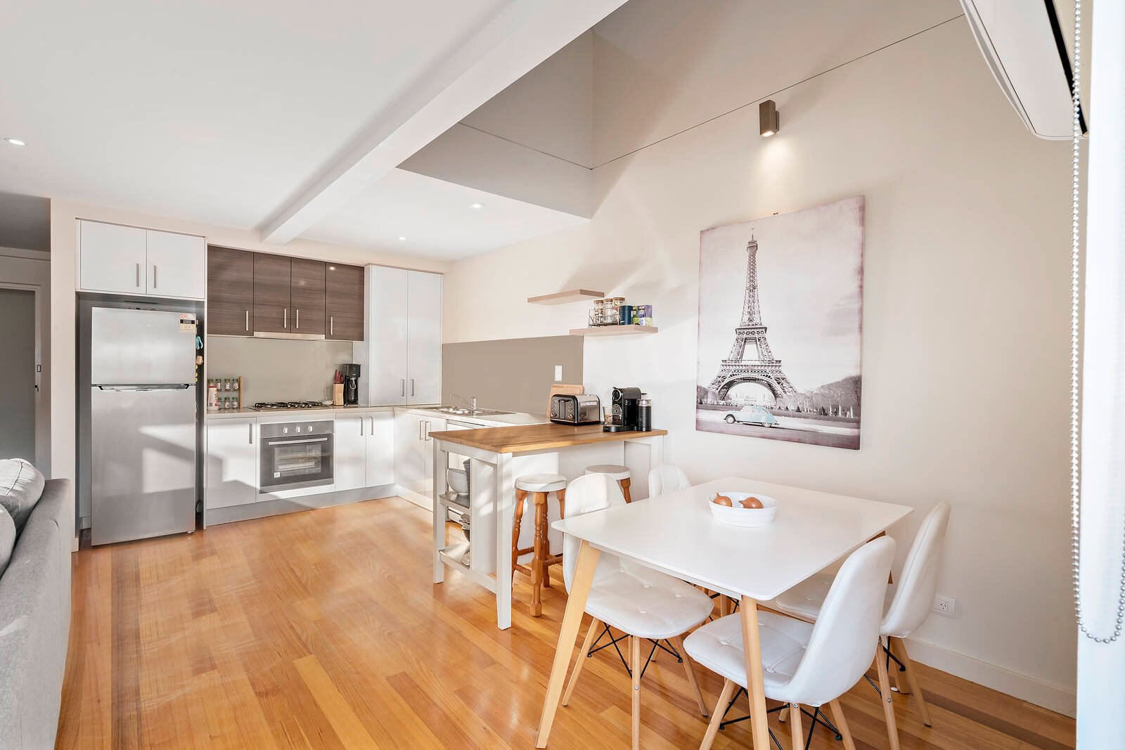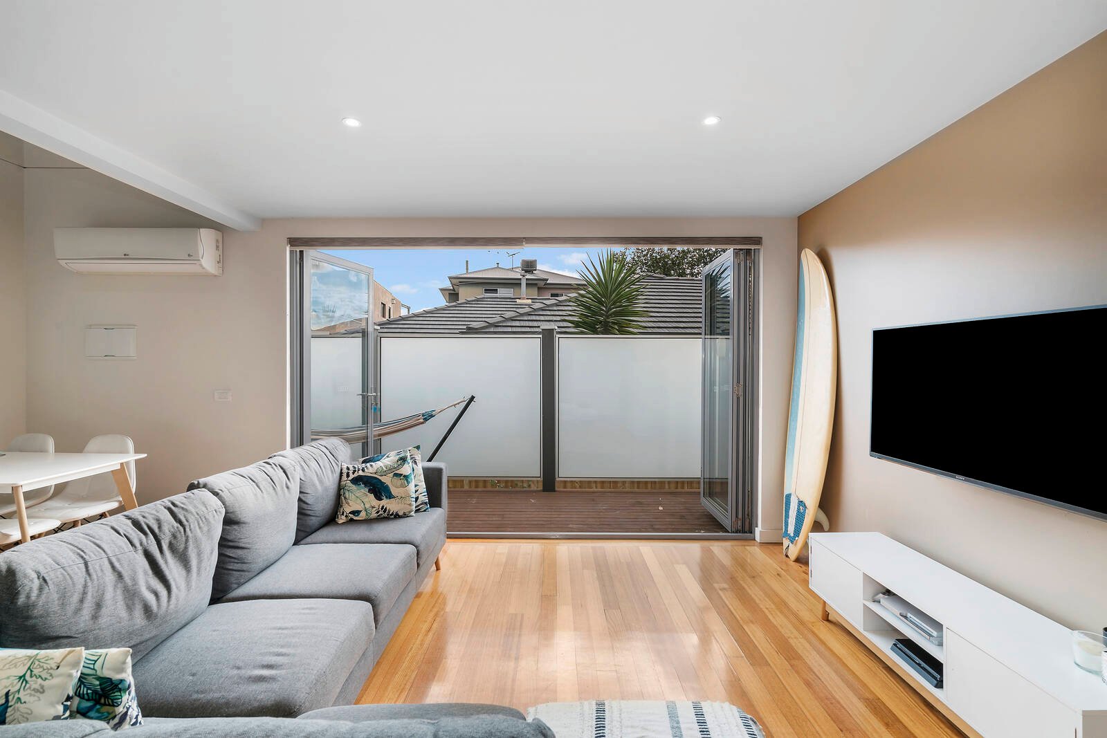 Positioned in a coveted lifestyle locale where you’ll have your feet on glorious stretches of golden sand within a leisurely 4-minute (approx.) stroll from your doorstep, this modern two-bedroom double storey apartment offers the ultimate in low-maintenance living. Cleverly designed to embrace natural light with soaring ceilings and skylights, alongside secure intercom entry and the comfort of a downstairs powder room, this well-proportioned coastal abode will be sure to impress. Stunning polished timber floors greet you on arrival, leading you to a stylish open plan living and dining zone, contemporary gourmet stone kitchen, and a wall of stacking glass bi-fold doors which extends the space to a private sunny entertaining terrace. Upstairs reveals an essential study area to work from home, two spacious bedrooms with built-in wardrobes, and a sleek bathroom with separate shower and bath. Further inclusions are split system heating and cooling, full laundry and a basement carpark with storage cage. Situated just 350m (approx.) from the beach and walking distance to vibrant cafes and the train - your dream lock and leave beachside lifestyle awaits.