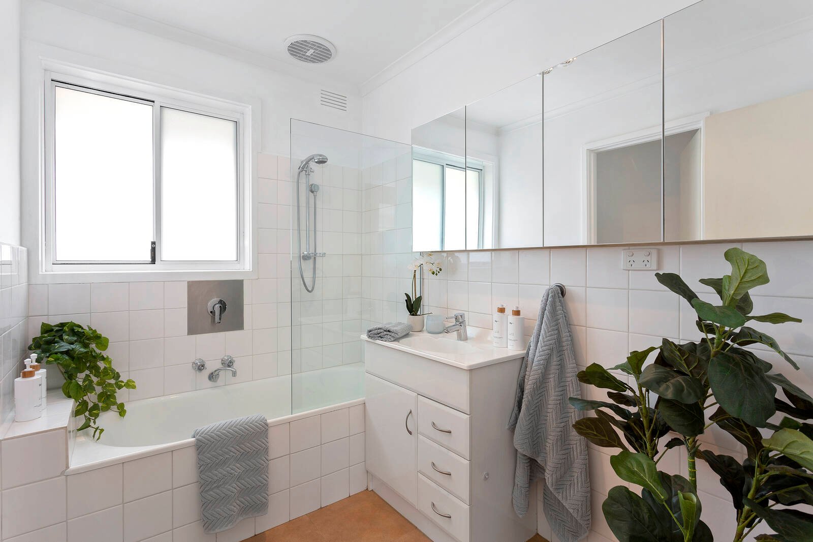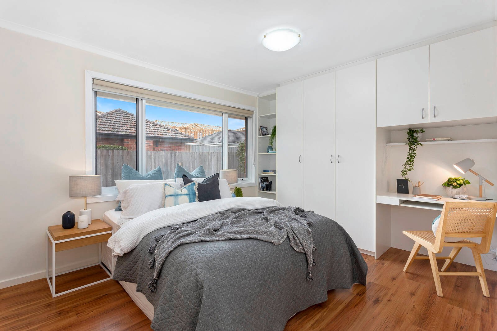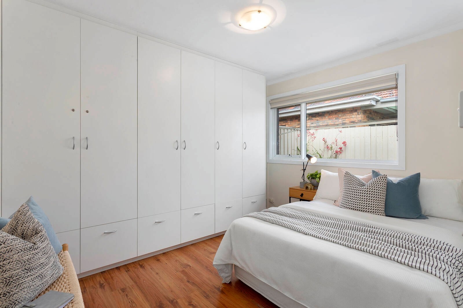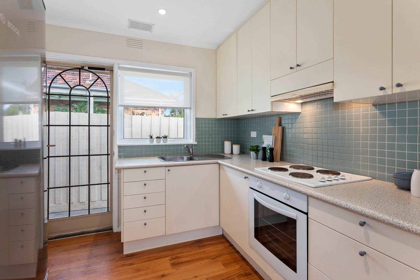 Lighting up with living-dining facing north with a lush green outlook, this impeccably presented unit shines with double bedrooms – each with a wall of custom cabinetry including well-fitted robes, library shelving, even a work-from-home office area. Featuring a quality appliance kitchen with an abundance of custom cabinetry, and a stylish bathroom with frameless screening and a private WC, this reverse-cycle air-conditioned unit has endless storage (including a deep linen-press and a lockable outdoor store), great privacy with e-screen holland blinds, the added climate-control of double-glazed windows, and the ease of a gas-connected Bosch instant hot-water.