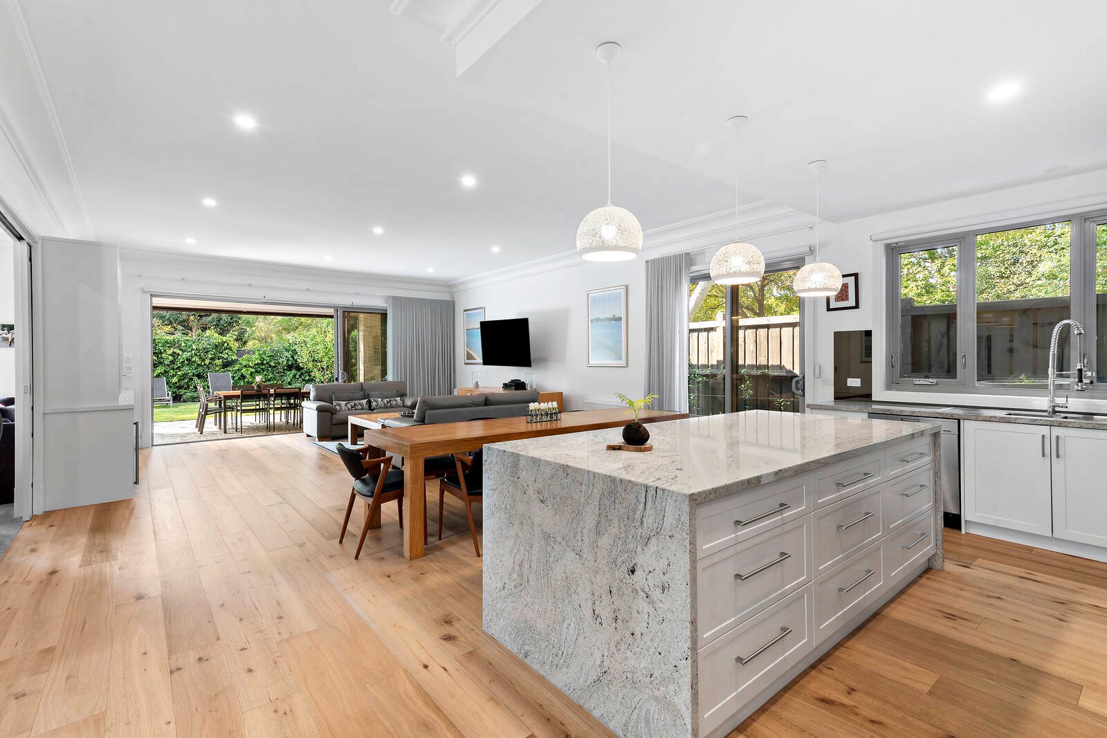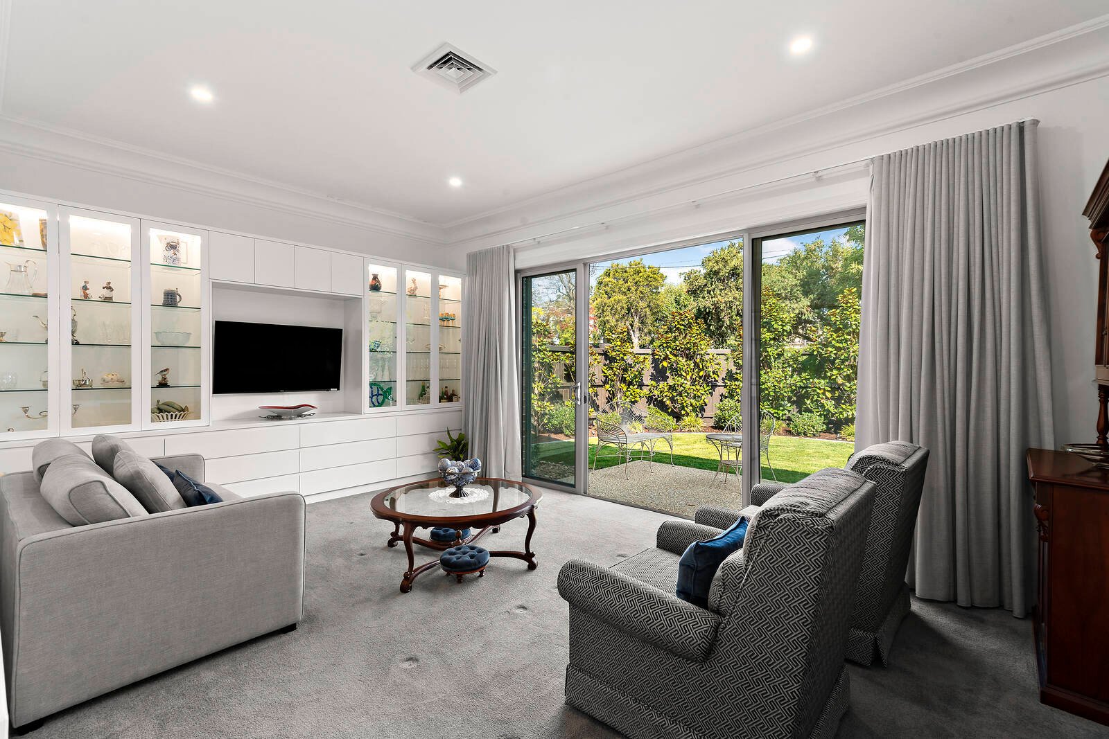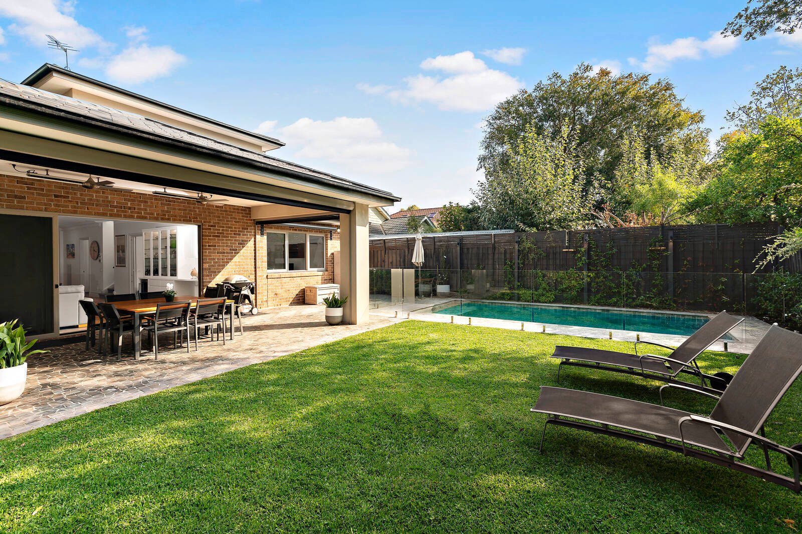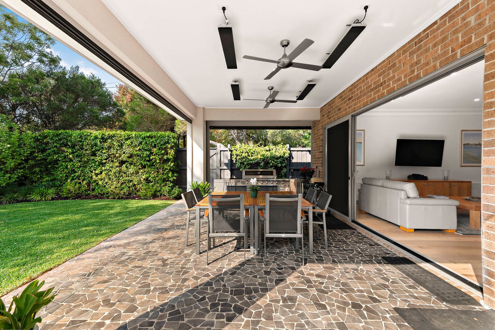 Streaming with northern light, the open-plan living and dining domain, and separate lounge room enjoy lovely aspects across the private rear gardens with solar heated swimming pool. Sliding doors open the living space out to a large covered alfresco entertainment terrace with ceiling fans and overhead heating, and stunning BBQ kitchen set amidst beautiful manicured gardens.