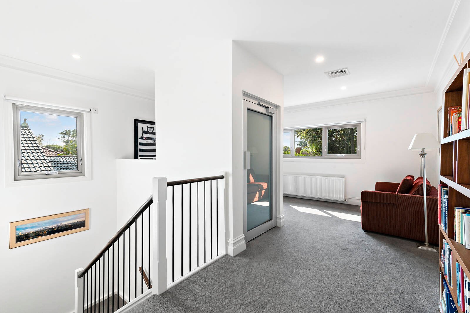 The premium quality is immediately evidenced by European oak floors, high ceilings, a lift, multiple living zones, and generosity of space. The wide entrance hall flows through to a formal lounge room with bespoke cabinetry for refined entertaining. From here, glass sliders open out to a picturesque courtyard garden offering privacy and tranquillity.