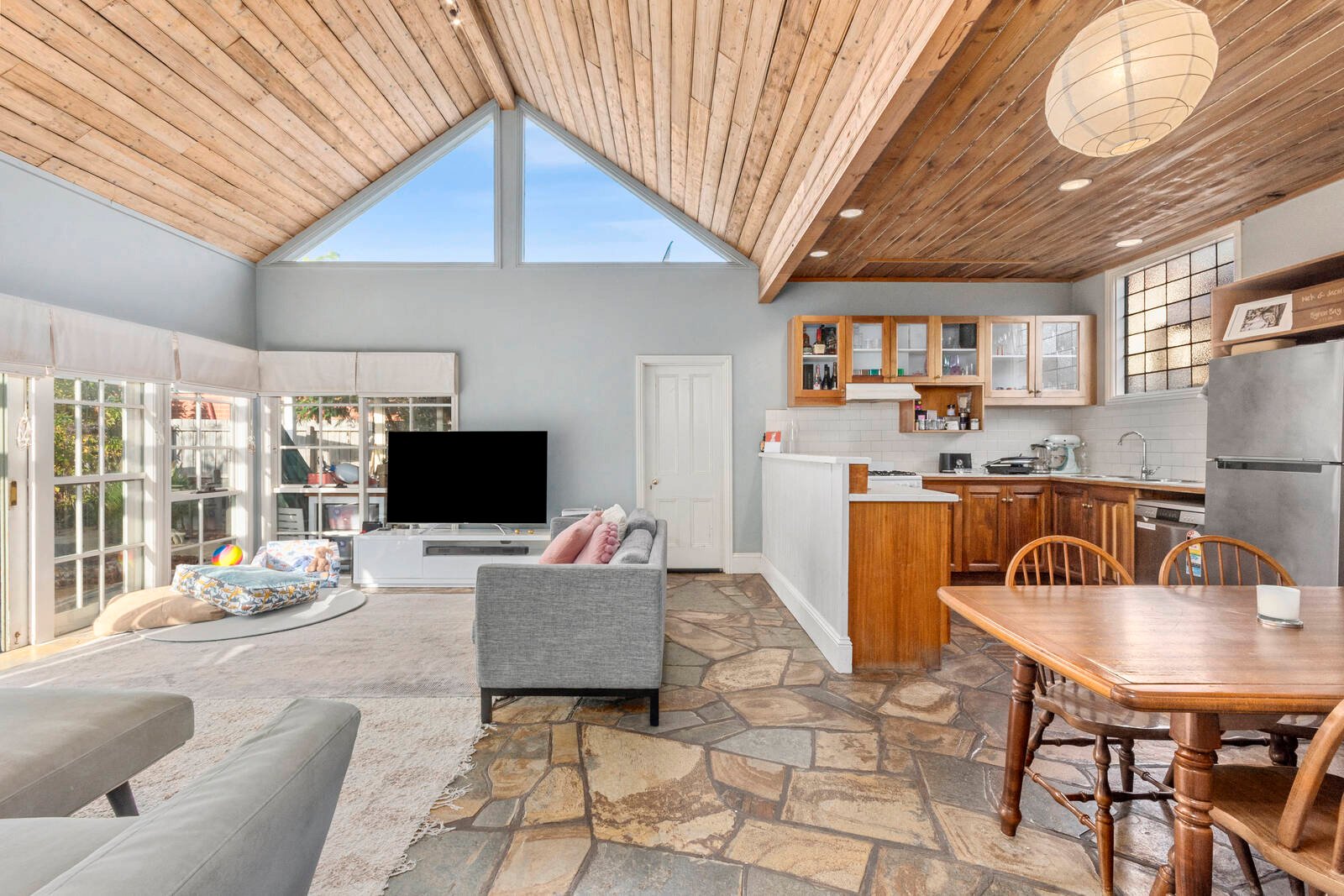 Open plan in design attracting light filled spaces throughout the kitchen, dining and living areas.