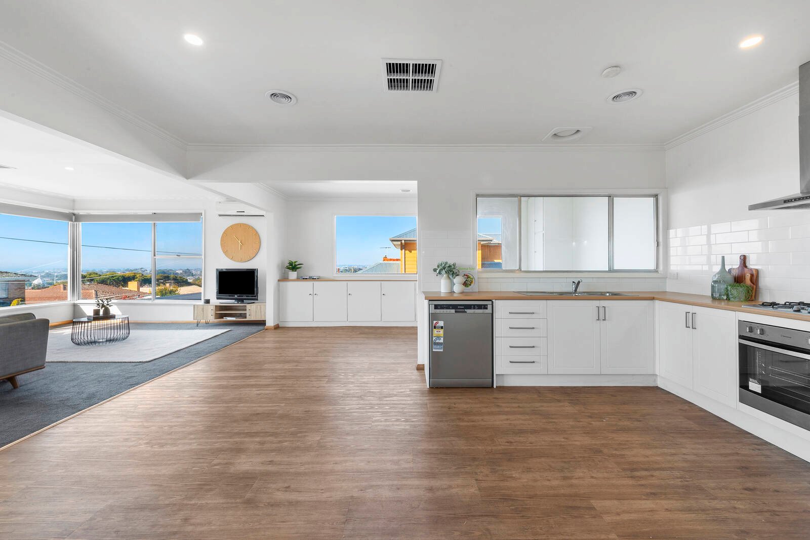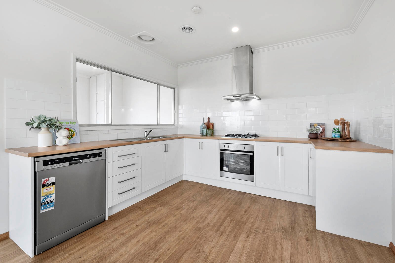 - Updated kitchen offers walk in pantry, dishwasher, 4 burner gas cooktop with 600mm fan forced oven.