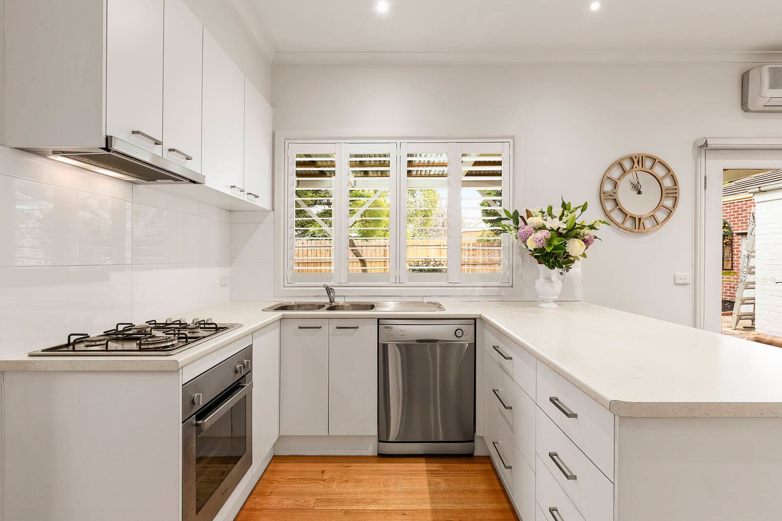A sanctuary of sophistication and serenity, this sensational, sun-soaked three bedroom plus study nook residence combines beautifully curated interiors with a spacious, free-flowing single-level layout in a delightful, west-facing rear garden setting. Introduced by low-maintenance gardens, an inviting entrance hall reveals polished floors flowing past an elegant lounge room with plantation shutters for refined living by the open fireplace, and a separate dining room, before arriving at the open-plan kitchen / family living domain.