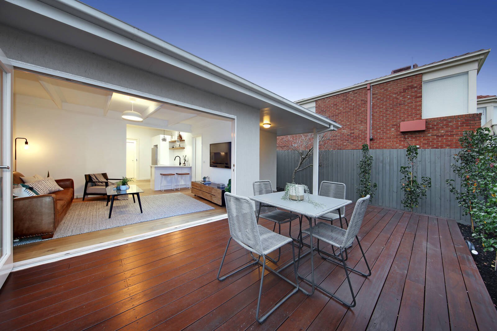 Showcasing an elegant minimalism throughout its meticulously renovated spaces, beautiful natural light and plantation shutters add warmth to a dining room (OFP), contemporary skylit kitchen featuring Caesarstone surfaces and Asko/Bosch appliances and bright living room with bi-fold doors opening to a private entertaining deck.