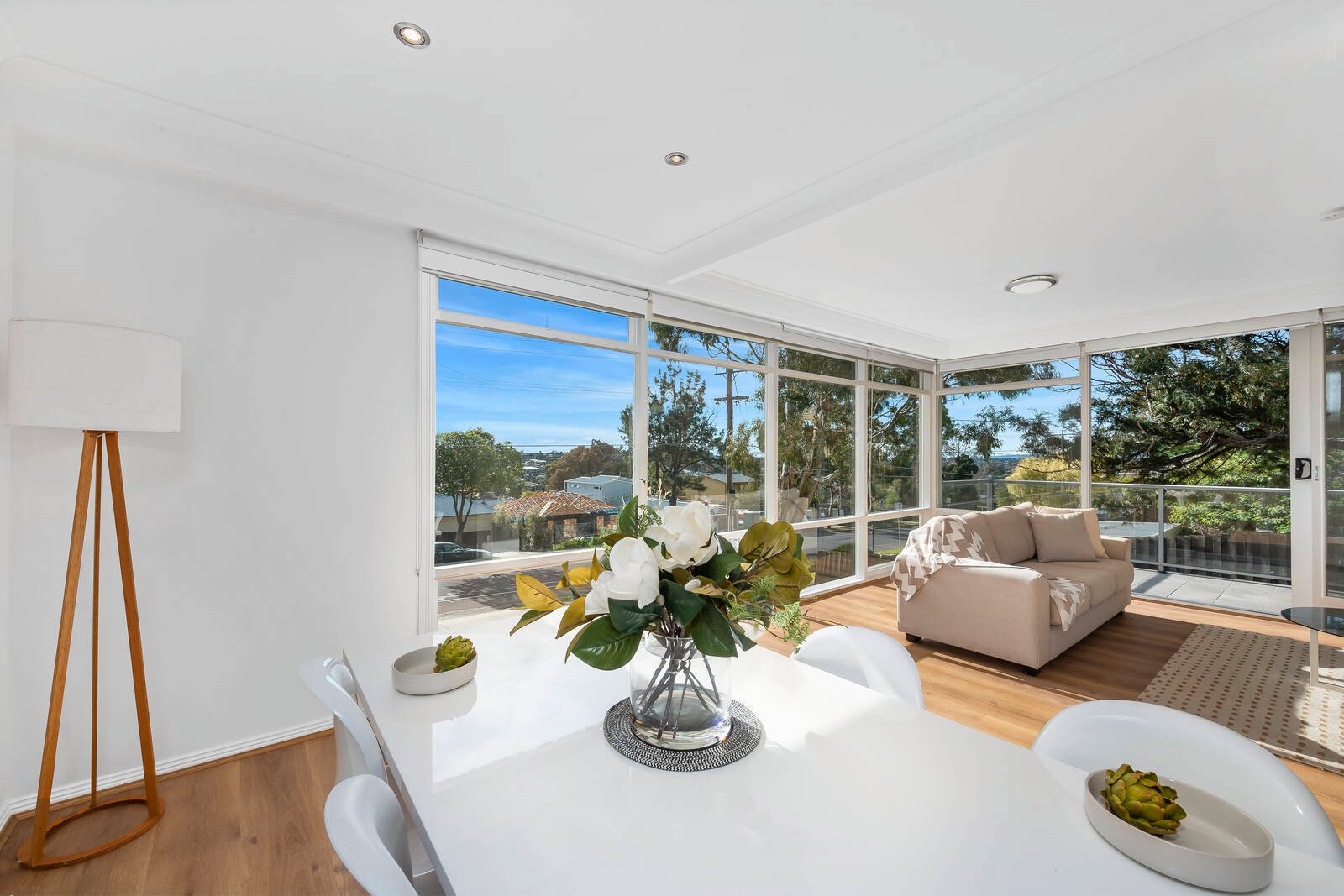 Set amongst established landscaped gardens, the contemporary façade forms an impressive introduction to the home and on entry, fresh white interiors, timber accents and an abundance of natural light offers a warm welcome. The main living area consists of an open plan-north facing kitchen, dining and lounge with huge windows providing a picturesque outlook and creating a natural work of art. Glass sliders lead out from the living room to a long balcony, providing a sensational elevated position to enjoy a coffee in the morning sun or wind down of an evening.
