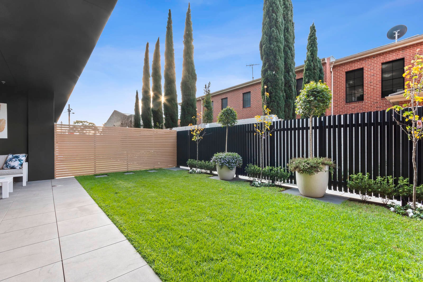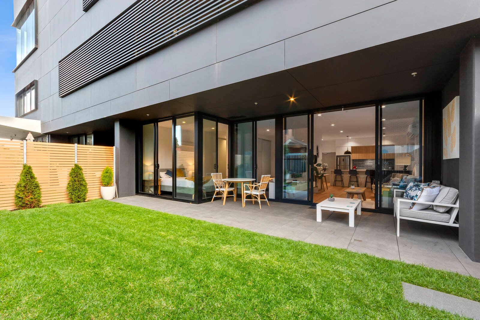 Large glass sliders from the living allow for a seamless indoor/outdoor flow, leading out to a paved undercover al fresco and lush north-facing garden, offering a tranquil space to relax or entertain. Enjoy stepping onto the lawn and feeling the grass between your toes, a rare indulgence for apartment living!