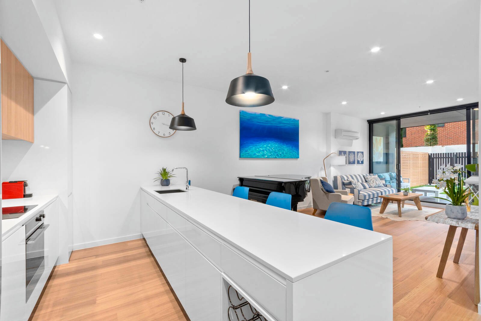 Situated on the ground floor, the apartment offers convenient and secure access. On entry, 2.9m ceilings, crisp white interiors, timber accents and floor-to-ceiling north-facing windows combine to create a striking introduction to the home.