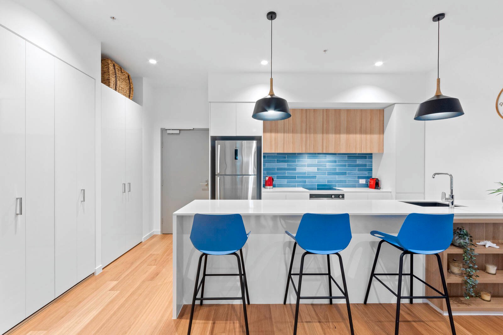 The main living area consists of an open plan kitchen, dining and lounge area featuring stunning Blackbutt timber floors. The magnificent kitchen includes stone bench tops, stainless steel appliances, ample cupboard and bench space, beautiful feature tiled splash back, modern pendant lighting and is perfectly positioned to overlook the dining, living and out to the alfresco for easy everyday living and effortless entertaining.
