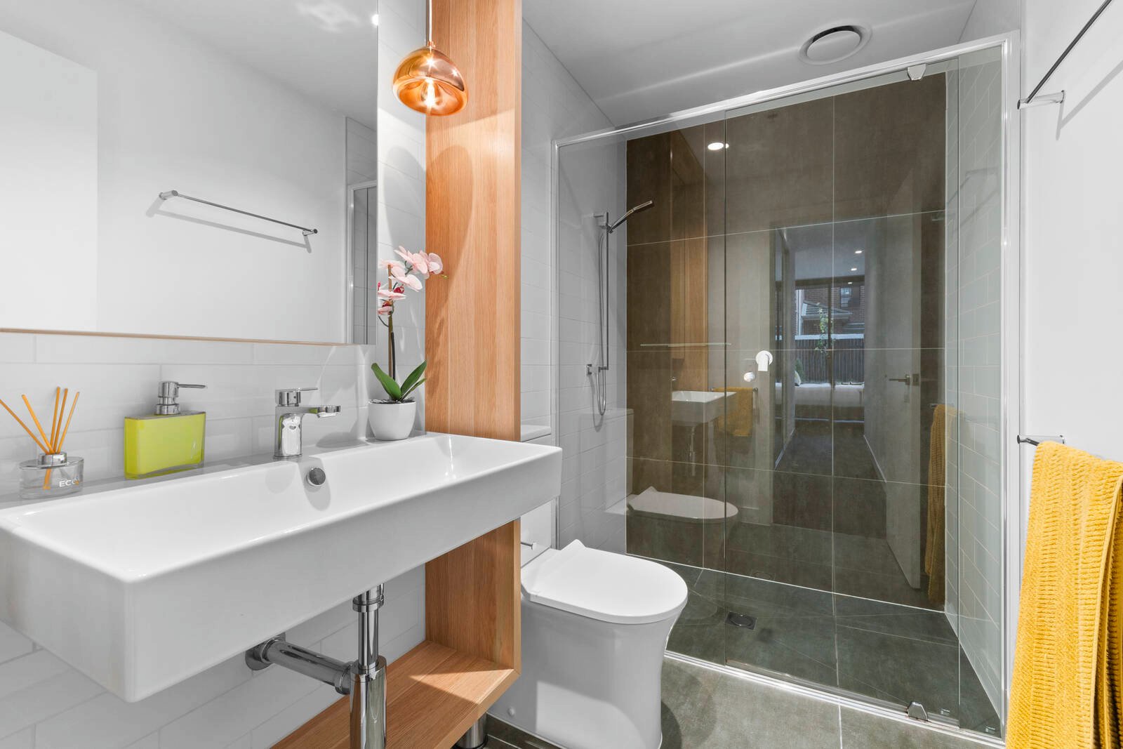 Comprising two bedrooms, the master is luxurious in size, includes expansive built-in robes, a picturesque garden outlook and ensuite with floor to ceiling tiles, spacious shower and designer vanity with pendant lighting. Bedroom two also includes built-in robes and is serviced by a central bathroom which continues in the high-end theme of the home.
