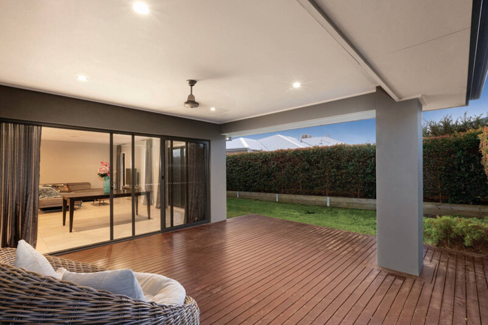 The open plan living area with an abundance of open air steps out through stacker sliding doors, providing a seamless flow, onto the huge decked undercover alfresco dining. All of this spills out to the very private, low maintenance well established gardens.