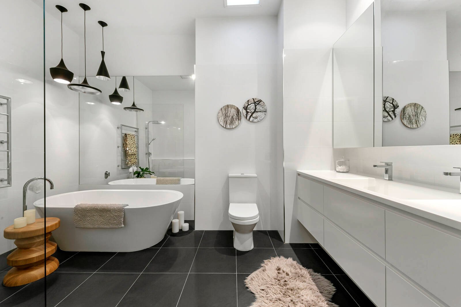 All bedrooms are carpeted and come with BIRs. The master bedroom is spacious with a bay window overlooking the front garden, an amazing WIR and an impressive ensuite. The perfect parental oasis! Off the second hallway, conveniently located is three of the bedrooms and the luxurious main bathroom with its freestanding bath with mirror behind and stylish pendant lights, shower and long vanity with ample storage space. There is also a powder room located near the kitchen and living area.