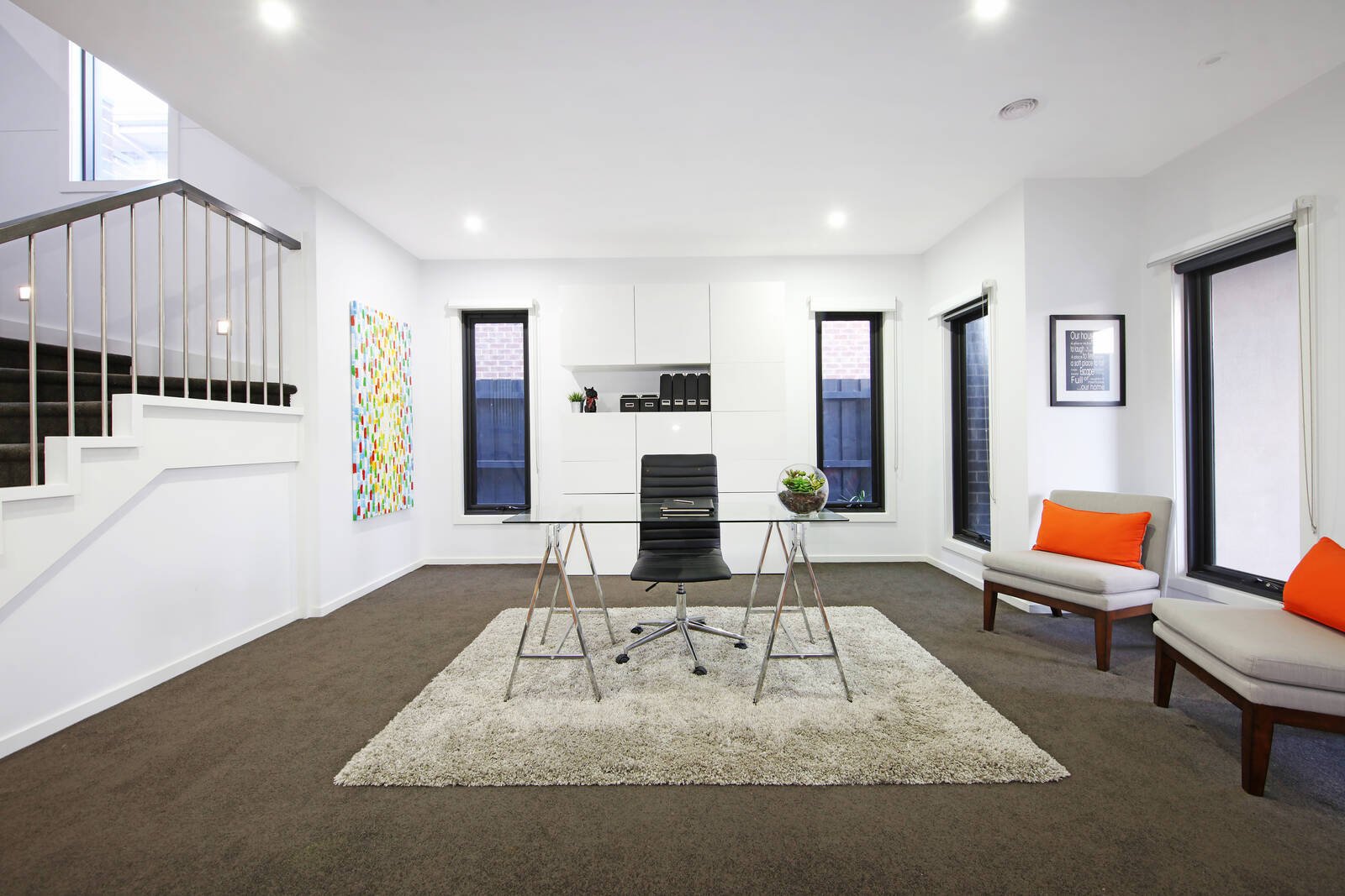A large home office (ideal to work from home) precedes a spacious living room with gas log fireplace, and vast open-plan family/dining domain soaked in northern sun and featuring bi-fold doors that extend outdoors to a covered alfresco and private manicured gardens – creating a seamless flow for indoor-outdoor entertaining.
